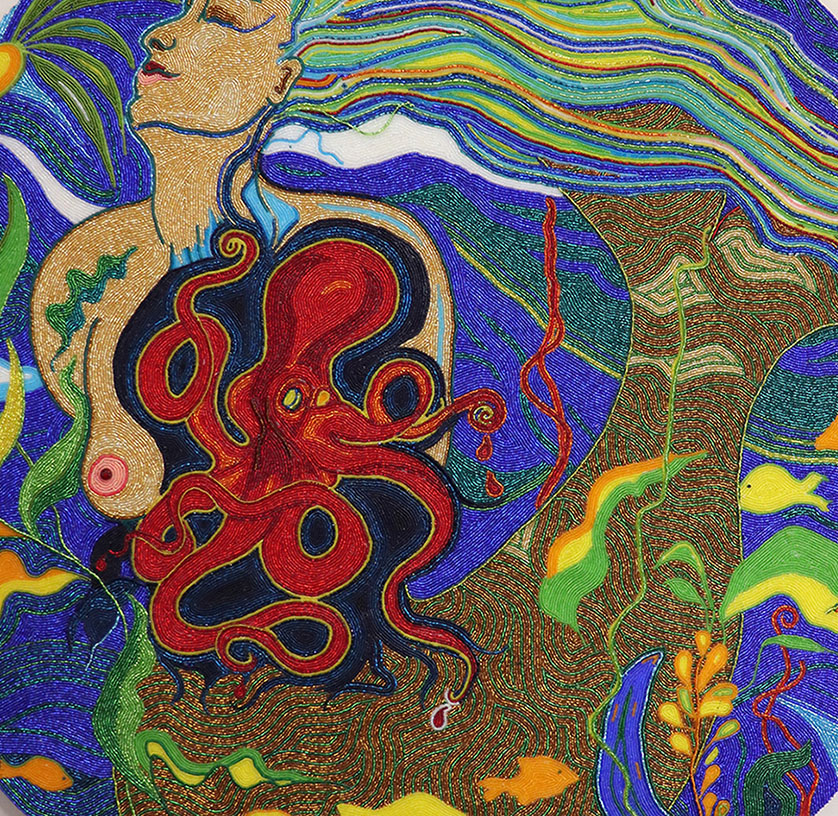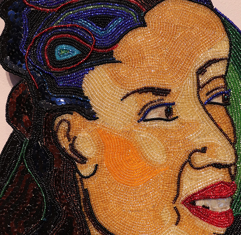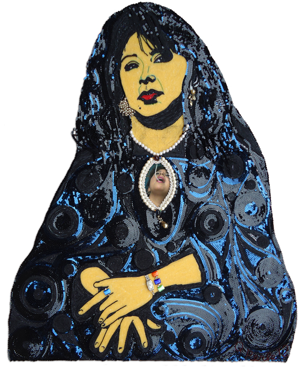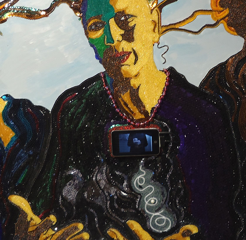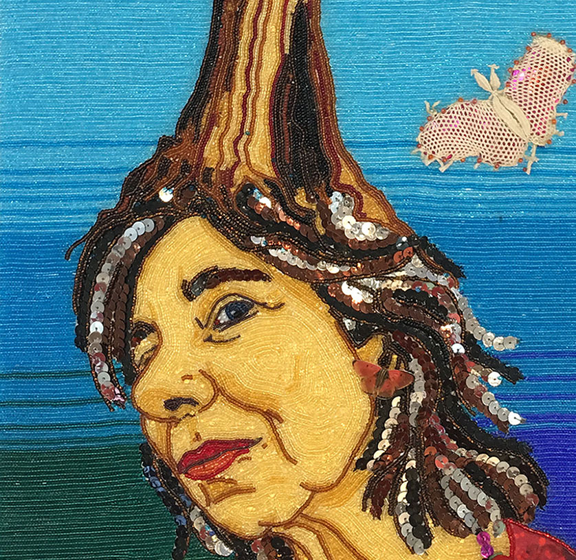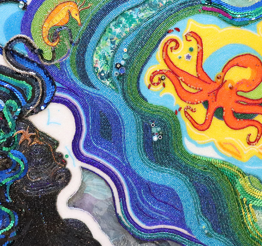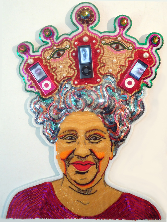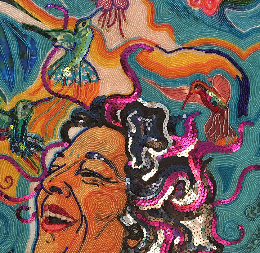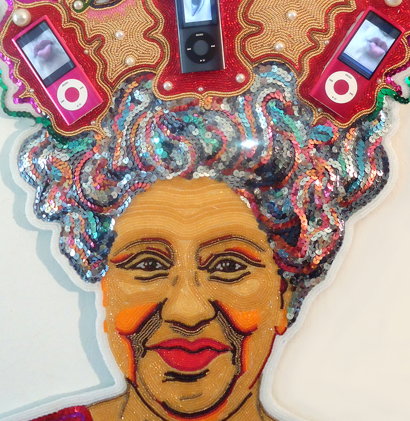 My Octopus Heart, beads and sequins on wood panel, 36” tondo, 2021 I Am Not Afraid, beads, sequins, fabric, trim on wood panel, 6” x 8”, 2025Self Defense, beads, sequins, mica on styrene, 48” x 39”, 2018 Oya, beads, sequins, mica on styrene, 24” x 30”, 2018Shekere Play, beads, sequins, found jewelry on styrene, 60” x 40”, 2019Baobab, beads, sequins, found jewelry on styrene, 22” x 11”, 2020 Sequoia, beads, sequins, found jewelry, fabric on styrene, 22” x 11”, 2020She Laughs, beads, sequins, found jewelry on wood panel, 20” x 16”, 2020Pearls. God Nourishing the Earth With Her Tears, beads, found embroidery and jewelry on board, 2017Pearls. God Nourishing the Earth With Her Milk, beads, sequins, found embroidery and jewelry on board, 2021Mermaid and Octopus, beads, sequins on styrene, 20” x 60”, 2020Dream of Dreams, beads, sequins, found jewelry on styrene, 31” x 37”, 2014The Wave, beads on wood panel, 16” x 20”, 2017Quiero Verte, beads, sequins on styrene, 26” x 24”, 2012Blue Asma, beads, sequins on styrene, 10” x 8”, 2019Untitled (Take’), beads, sequins on styrene, 10” x 8”, 2019Poem Teller: a beaded and sequined oracle speaks poems from a painting. Beads, sequins, acrylic, iPod video on styrene, 2013. Poem Teller (6 minute excerpt)Girl With Crown, beads, sequins, rhinestones, iPod nanos, 20” x 16”, 2013Mona Lisa, beads, sequins, vintage jewelry on polystyrene, video, 38” x 31”, 2012Alhambra, beads on styrene with iPod nano/slideshow, 8″ x 8″, 2012Blue Kisses, 2012, beads, vintage jewelry, iPod nano/video on styrene, 7″ x 3″ (pendant), plus chain Red Kisses, 2012, beads, vintage jewelry, iPod nano/video on styrene, 7″ x 3″ (pendant), plus chainEye Palace, beads on styrene with iPod nano/video, 6 1/2″ x 8 1/2″, 2013Smoky Mirror, beads, sequins, vintage jewelry on styrene, 7″ x 9″, 2012Mirror Image, beads, sequins, vintage jewelry on styrene, 9″ x 8″, 2013Sometimes I Feel Like Sue Kreitzman, lino print on fabric, beads, sequins on styrene, 12” x 18”, 2015Sometimes I Feel Like Tyrone Henderson, lino print on fabric, beads, sequins on styrene, 12” x 18”, 2016Sometimes I Feel Like Lisa Curran, lino print on fabric, beads, sequins on styrene, 12” x 18”, 2016Sometimes I Feel Like Angela Rogers, lino print on fabric, beads, sequins on styrene, 12” x 18”, 2016