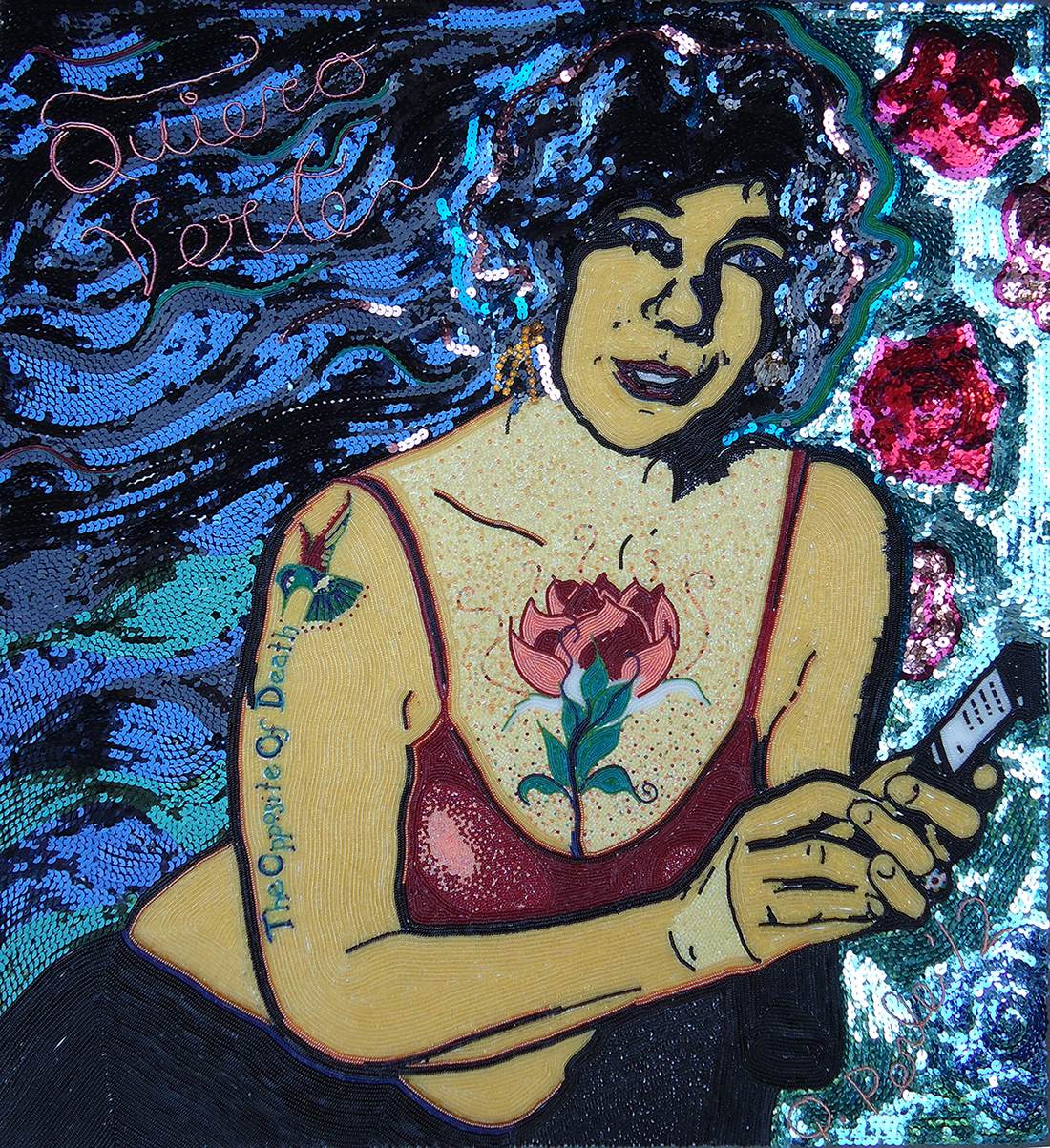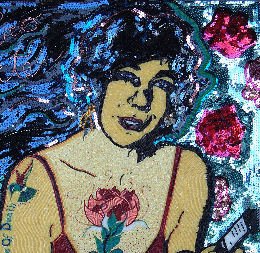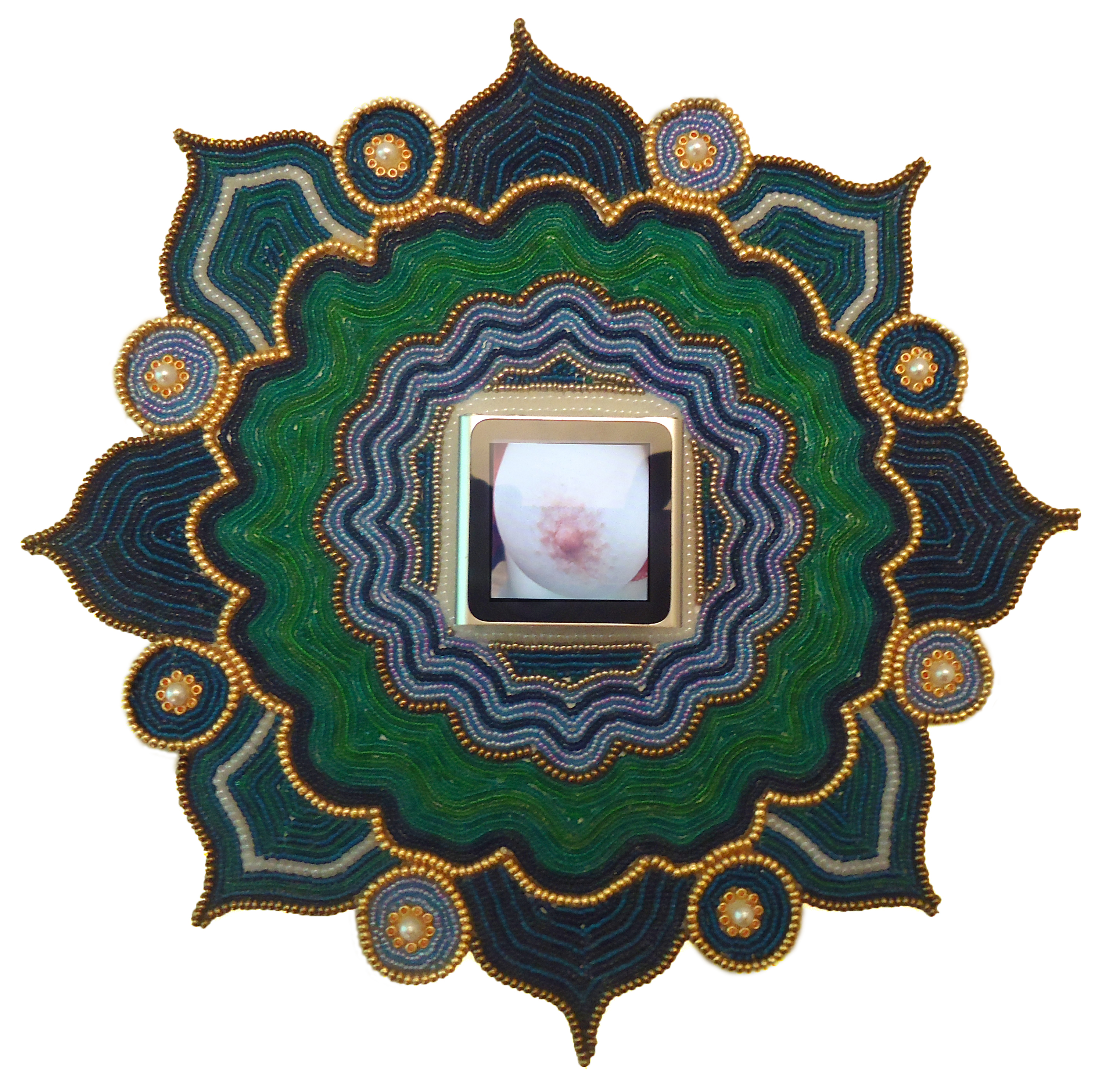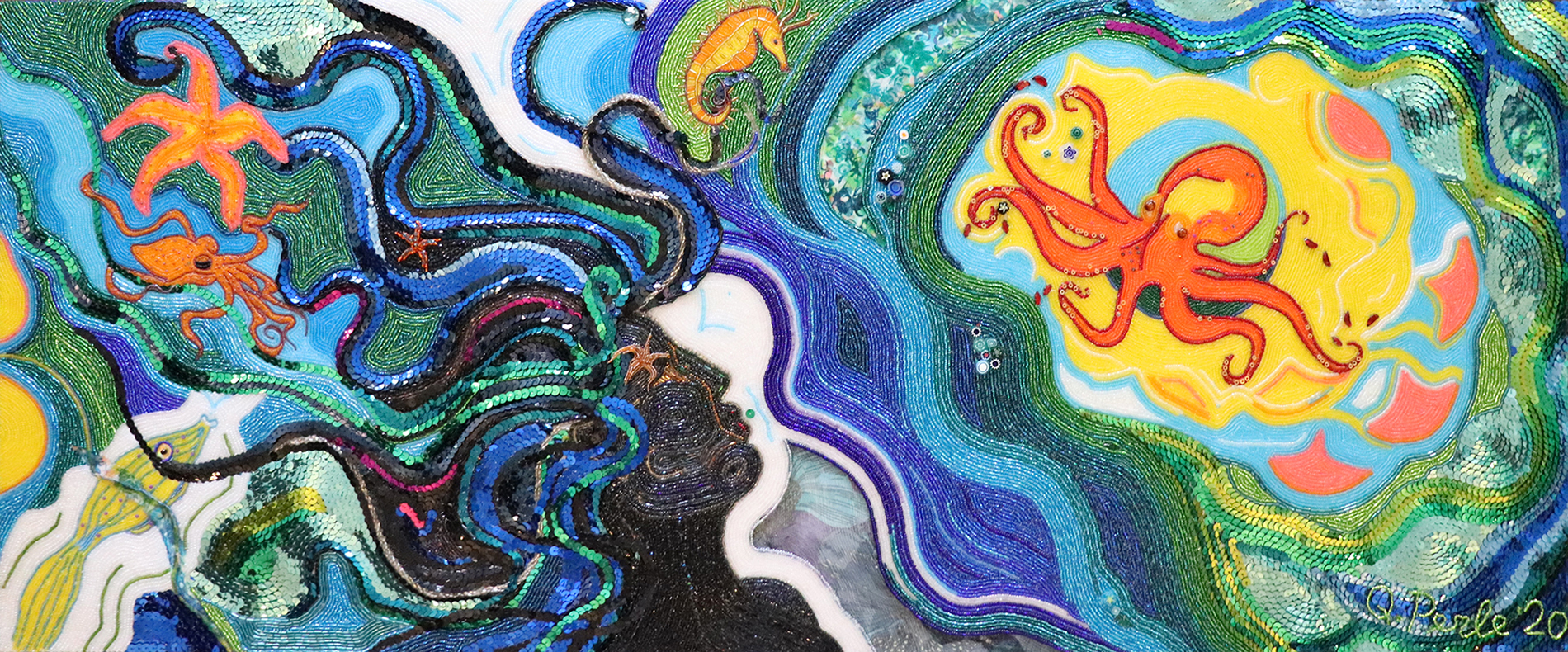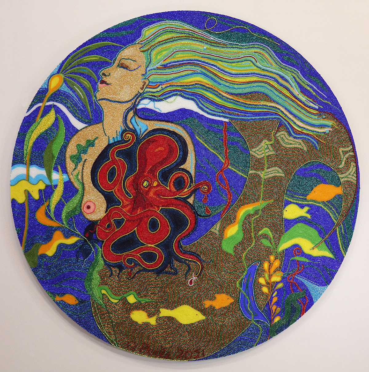 My Octopus Heart, beads and sequins on wood panel, 36” tondo, 2021 I Am Not Afraid, beads, sequins, fabric, trim on wood panel, 6” x 8”, 2025Self Defense, beads, sequins, mica on styrene, 48” x 39”, 2018 Oya, beads, sequins, mica on styrene, 24” x 30”, 2018Shekere Play, beads, sequins, found jewelry on styrene, 60” x 40”, 2019Baobab, beads, sequins, found jewelry on styrene, 22” x 11”, 2020 Sequoia, beads, sequins, found jewelry, fabric on styrene, 22” x 11”, 2020She Laughs, beads, sequins, found jewelry on wood panel, 20” x 16”, 2020Pearls. God Nourishing the Earth With Her Tears, beads, found embroidery and jewelry on board, 2017Pearls. God Nourishing the Earth With Her Milk, beads, sequins, found embroidery and jewelry on board, 2021Mermaid and Octopus, beads, sequins on styrene, 20” x 60”, 2020Dream of Dreams, beads, sequins, found jewelry on styrene, 31” x 37”, 2014The Wave, beads on wood panel, 16” x 20”, 2017Quiero Verte, beads, sequins on styrene, 26” x 24”, 2012Blue Asma, beads, sequins on styrene, 10” x 8”, 2019Untitled (Take’), beads, sequins on styrene, 10” x 8”, 2019Poem Teller: a beaded and sequined oracle speaks poems from a painting. Beads, sequins, acrylic, iPod video on styrene, 2013. Poem Teller (6 minute excerpt)Girl With Crown, beads, sequins, rhinestones, iPod nanos, 20” x 16”, 2013Mona Lisa, beads, sequins, vintage jewelry on polystyrene, video, 38” x 31”, 2012Alhambra, beads on styrene with iPod nano/slideshow, 8″ x 8″, 2012Blue Kisses, 2012, beads, vintage jewelry, iPod nano/video on styrene, 7″ x 3″ (pendant), plus chain Red Kisses, 2012, beads, vintage jewelry, iPod nano/video on styrene, 7″ x 3″ (pendant), plus chainEye Palace, beads on styrene with iPod nano/video, 6 1/2″ x 8 1/2″, 2013Smoky Mirror, beads, sequins, vintage jewelry on styrene, 7″ x 9″, 2012Mirror Image, beads, sequins, vintage jewelry on styrene, 9″ x 8″, 2013Sometimes I Feel Like Sue Kreitzman, lino print on fabric, beads, sequins on styrene, 12” x 18”, 2015Sometimes I Feel Like Tyrone Henderson, lino print on fabric, beads, sequins on styrene, 12” x 18”, 2016Sometimes I Feel Like Lisa Curran, lino print on fabric, beads, sequins on styrene, 12” x 18”, 2016Sometimes I Feel Like Angela Rogers, lino print on fabric, beads, sequins on styrene, 12” x 18”, 2016
