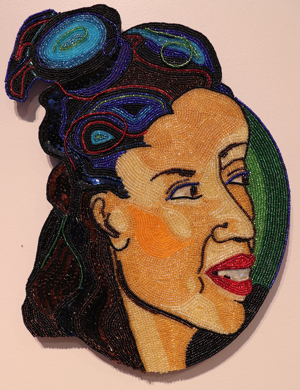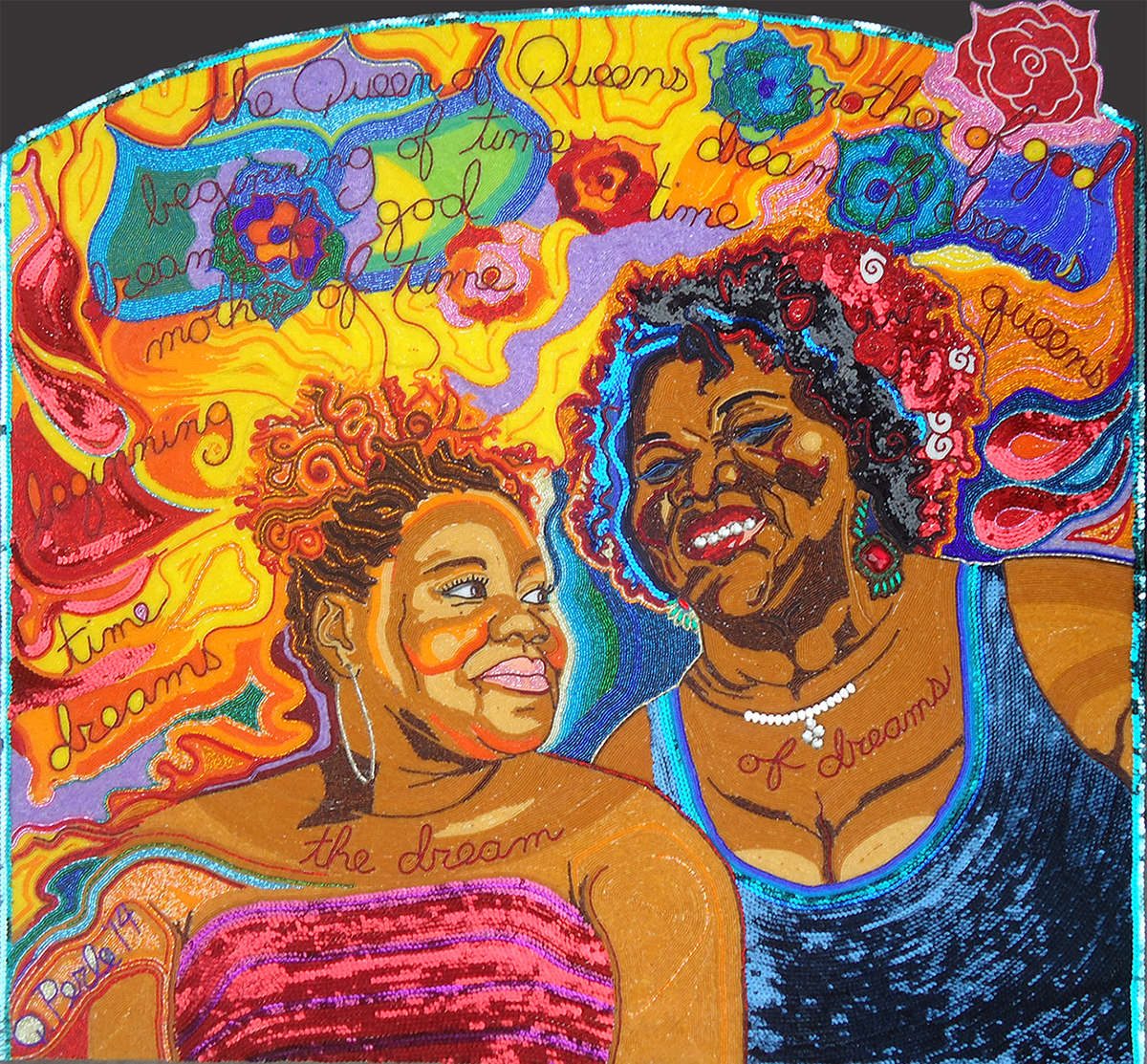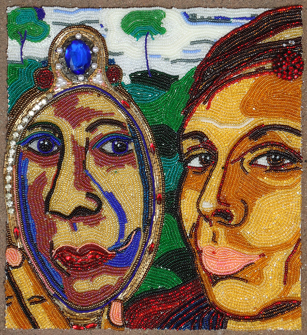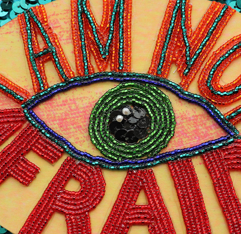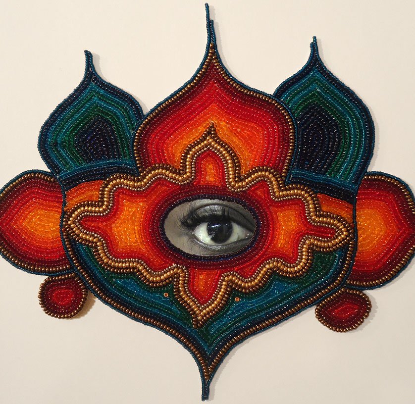 My Octopus Heart, beads and sequins on wood panel, 36” tondo, 2021 I Am Not Afraid, beads, sequins, fabric, trim on wood panel, 6” x 8”, 2025Self Defense, beads, sequins, mica on styrene, 48” x 39”, 2018 Oya, beads, sequins, mica on styrene, 24” x 30”, 2018Shekere Play, beads, sequins, found jewelry on styrene, 60” x 40”, 2019Baobab, beads, sequins, found jewelry on styrene, 22” x 11”, 2020 Sequoia, beads, sequins, found jewelry, fabric on styrene, 22” x 11”, 2020She Laughs, beads, sequins, found jewelry on wood panel, 20” x 16”, 2020Pearls. God Nourishing the Earth With Her Tears, beads, found embroidery and jewelry on board, 2017Pearls. God Nourishing the Earth With Her Milk, beads, sequins, found embroidery and jewelry on board, 2021Mermaid and Octopus, beads, sequins on styrene, 20” x 60”, 2020Dream of Dreams, beads, sequins, found jewelry on styrene, 31” x 37”, 2014The Wave, beads on wood panel, 16” x 20”, 2017Quiero Verte, beads, sequins on styrene, 26” x 24”, 2012Blue Asma, beads, sequins on styrene, 10” x 8”, 2019Untitled (Take’), beads, sequins on styrene, 10” x 8”, 2019Poem Teller: a beaded and sequined oracle speaks poems from a painting. Beads, sequins, acrylic, iPod video on styrene, 2013. Poem Teller (6 minute excerpt)Girl With Crown, beads, sequins, rhinestones, iPod nanos, 20” x 16”, 2013Mona Lisa, beads, sequins, vintage jewelry on polystyrene, video, 38” x 31”, 2012Alhambra, beads on styrene with iPod nano/slideshow, 8″ x 8″, 2012Blue Kisses, 2012, beads, vintage jewelry, iPod nano/video on styrene, 7″ x 3″ (pendant), plus chain Red Kisses, 2012, beads, vintage jewelry, iPod nano/video on styrene, 7″ x 3″ (pendant), plus chainEye Palace, beads on styrene with iPod nano/video, 6 1/2″ x 8 1/2″, 2013Smoky Mirror, beads, sequins, vintage jewelry on styrene, 7″ x 9″, 2012Mirror Image, beads, sequins, vintage jewelry on styrene, 9″ x 8″, 2013Sometimes I Feel Like Sue Kreitzman, lino print on fabric, beads, sequins on styrene, 12” x 18”, 2015Sometimes I Feel Like Tyrone Henderson, lino print on fabric, beads, sequins on styrene, 12” x 18”, 2016Sometimes I Feel Like Lisa Curran, lino print on fabric, beads, sequins on styrene, 12” x 18”, 2016Sometimes I Feel Like Angela Rogers, lino print on fabric, beads, sequins on styrene, 12” x 18”, 2016