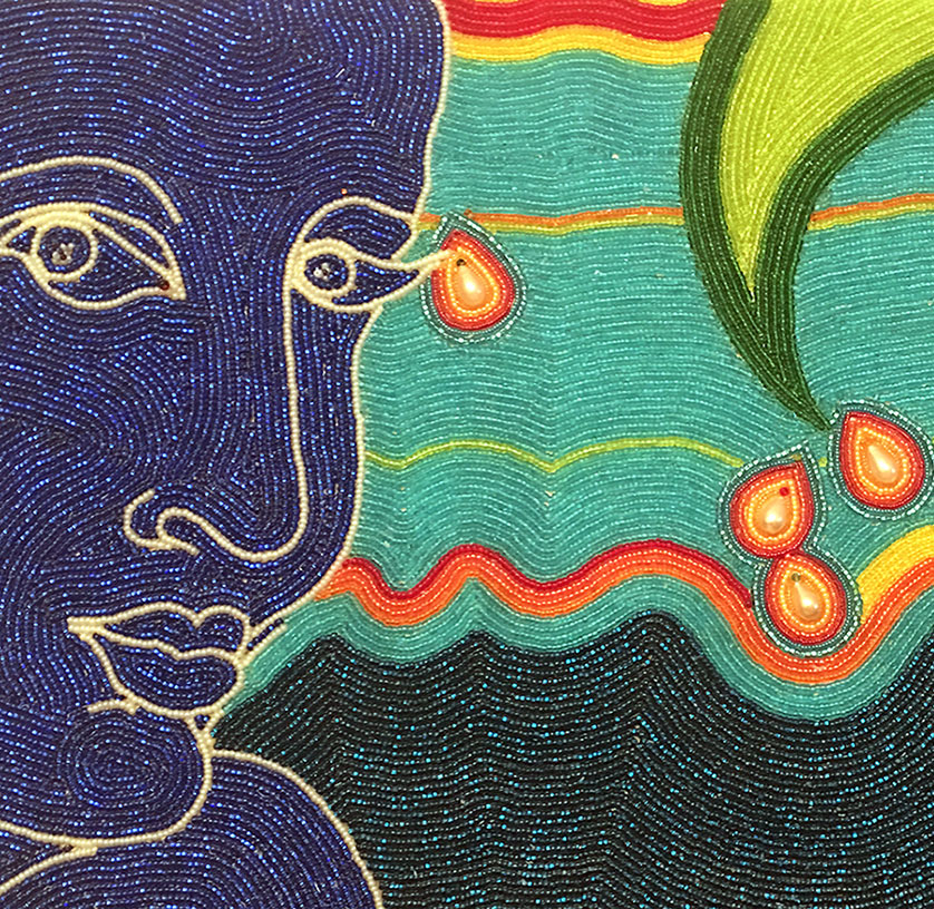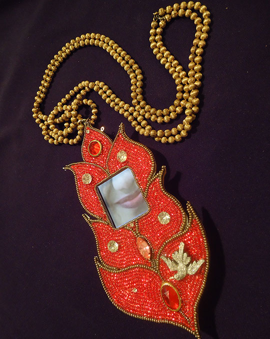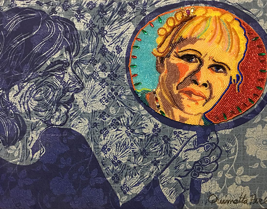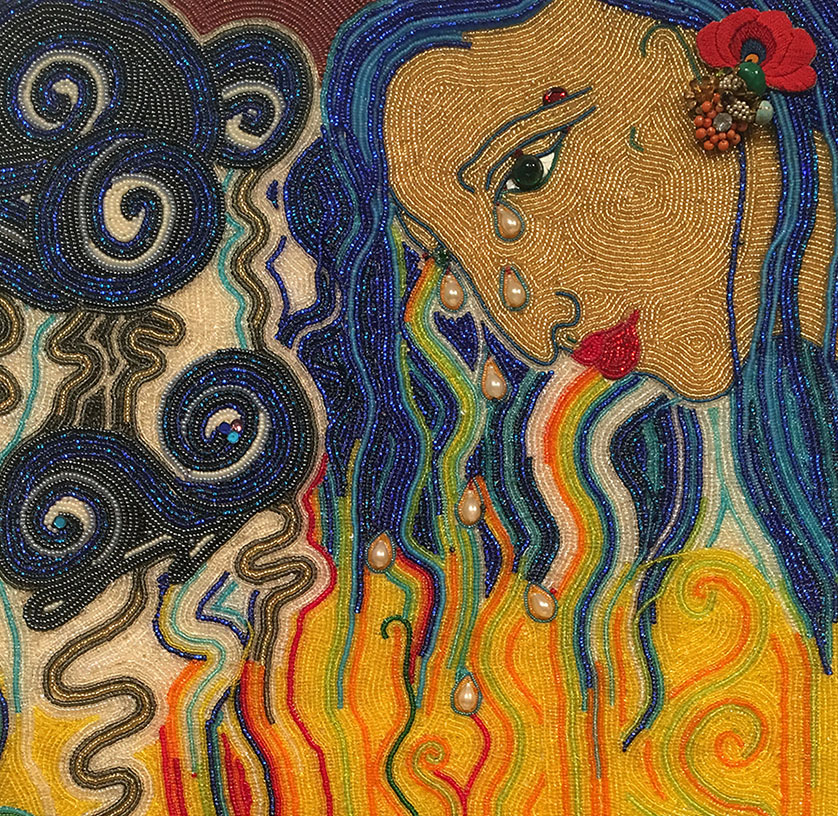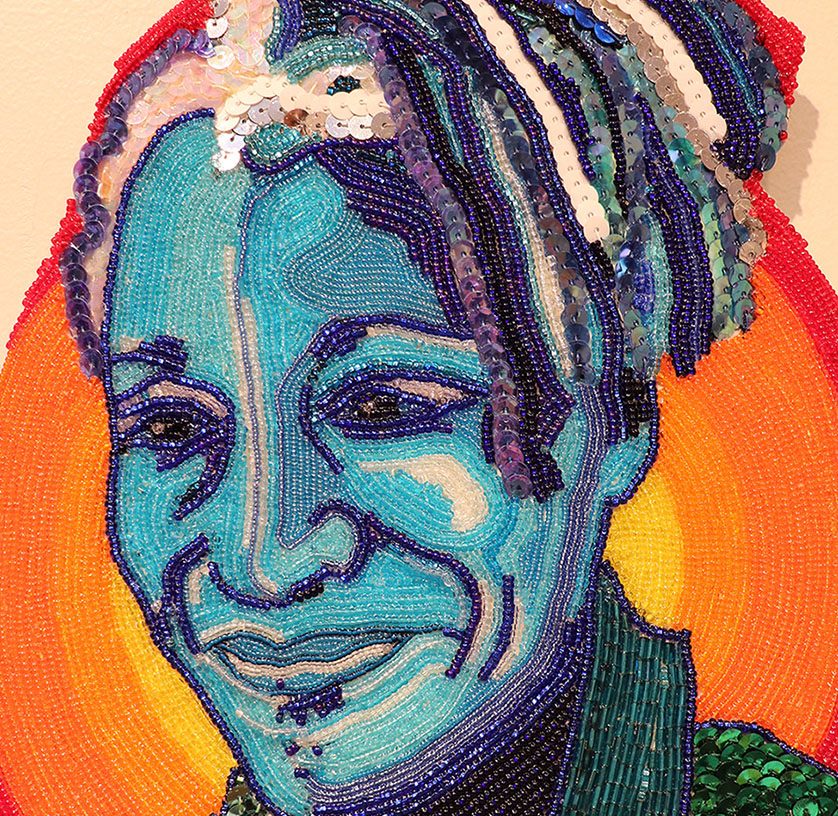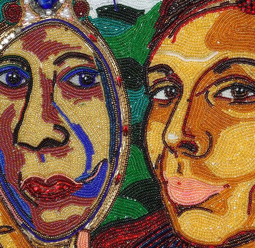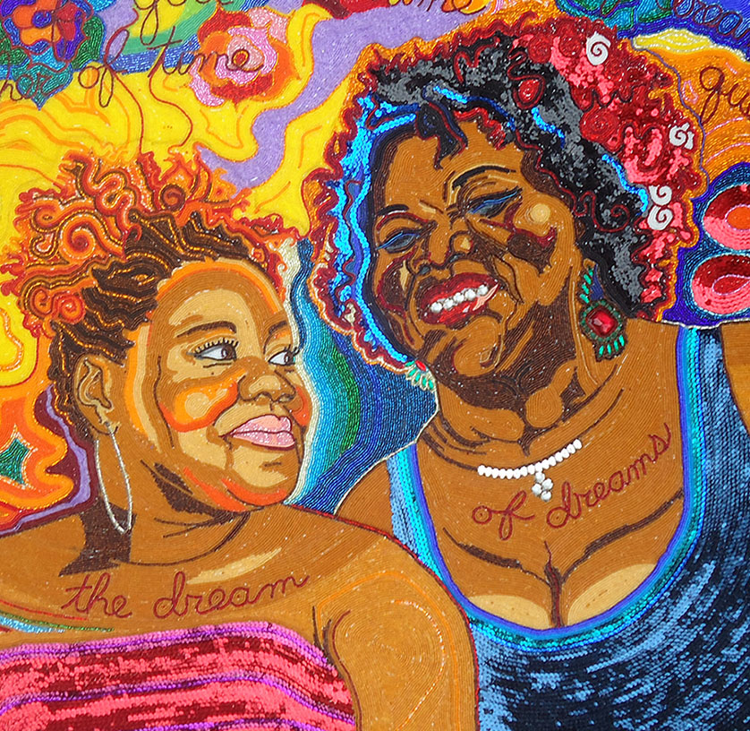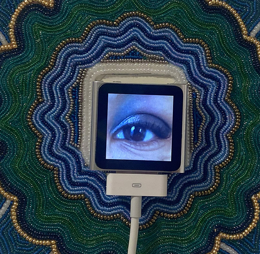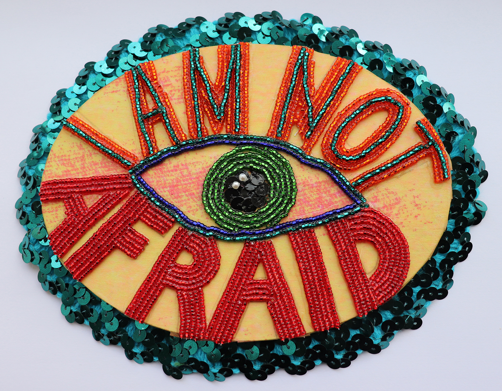 My Octopus Heart, beads and sequins on wood panel, 36” tondo, 2021 I Am Not Afraid, beads, sequins, fabric, trim on wood panel, 6” x 8”, 2025Self Defense, beads, sequins, mica on styrene, 48” x 39”, 2018 Oya, beads, sequins, mica on styrene, 24” x 30”, 2018Shekere Play, beads, sequins, found jewelry on styrene, 60” x 40”, 2019Baobab, beads, sequins, found jewelry on styrene, 22” x 11”, 2020 Sequoia, beads, sequins, found jewelry, fabric on styrene, 22” x 11”, 2020She Laughs, beads, sequins, found jewelry on wood panel, 20” x 16”, 2020Pearls. God Nourishing the Earth With Her Tears, beads, found embroidery and jewelry on board, 2017Pearls. God Nourishing the Earth With Her Milk, beads, sequins, found embroidery and jewelry on board, 2021Mermaid and Octopus, beads, sequins on styrene, 20” x 60”, 2020Dream of Dreams, beads, sequins, found jewelry on styrene, 31” x 37”, 2014The Wave, beads on wood panel, 16” x 20”, 2017Quiero Verte, beads, sequins on styrene, 26” x 24”, 2012Blue Asma, beads, sequins on styrene, 10” x 8”, 2019Untitled (Take’), beads, sequins on styrene, 10” x 8”, 2019Poem Teller: a beaded and sequined oracle speaks poems from a painting. Beads, sequins, acrylic, iPod video on styrene, 2013. Poem Teller (6 minute excerpt)Girl With Crown, beads, sequins, rhinestones, iPod nanos, 20” x 16”, 2013Mona Lisa, beads, sequins, vintage jewelry on polystyrene, video, 38” x 31”, 2012Alhambra, beads on styrene with iPod nano/slideshow, 8″ x 8″, 2012Blue Kisses, 2012, beads, vintage jewelry, iPod nano/video on styrene, 7″ x 3″ (pendant), plus chain Red Kisses, 2012, beads, vintage jewelry, iPod nano/video on styrene, 7″ x 3″ (pendant), plus chainEye Palace, beads on styrene with iPod nano/video, 6 1/2″ x 8 1/2″, 2013Smoky Mirror, beads, sequins, vintage jewelry on styrene, 7″ x 9″, 2012Mirror Image, beads, sequins, vintage jewelry on styrene, 9″ x 8″, 2013Sometimes I Feel Like Sue Kreitzman, lino print on fabric, beads, sequins on styrene, 12” x 18”, 2015Sometimes I Feel Like Tyrone Henderson, lino print on fabric, beads, sequins on styrene, 12” x 18”, 2016Sometimes I Feel Like Lisa Curran, lino print on fabric, beads, sequins on styrene, 12” x 18”, 2016Sometimes I Feel Like Angela Rogers, lino print on fabric, beads, sequins on styrene, 12” x 18”, 2016