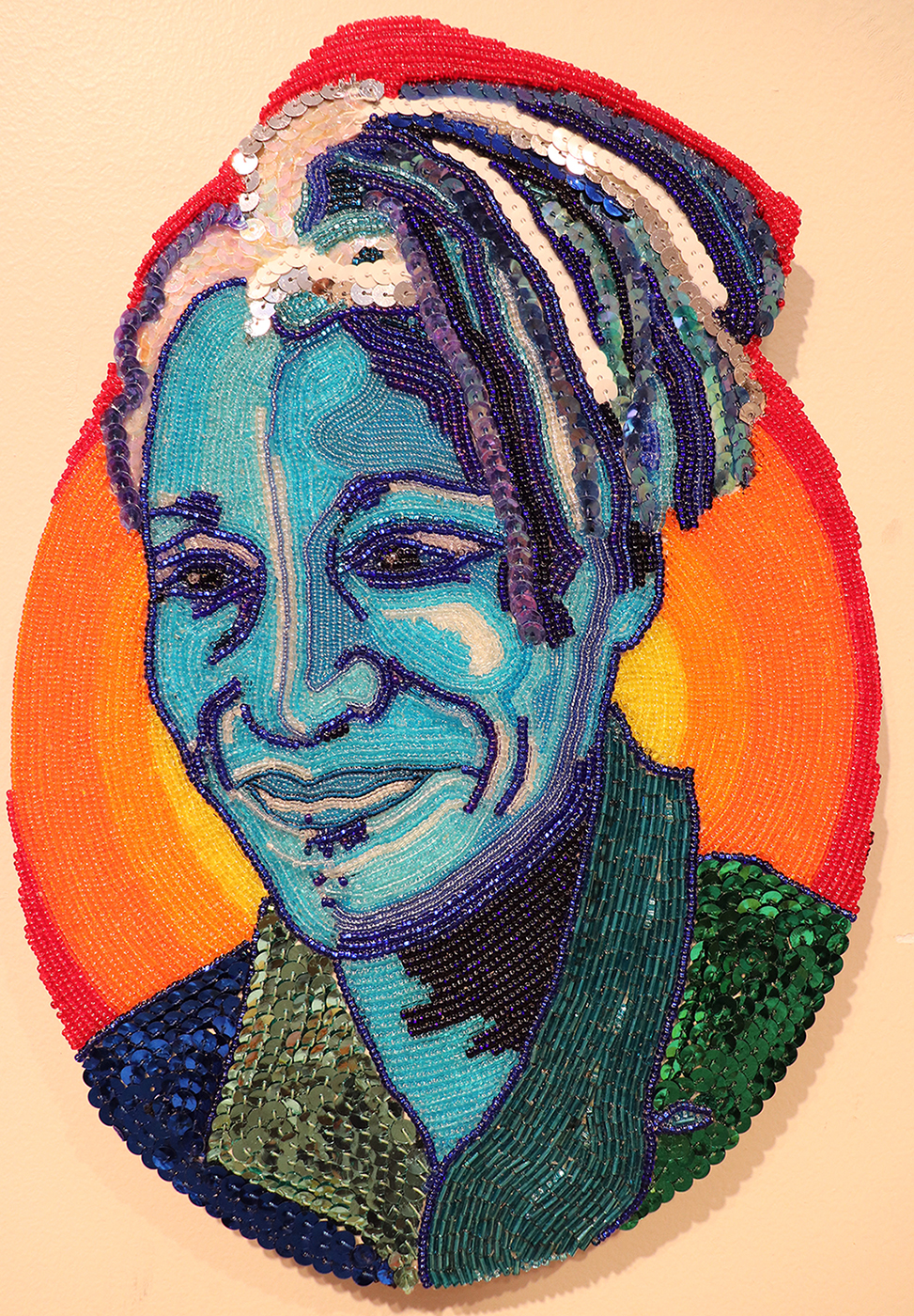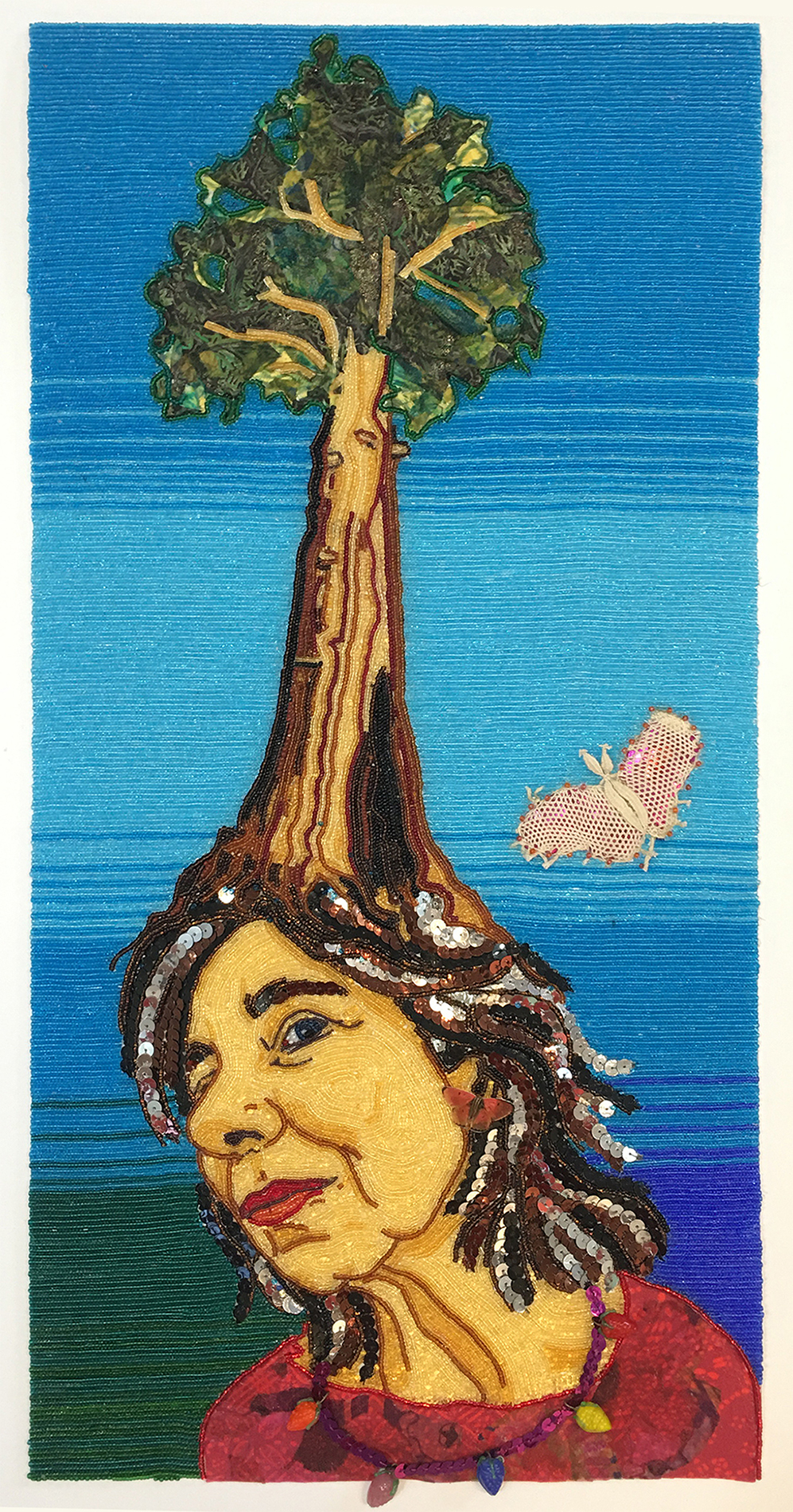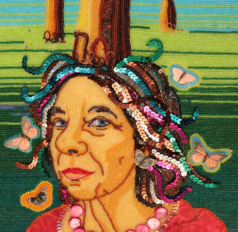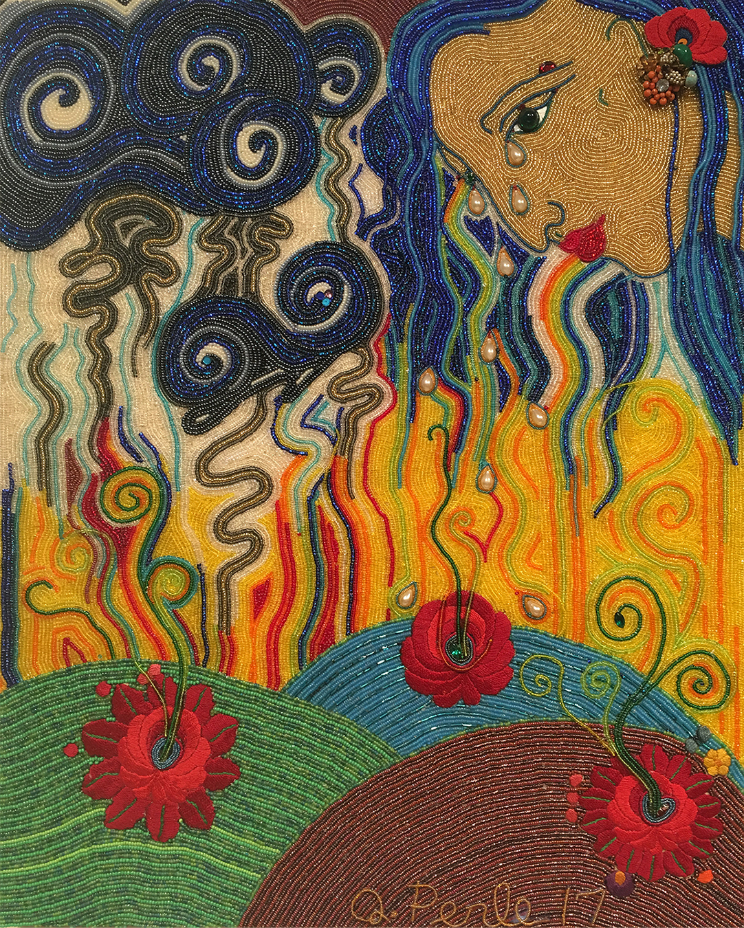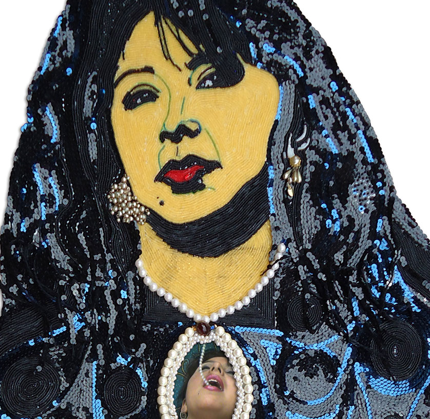 My Octopus Heart, beads and sequins on wood panel, 36” tondo, 2021 I Am Not Afraid, beads, sequins, fabric, trim on wood panel, 6” x 8”, 2025Self Defense, beads, sequins, mica on styrene, 48” x 39”, 2018 Oya, beads, sequins, mica on styrene, 24” x 30”, 2018Shekere Play, beads, sequins, found jewelry on styrene, 60” x 40”, 2019Baobab, beads, sequins, found jewelry on styrene, 22” x 11”, 2020 Sequoia, beads, sequins, found jewelry, fabric on styrene, 22” x 11”, 2020She Laughs, beads, sequins, found jewelry on wood panel, 20” x 16”, 2020Pearls. God Nourishing the Earth With Her Tears, beads, found embroidery and jewelry on board, 2017Pearls. God Nourishing the Earth With Her Milk, beads, sequins, found embroidery and jewelry on board, 2021Mermaid and Octopus, beads, sequins on styrene, 20” x 60”, 2020Dream of Dreams, beads, sequins, found jewelry on styrene, 31” x 37”, 2014The Wave, beads on wood panel, 16” x 20”, 2017Quiero Verte, beads, sequins on styrene, 26” x 24”, 2012Blue Asma, beads, sequins on styrene, 10” x 8”, 2019Untitled (Take’), beads, sequins on styrene, 10” x 8”, 2019Poem Teller: a beaded and sequined oracle speaks poems from a painting. Beads, sequins, acrylic, iPod video on styrene, 2013. Poem Teller (6 minute excerpt)Girl With Crown, beads, sequins, rhinestones, iPod nanos, 20” x 16”, 2013Mona Lisa, beads, sequins, vintage jewelry on polystyrene, video, 38” x 31”, 2012Alhambra, beads on styrene with iPod nano/slideshow, 8″ x 8″, 2012Blue Kisses, 2012, beads, vintage jewelry, iPod nano/video on styrene, 7″ x 3″ (pendant), plus chain Red Kisses, 2012, beads, vintage jewelry, iPod nano/video on styrene, 7″ x 3″ (pendant), plus chainEye Palace, beads on styrene with iPod nano/video, 6 1/2″ x 8 1/2″, 2013Smoky Mirror, beads, sequins, vintage jewelry on styrene, 7″ x 9″, 2012Mirror Image, beads, sequins, vintage jewelry on styrene, 9″ x 8″, 2013Sometimes I Feel Like Sue Kreitzman, lino print on fabric, beads, sequins on styrene, 12” x 18”, 2015Sometimes I Feel Like Tyrone Henderson, lino print on fabric, beads, sequins on styrene, 12” x 18”, 2016Sometimes I Feel Like Lisa Curran, lino print on fabric, beads, sequins on styrene, 12” x 18”, 2016Sometimes I Feel Like Angela Rogers, lino print on fabric, beads, sequins on styrene, 12” x 18”, 2016