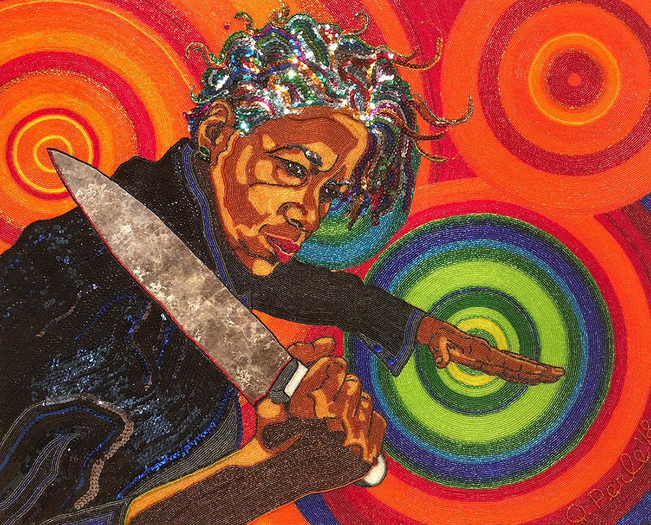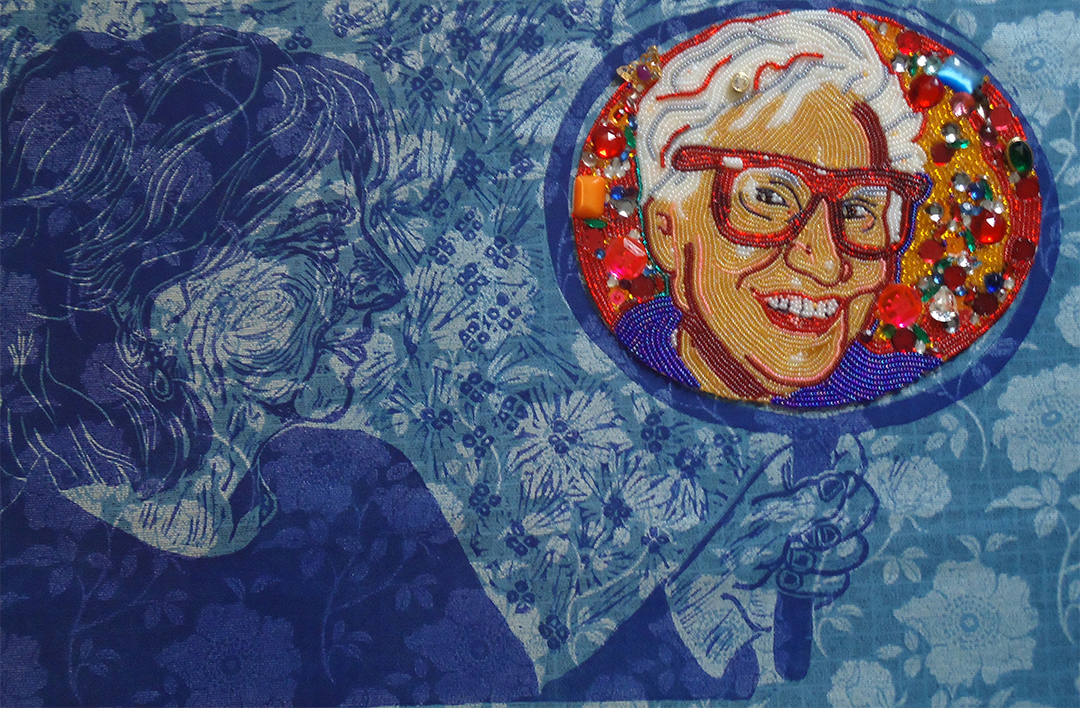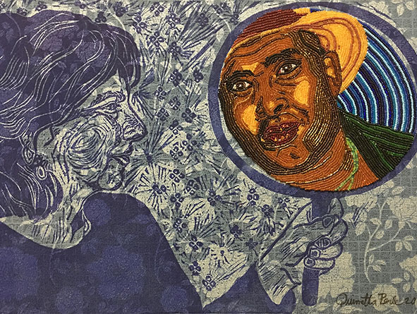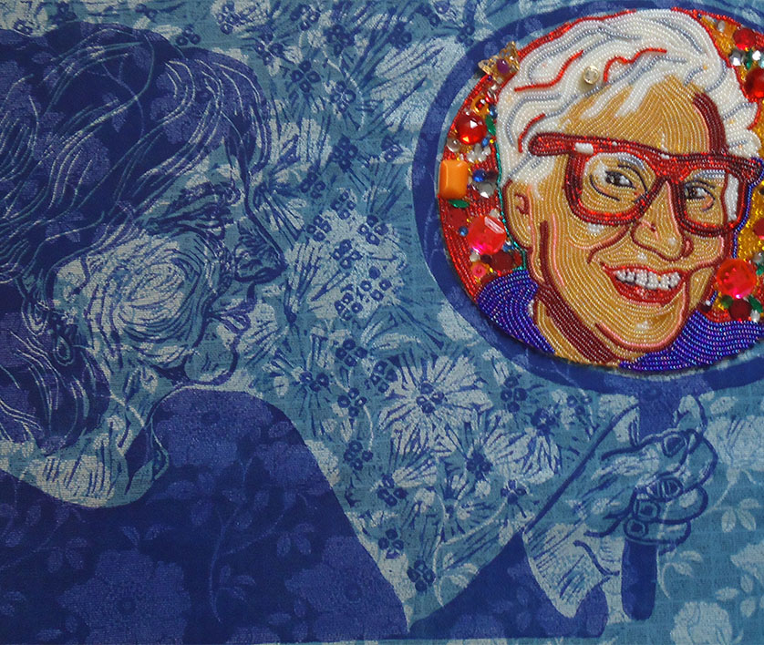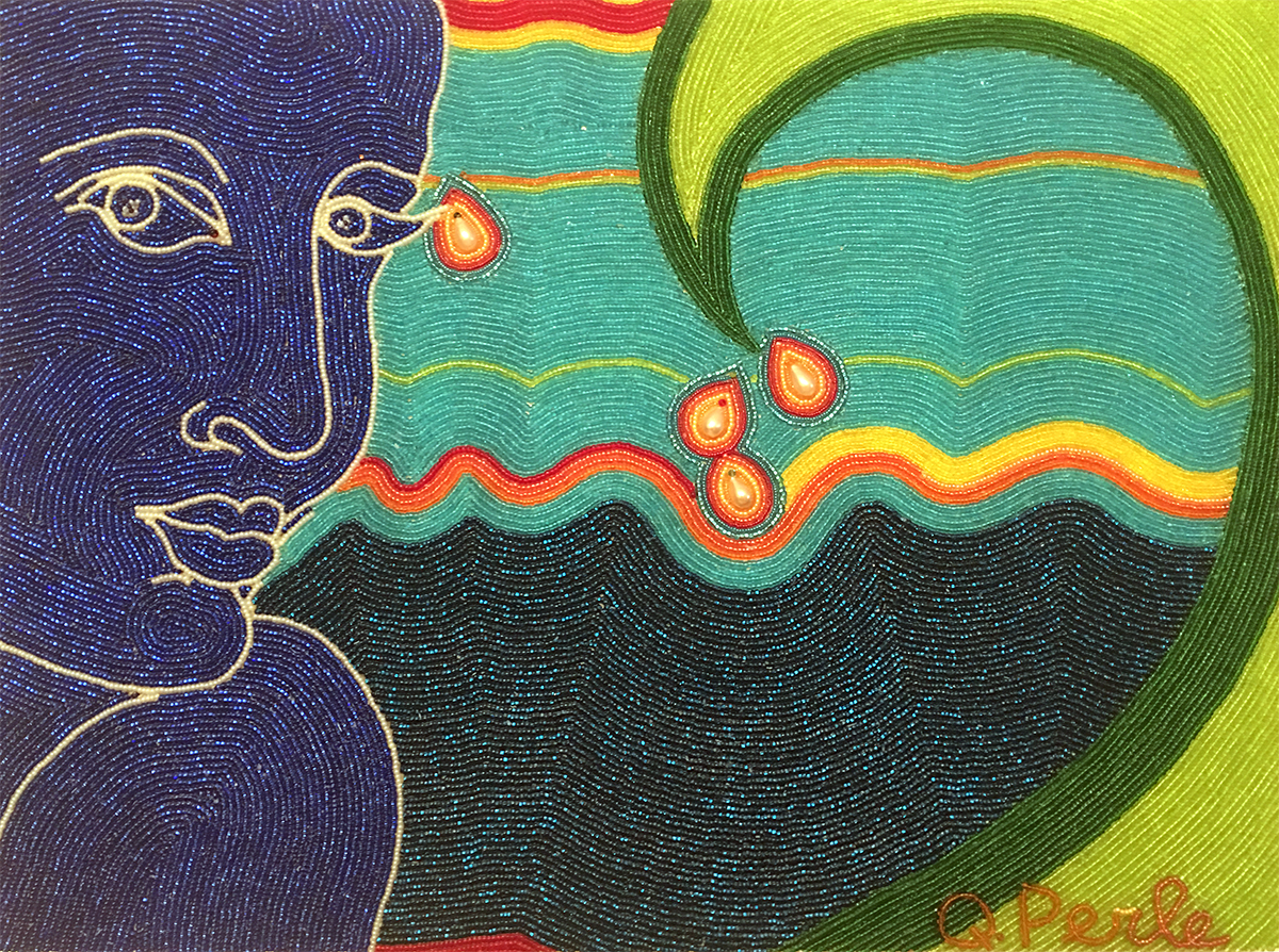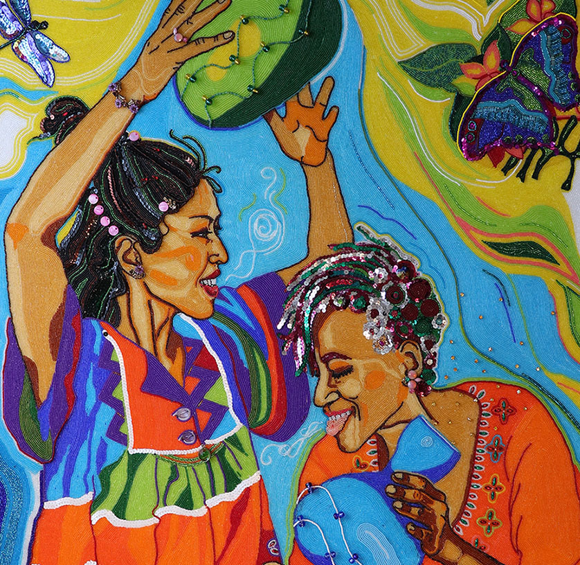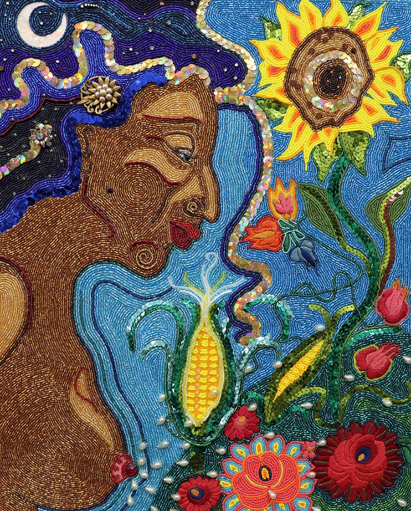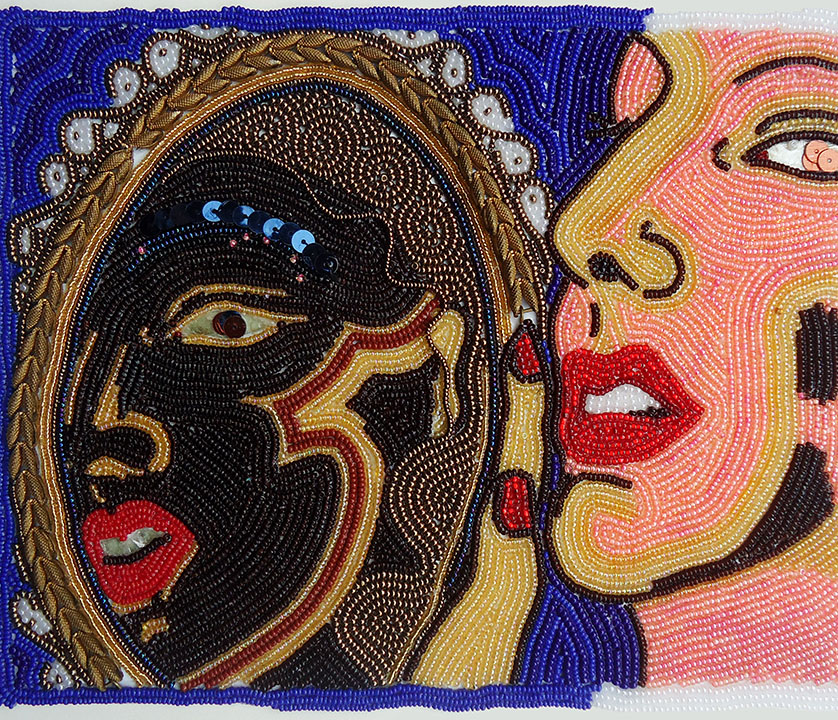 My Octopus Heart, beads and sequins on wood panel, 36” tondo, 2021 I Am Not Afraid, beads, sequins, fabric, trim on wood panel, 6” x 8”, 2025Self Defense, beads, sequins, mica on styrene, 48” x 39”, 2018 Oya, beads, sequins, mica on styrene, 24” x 30”, 2018Shekere Play, beads, sequins, found jewelry on styrene, 60” x 40”, 2019Baobab, beads, sequins, found jewelry on styrene, 22” x 11”, 2020 Sequoia, beads, sequins, found jewelry, fabric on styrene, 22” x 11”, 2020She Laughs, beads, sequins, found jewelry on wood panel, 20” x 16”, 2020Pearls. God Nourishing the Earth With Her Tears, beads, found embroidery and jewelry on board, 2017Pearls. God Nourishing the Earth With Her Milk, beads, sequins, found embroidery and jewelry on board, 2021Mermaid and Octopus, beads, sequins on styrene, 20” x 60”, 2020Dream of Dreams, beads, sequins, found jewelry on styrene, 31” x 37”, 2014The Wave, beads on wood panel, 16” x 20”, 2017Quiero Verte, beads, sequins on styrene, 26” x 24”, 2012Blue Asma, beads, sequins on styrene, 10” x 8”, 2019Untitled (Take’), beads, sequins on styrene, 10” x 8”, 2019Poem Teller: a beaded and sequined oracle speaks poems from a painting. Beads, sequins, acrylic, iPod video on styrene, 2013. Poem Teller (6 minute excerpt)Girl With Crown, beads, sequins, rhinestones, iPod nanos, 20” x 16”, 2013Mona Lisa, beads, sequins, vintage jewelry on polystyrene, video, 38” x 31”, 2012Alhambra, beads on styrene with iPod nano/slideshow, 8″ x 8″, 2012Blue Kisses, 2012, beads, vintage jewelry, iPod nano/video on styrene, 7″ x 3″ (pendant), plus chain Red Kisses, 2012, beads, vintage jewelry, iPod nano/video on styrene, 7″ x 3″ (pendant), plus chainEye Palace, beads on styrene with iPod nano/video, 6 1/2″ x 8 1/2″, 2013Smoky Mirror, beads, sequins, vintage jewelry on styrene, 7″ x 9″, 2012Mirror Image, beads, sequins, vintage jewelry on styrene, 9″ x 8″, 2013Sometimes I Feel Like Sue Kreitzman, lino print on fabric, beads, sequins on styrene, 12” x 18”, 2015Sometimes I Feel Like Tyrone Henderson, lino print on fabric, beads, sequins on styrene, 12” x 18”, 2016Sometimes I Feel Like Lisa Curran, lino print on fabric, beads, sequins on styrene, 12” x 18”, 2016Sometimes I Feel Like Angela Rogers, lino print on fabric, beads, sequins on styrene, 12” x 18”, 2016