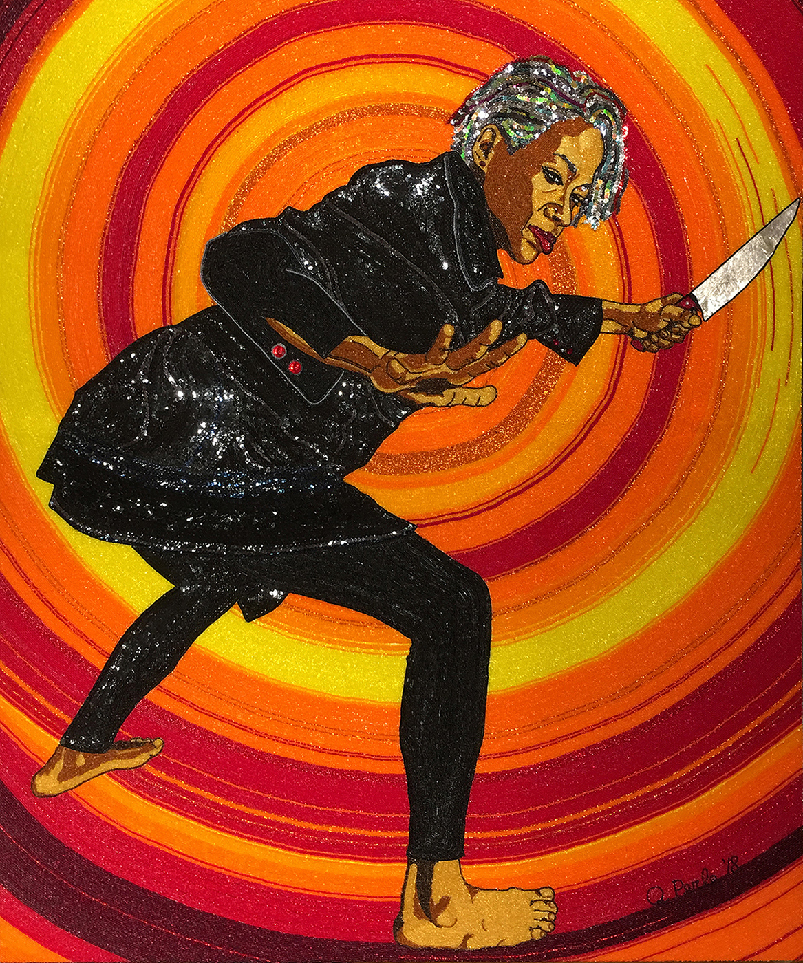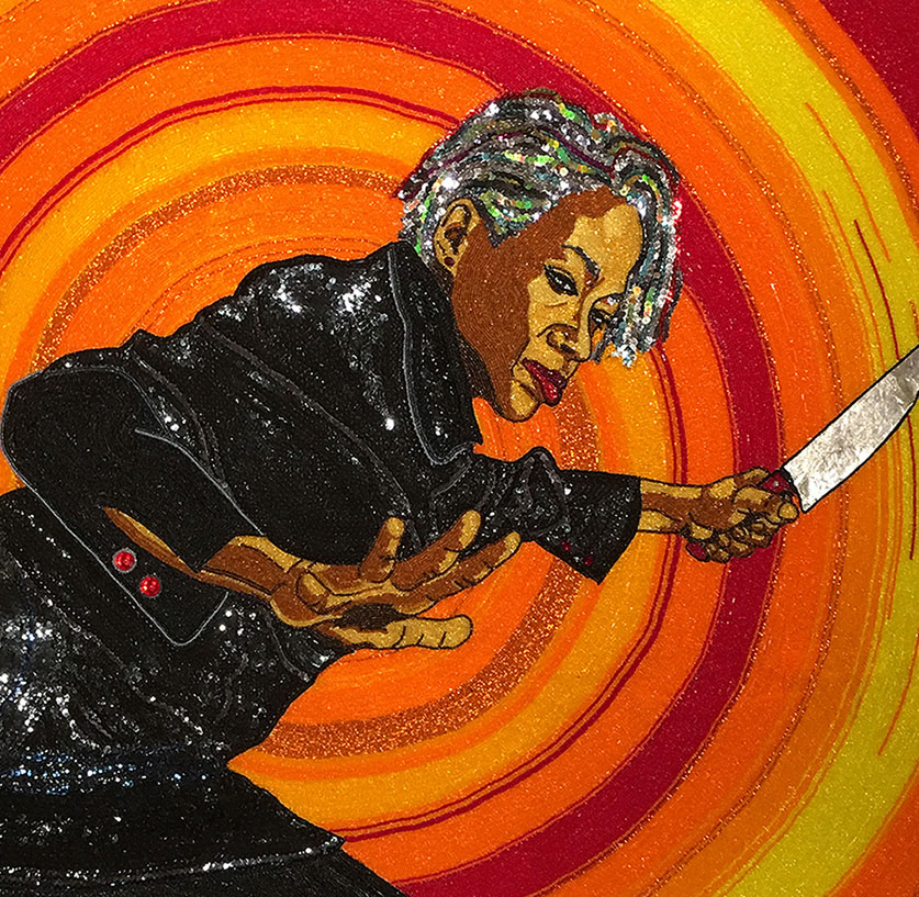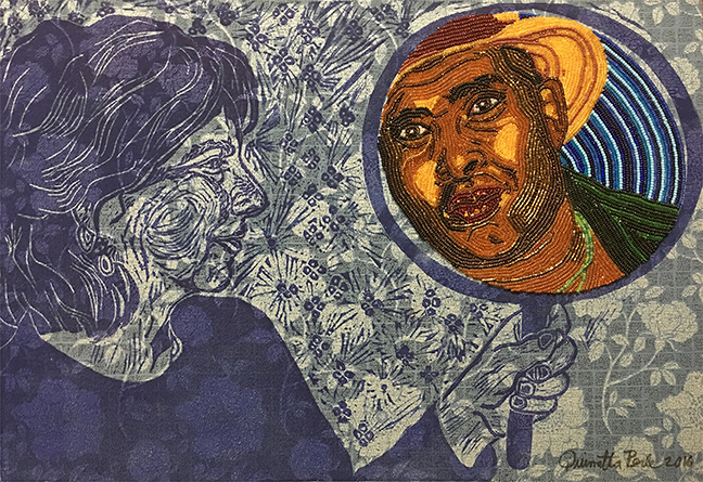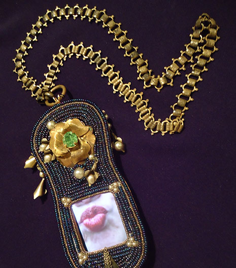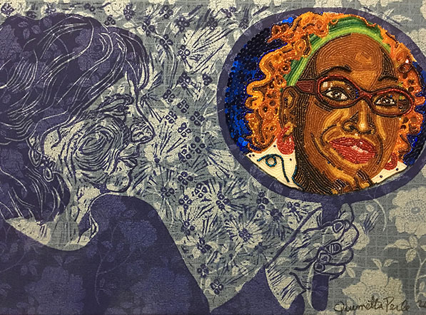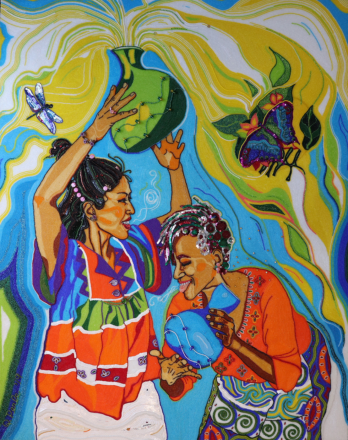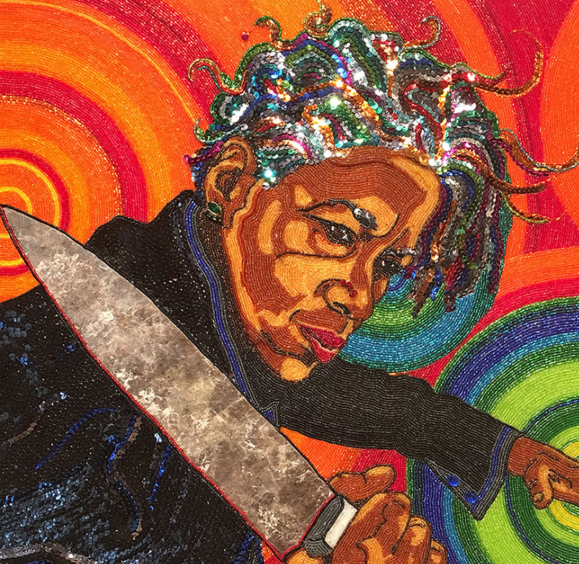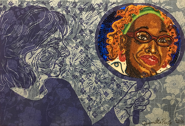 My Octopus Heart, beads and sequins on wood panel, 36” tondo, 2021 I Am Not Afraid, beads, sequins, fabric, trim on wood panel, 6” x 8”, 2025Self Defense, beads, sequins, mica on styrene, 48” x 39”, 2018 Oya, beads, sequins, mica on styrene, 24” x 30”, 2018Shekere Play, beads, sequins, found jewelry on styrene, 60” x 40”, 2019Baobab, beads, sequins, found jewelry on styrene, 22” x 11”, 2020 Sequoia, beads, sequins, found jewelry, fabric on styrene, 22” x 11”, 2020She Laughs, beads, sequins, found jewelry on wood panel, 20” x 16”, 2020Pearls. God Nourishing the Earth With Her Tears, beads, found embroidery and jewelry on board, 2017Pearls. God Nourishing the Earth With Her Milk, beads, sequins, found embroidery and jewelry on board, 2021Mermaid and Octopus, beads, sequins on styrene, 20” x 60”, 2020Dream of Dreams, beads, sequins, found jewelry on styrene, 31” x 37”, 2014The Wave, beads on wood panel, 16” x 20”, 2017Quiero Verte, beads, sequins on styrene, 26” x 24”, 2012Blue Asma, beads, sequins on styrene, 10” x 8”, 2019Untitled (Take’), beads, sequins on styrene, 10” x 8”, 2019Poem Teller: a beaded and sequined oracle speaks poems from a painting. Beads, sequins, acrylic, iPod video on styrene, 2013. Poem Teller (6 minute excerpt)Girl With Crown, beads, sequins, rhinestones, iPod nanos, 20” x 16”, 2013Mona Lisa, beads, sequins, vintage jewelry on polystyrene, video, 38” x 31”, 2012Alhambra, beads on styrene with iPod nano/slideshow, 8″ x 8″, 2012Blue Kisses, 2012, beads, vintage jewelry, iPod nano/video on styrene, 7″ x 3″ (pendant), plus chain Red Kisses, 2012, beads, vintage jewelry, iPod nano/video on styrene, 7″ x 3″ (pendant), plus chainEye Palace, beads on styrene with iPod nano/video, 6 1/2″ x 8 1/2″, 2013Smoky Mirror, beads, sequins, vintage jewelry on styrene, 7″ x 9″, 2012Mirror Image, beads, sequins, vintage jewelry on styrene, 9″ x 8″, 2013Sometimes I Feel Like Sue Kreitzman, lino print on fabric, beads, sequins on styrene, 12” x 18”, 2015Sometimes I Feel Like Tyrone Henderson, lino print on fabric, beads, sequins on styrene, 12” x 18”, 2016Sometimes I Feel Like Lisa Curran, lino print on fabric, beads, sequins on styrene, 12” x 18”, 2016Sometimes I Feel Like Angela Rogers, lino print on fabric, beads, sequins on styrene, 12” x 18”, 2016