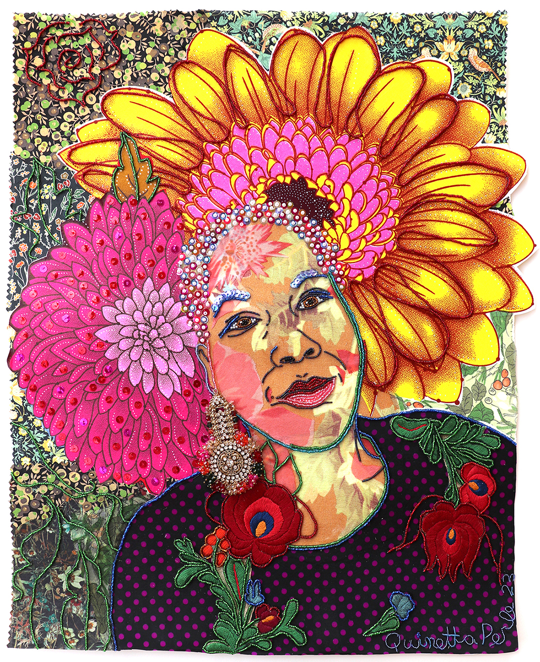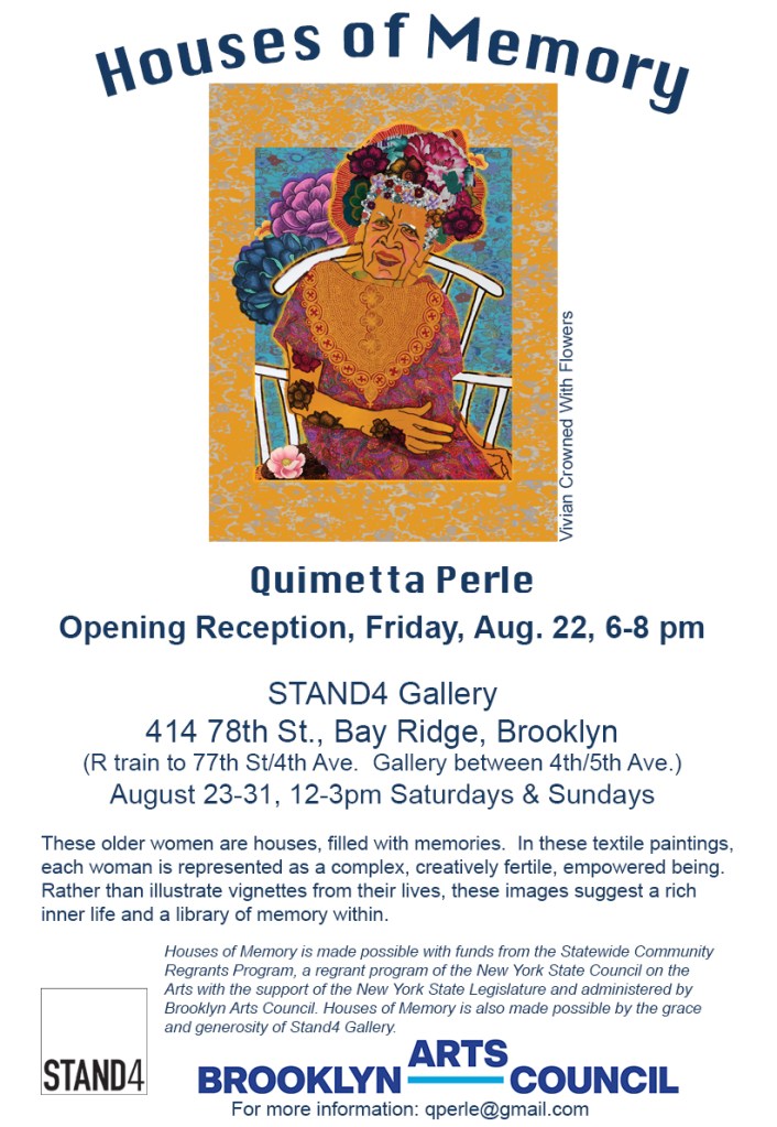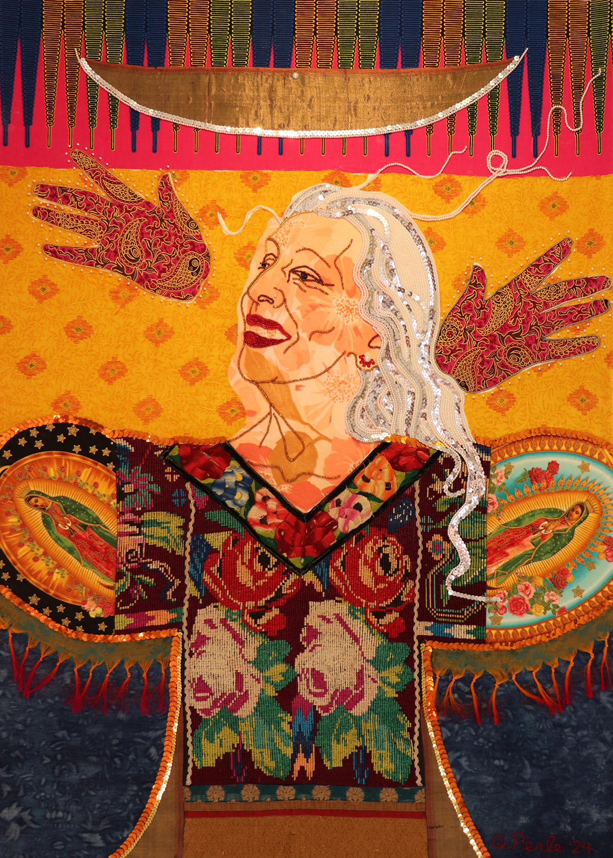 Quimetta Perle is an American artist of Spanish and Jewish descent. Born in Washington, DC, she maintains a studio in Brooklyn, NY and Delray Beach, FL. She earned a BFA from Minneapolis College of Art and Design in 1976 and an MFA in Computer Art from School of Visual Arts in 1997. She has been a feminist artist and activist since the 1970’s, and an early member of WARM Gallery, a women’s collective in Minneapolis in the 70’s/80’s. She has had numerous solo exhibitions, including at the Cultural Council of Palm Beach County, Arts Warehouse in Delray, Stand4 Gallery in Brooklyn, Carter Burden Gallery, Soho 20, Brooklyn Polytechnic and Lesley University’s Marron Gallery, and numerous group exhibitions in museums and galleries nationally and in the UK. She was awarded a commission in 2025 to create a series of 8 textile hangings in the Mandel Library in West Palm Beach. In addition to her studio work, she is the former Director of the HAI Art Studio and Gallery in New York, which served artists with mental illness; and led YAI Arts, another inclusive studio, for which she now serves as an artist mentor.