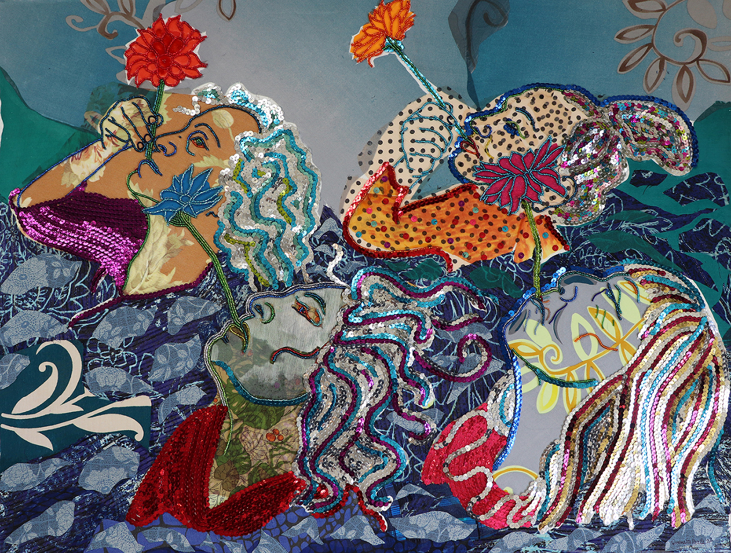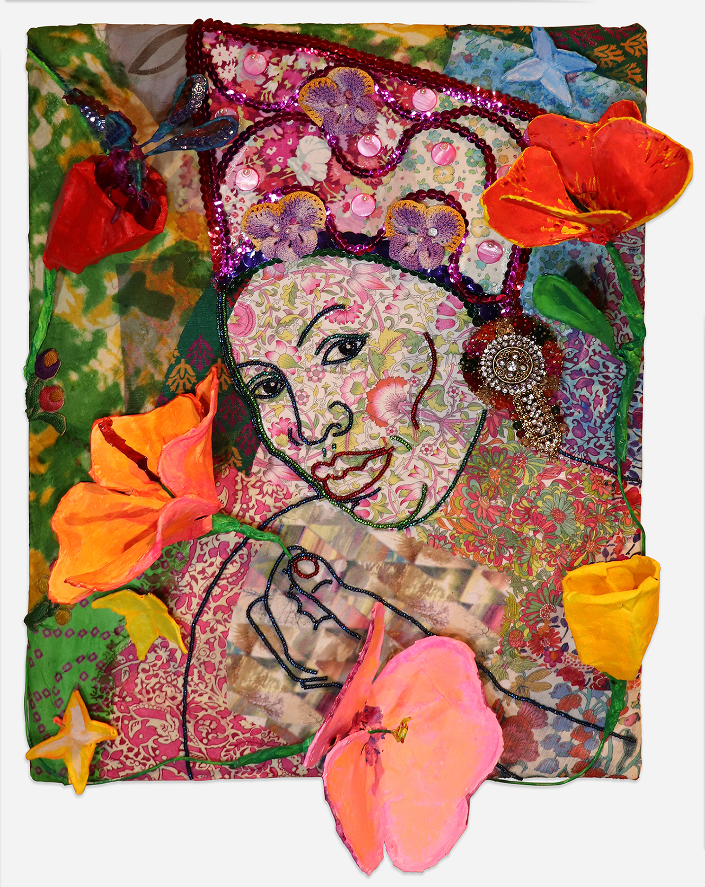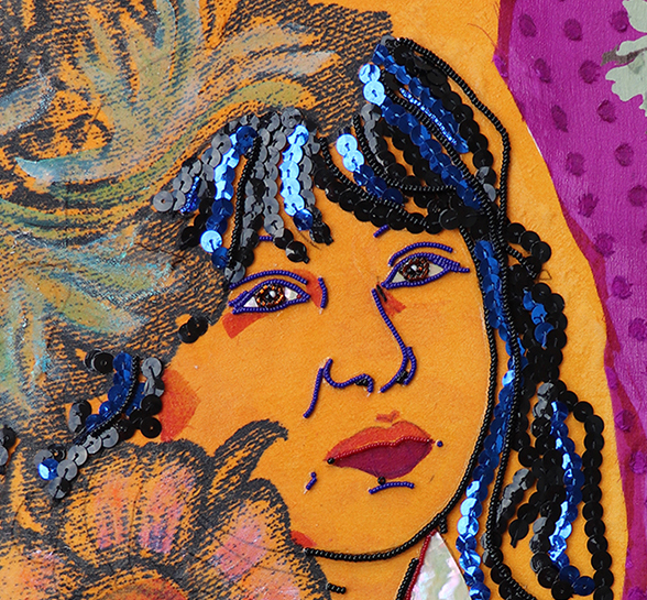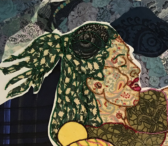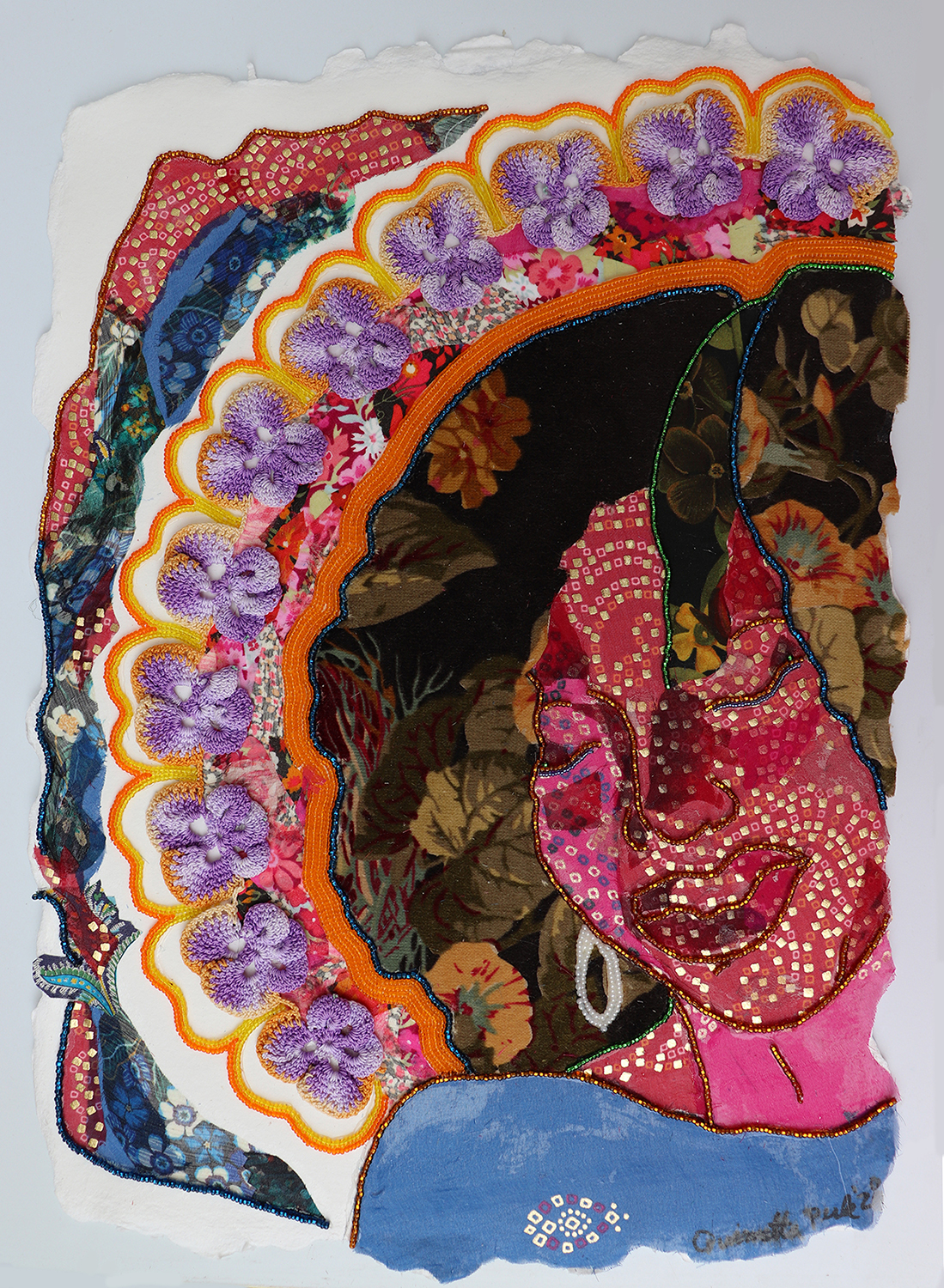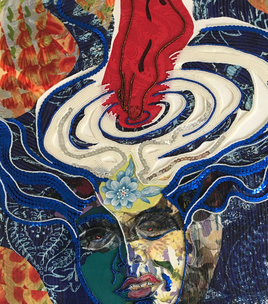 Protectors of the Women, 21″ X 41″, oval, fabric, beads, sequins, acrylics on panelDouble Edged Blues, 30″ X 42″, fabric, sequins, beads, acrylics on rag paperRitual, 20″ X 16″, fabric, beads, sequins, on rag paperFlora, 20″ X 16″, fabric, beads, sequins, found jewelry and embroidery on rag paperGuardian, 20″ X 14″, fabric, beads, mother of pearl on rag paperRevisiting Joy, 20″ X 16″, fabric, beads on rag paperReflection, 12″ X 9″, fabric, beads on wood panelThe Four Graces, 42″ X 30″, fabric, beads, sequins, mother of pearl, abalone on rag paperHow the Wind Blows, 30″ X 42″, fabric, beads, sequins on rag paperIt’s Getting Biblical, 30″ X 42″, fabric, beads, sequins acrylics on rag paper