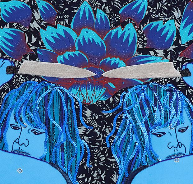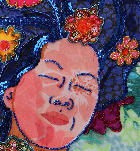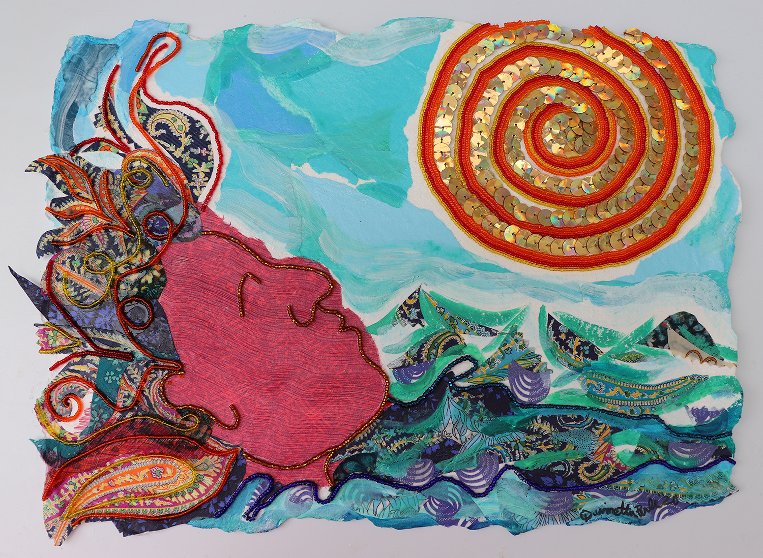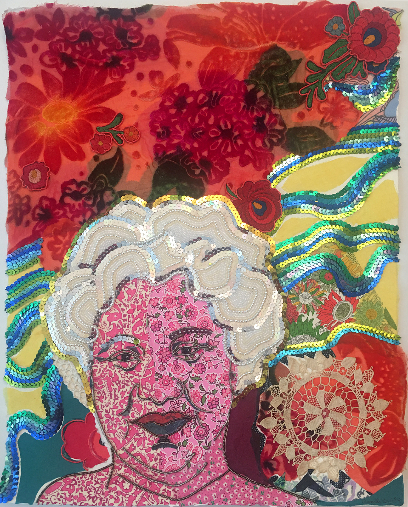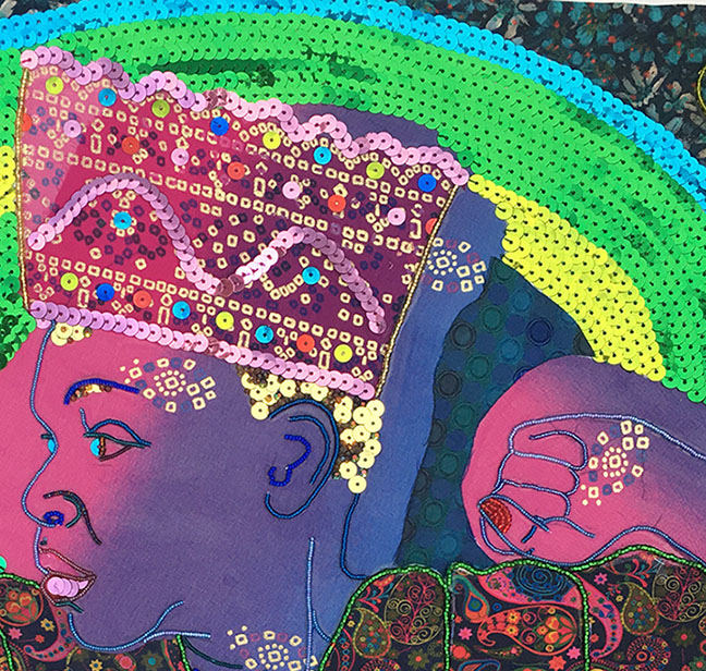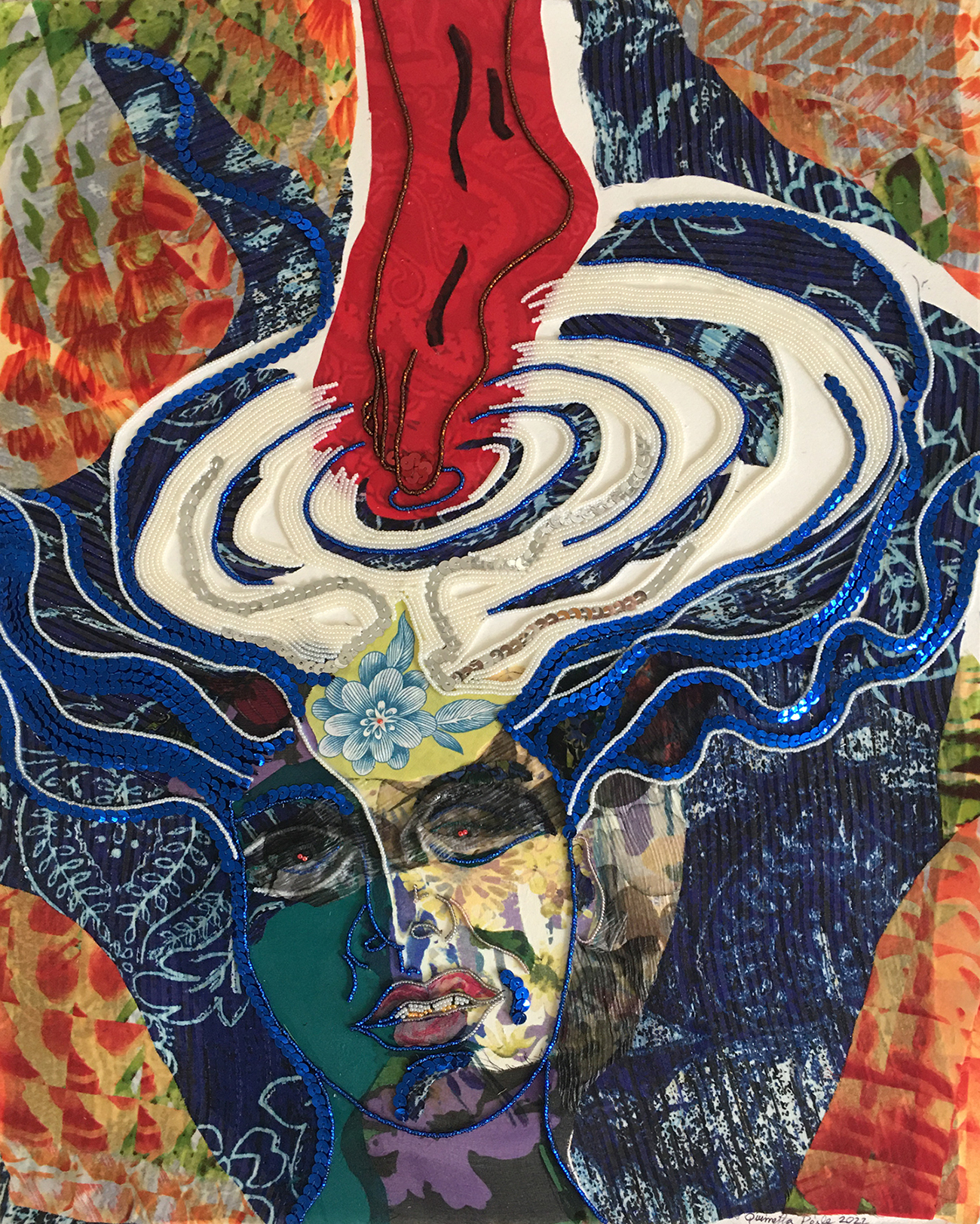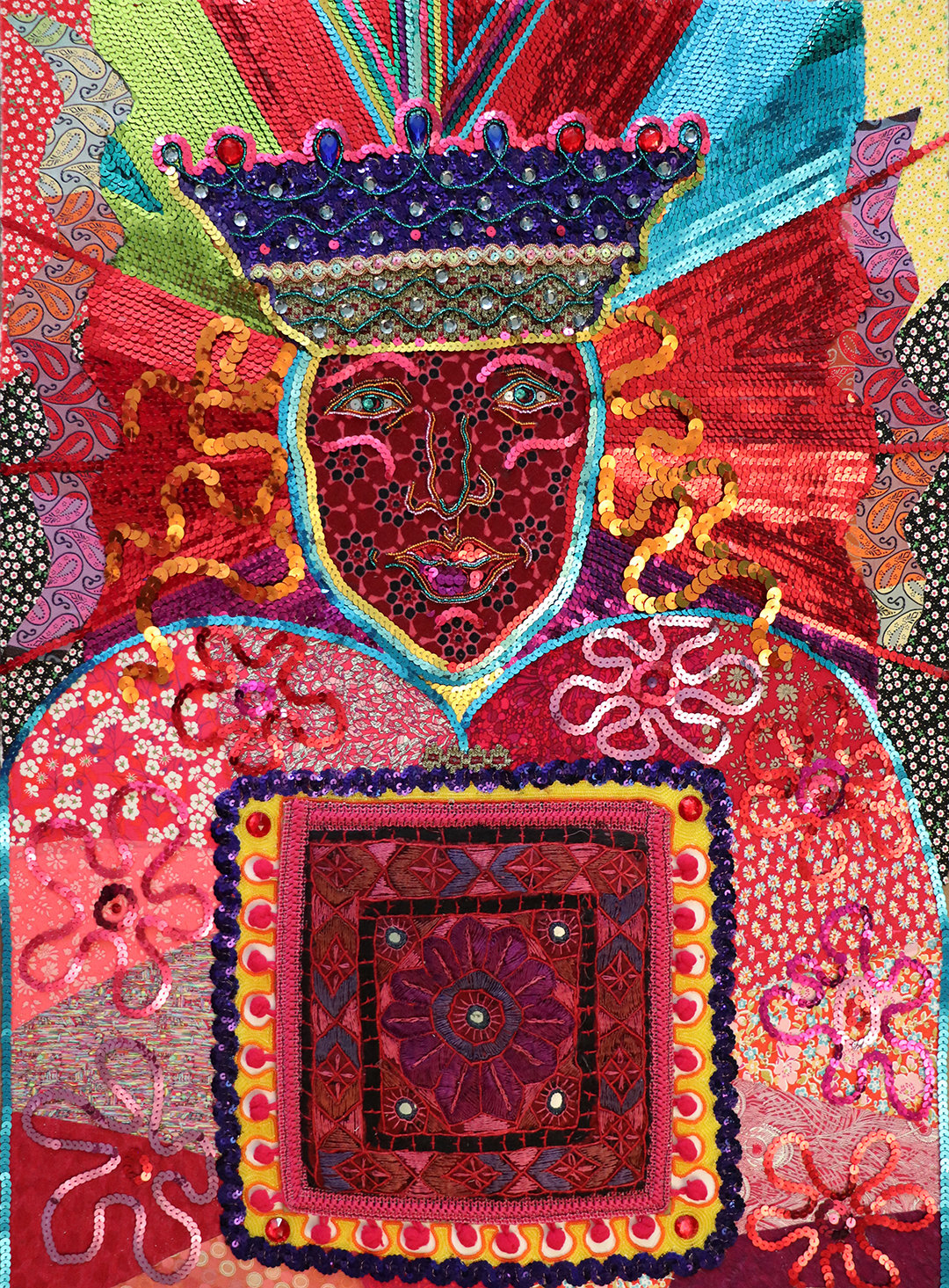 Protectors of the Women, 21″ X 41″, oval, fabric, beads, sequins, acrylics on panelDouble Edged Blues, 30″ X 42″, fabric, sequins, beads, acrylics on rag paperRitual, 20″ X 16″, fabric, beads, sequins, on rag paperFlora, 20″ X 16″, fabric, beads, sequins, found jewelry and embroidery on rag paperGuardian, 20″ X 14″, fabric, beads, mother of pearl on rag paperRevisiting Joy, 20″ X 16″, fabric, beads on rag paperReflection, 12″ X 9″, fabric, beads on wood panelThe Four Graces, 42″ X 30″, fabric, beads, sequins, mother of pearl, abalone on rag paperHow the Wind Blows, 30″ X 42″, fabric, beads, sequins on rag paperIt’s Getting Biblical, 30″ X 42″, fabric, beads, sequins acrylics on rag paper