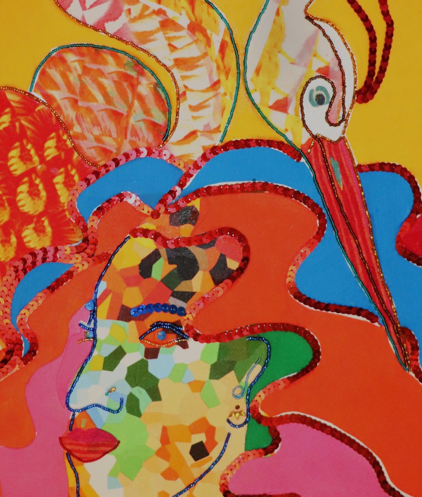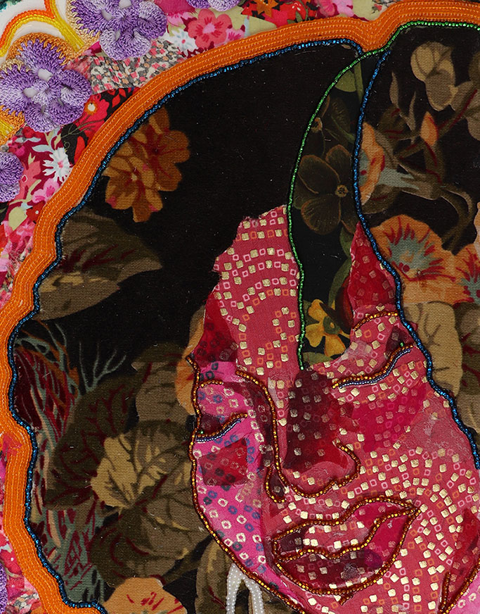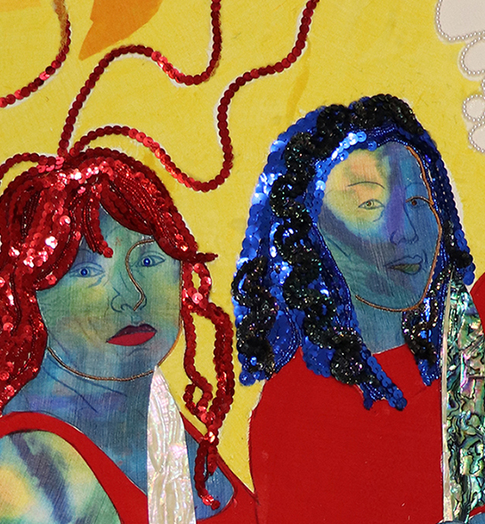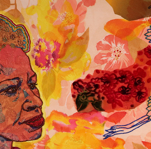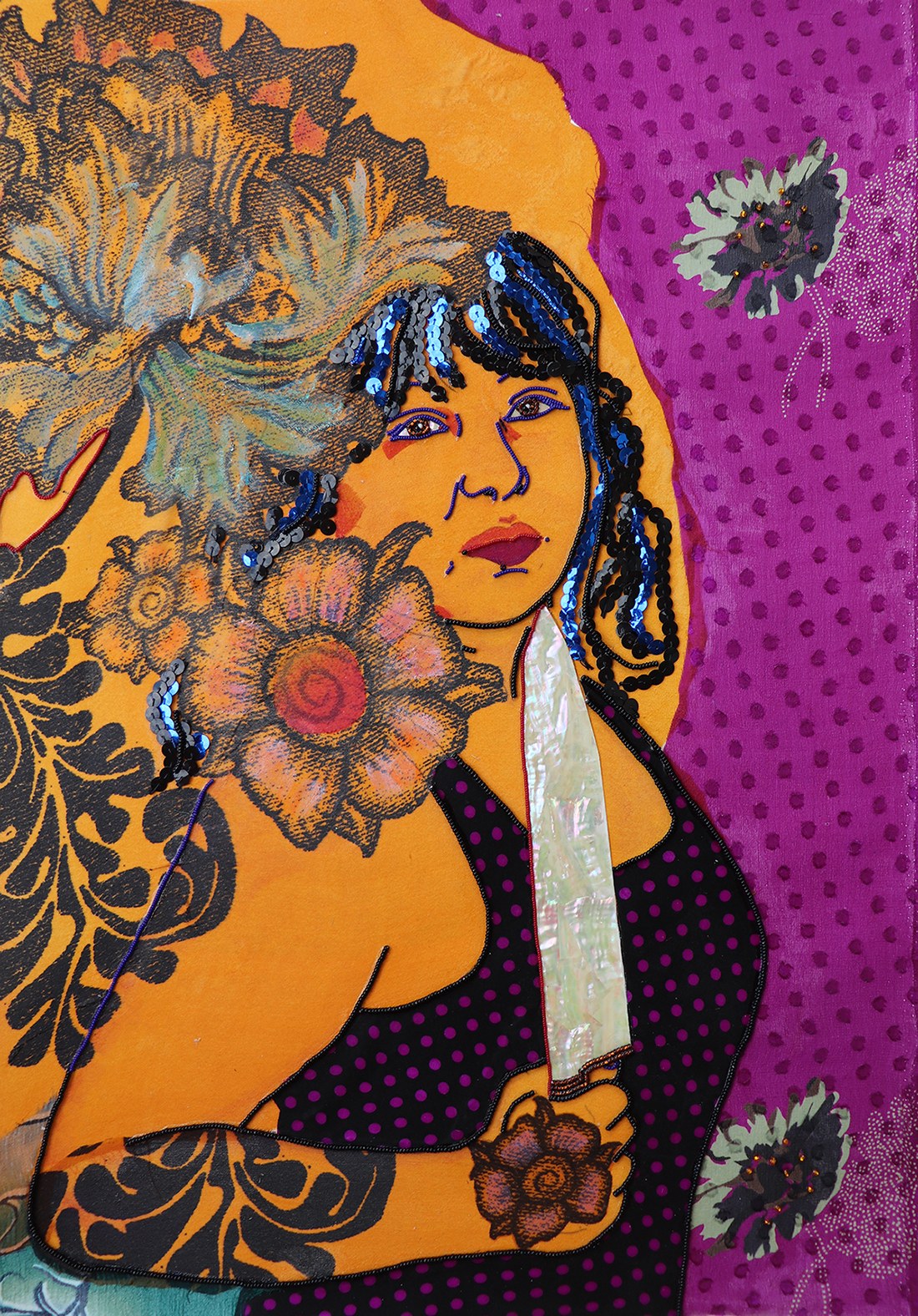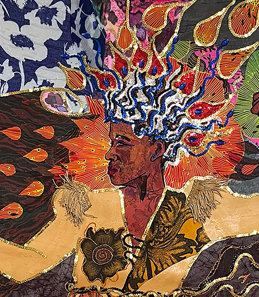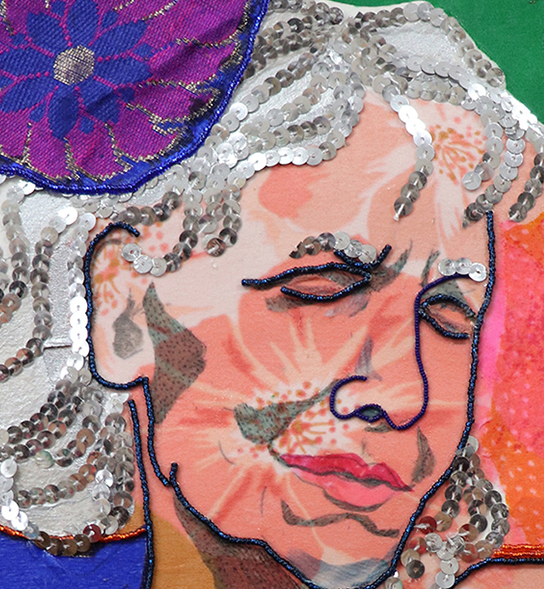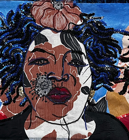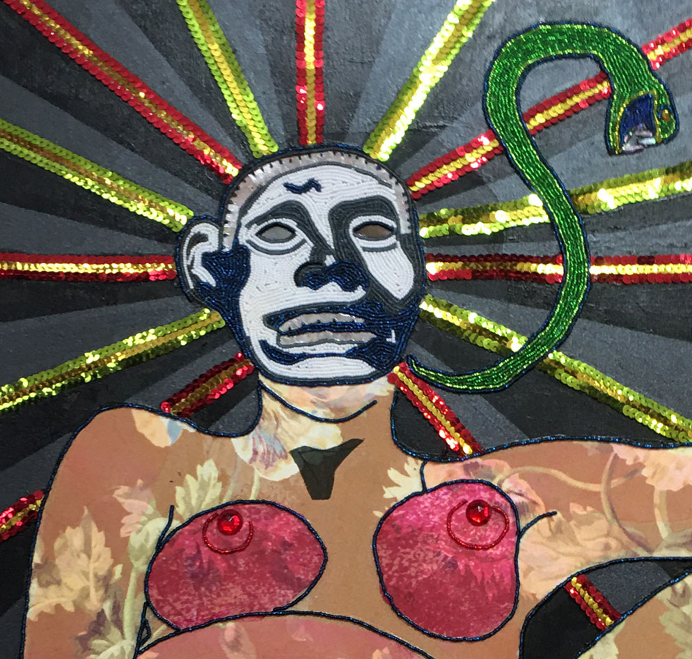 Protectors of the Women, 21″ X 41″, oval, fabric, beads, sequins, acrylics on panelDouble Edged Blues, 30″ X 42″, fabric, sequins, beads, acrylics on rag paperRitual, 20″ X 16″, fabric, beads, sequins, on rag paperFlora, 20″ X 16″, fabric, beads, sequins, found jewelry and embroidery on rag paperGuardian, 20″ X 14″, fabric, beads, mother of pearl on rag paperRevisiting Joy, 20″ X 16″, fabric, beads on rag paperReflection, 12″ X 9″, fabric, beads on wood panelThe Four Graces, 42″ X 30″, fabric, beads, sequins, mother of pearl, abalone on rag paperHow the Wind Blows, 30″ X 42″, fabric, beads, sequins on rag paperIt’s Getting Biblical, 30″ X 42″, fabric, beads, sequins acrylics on rag paper