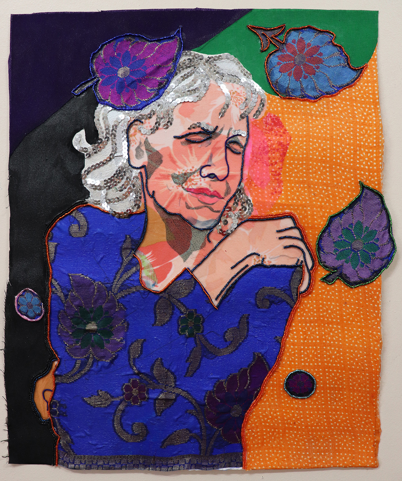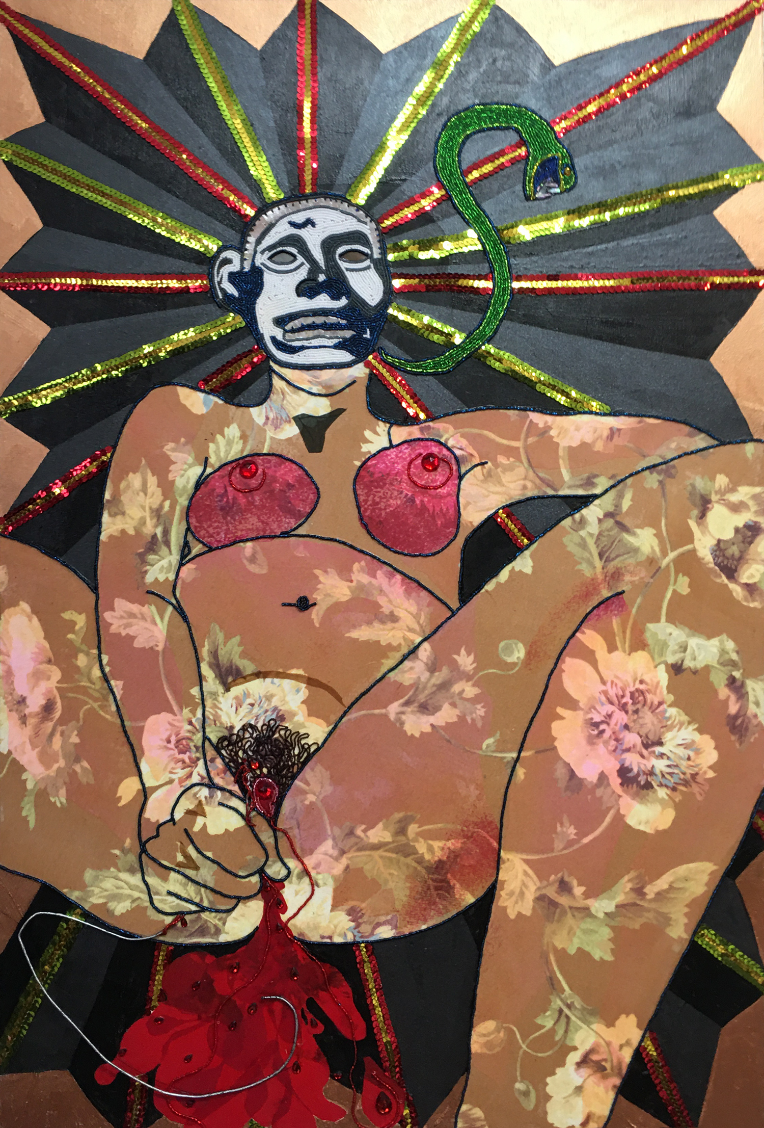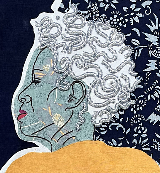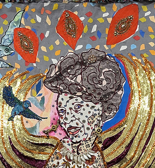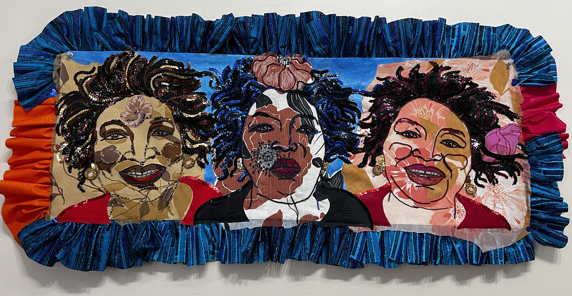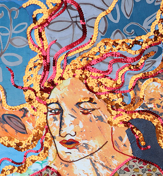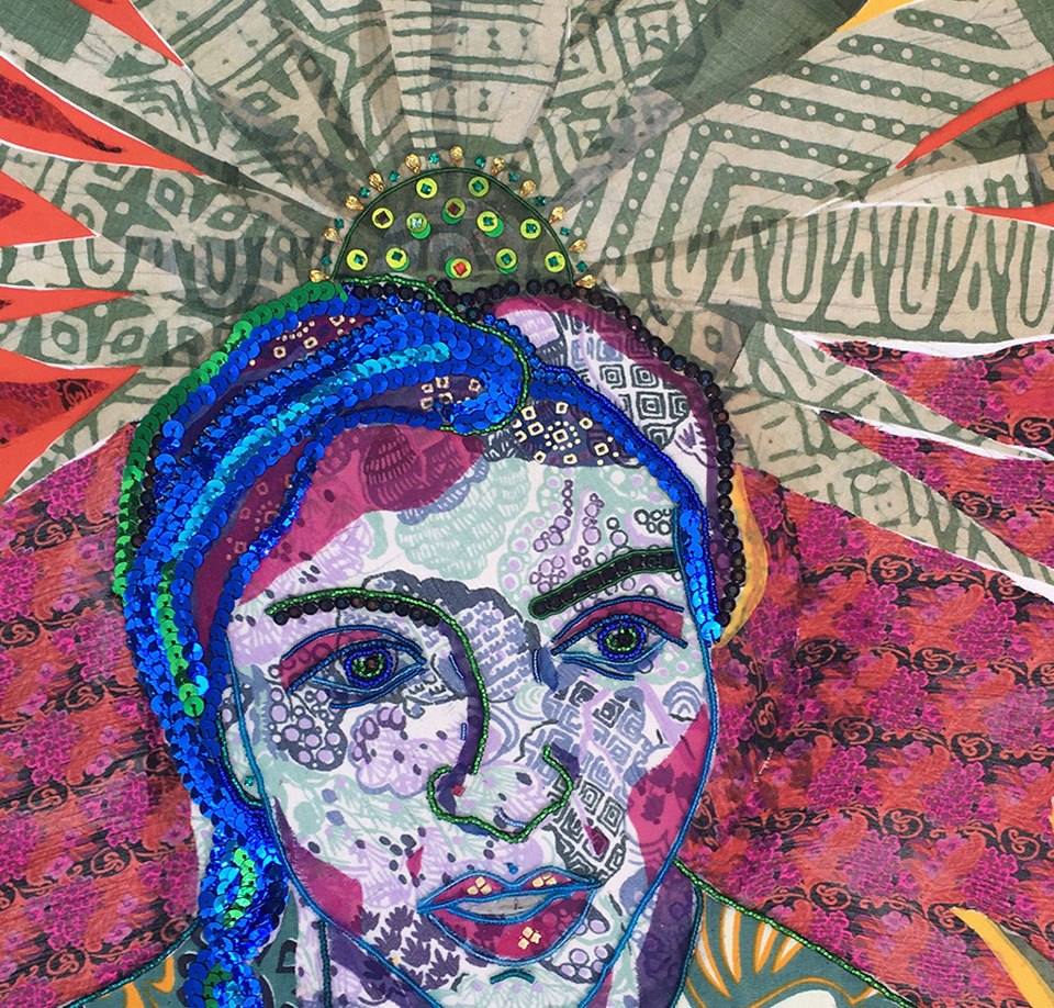 Protectors of the Women, 21″ X 41″, oval, fabric, beads, sequins, acrylics on panelDouble Edged Blues, 30″ X 42″, fabric, sequins, beads, acrylics on rag paperRitual, 20″ X 16″, fabric, beads, sequins, on rag paperFlora, 20″ X 16″, fabric, beads, sequins, found jewelry and embroidery on rag paperGuardian, 20″ X 14″, fabric, beads, mother of pearl on rag paperRevisiting Joy, 20″ X 16″, fabric, beads on rag paperReflection, 12″ X 9″, fabric, beads on wood panelThe Four Graces, 42″ X 30″, fabric, beads, sequins, mother of pearl, abalone on rag paperHow the Wind Blows, 30″ X 42″, fabric, beads, sequins on rag paperIt’s Getting Biblical, 30″ X 42″, fabric, beads, sequins acrylics on rag paper