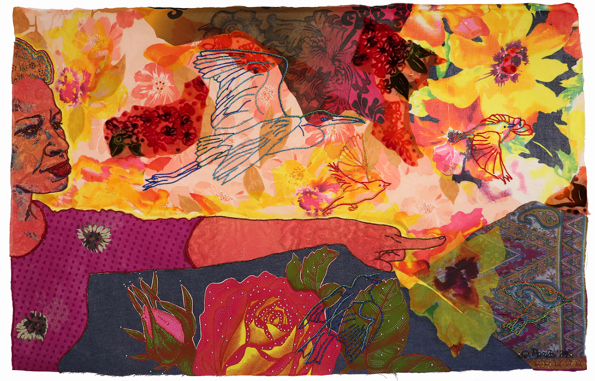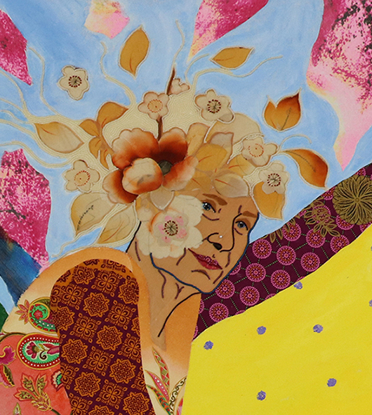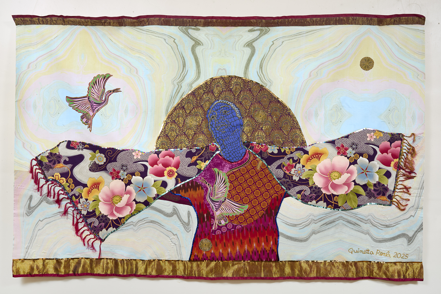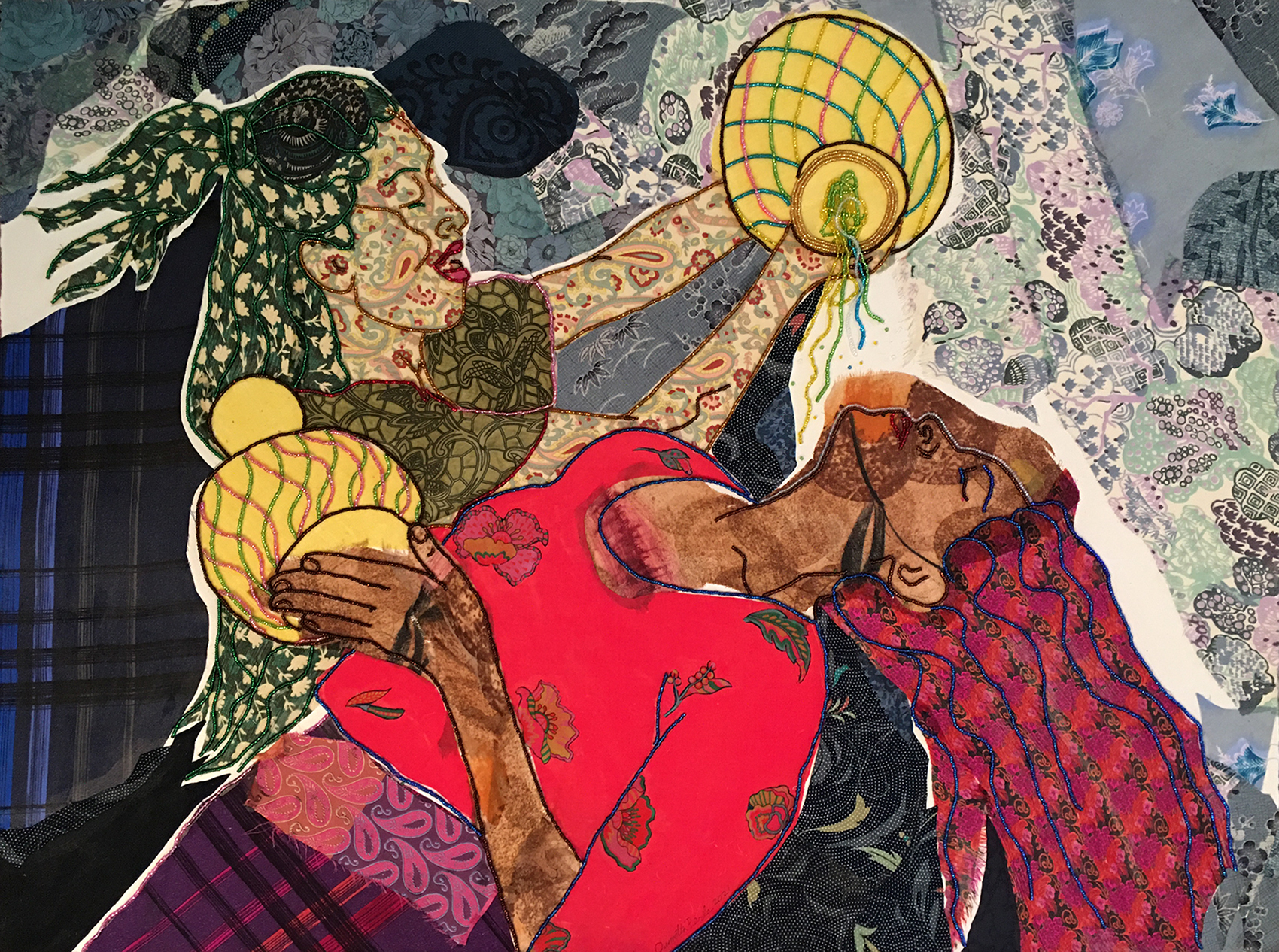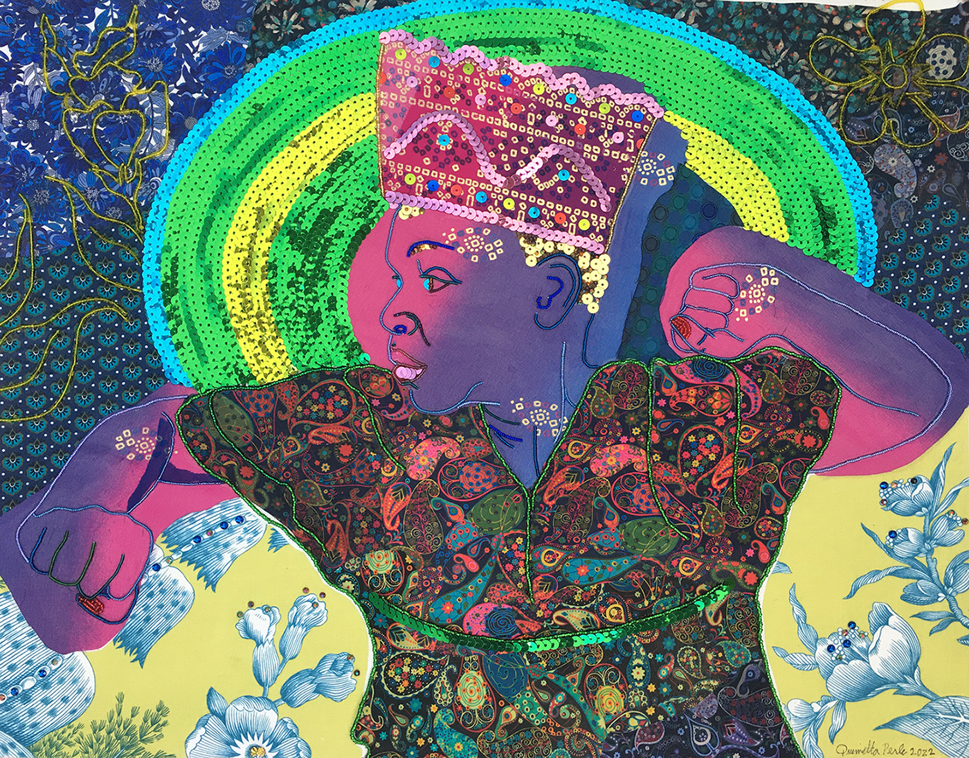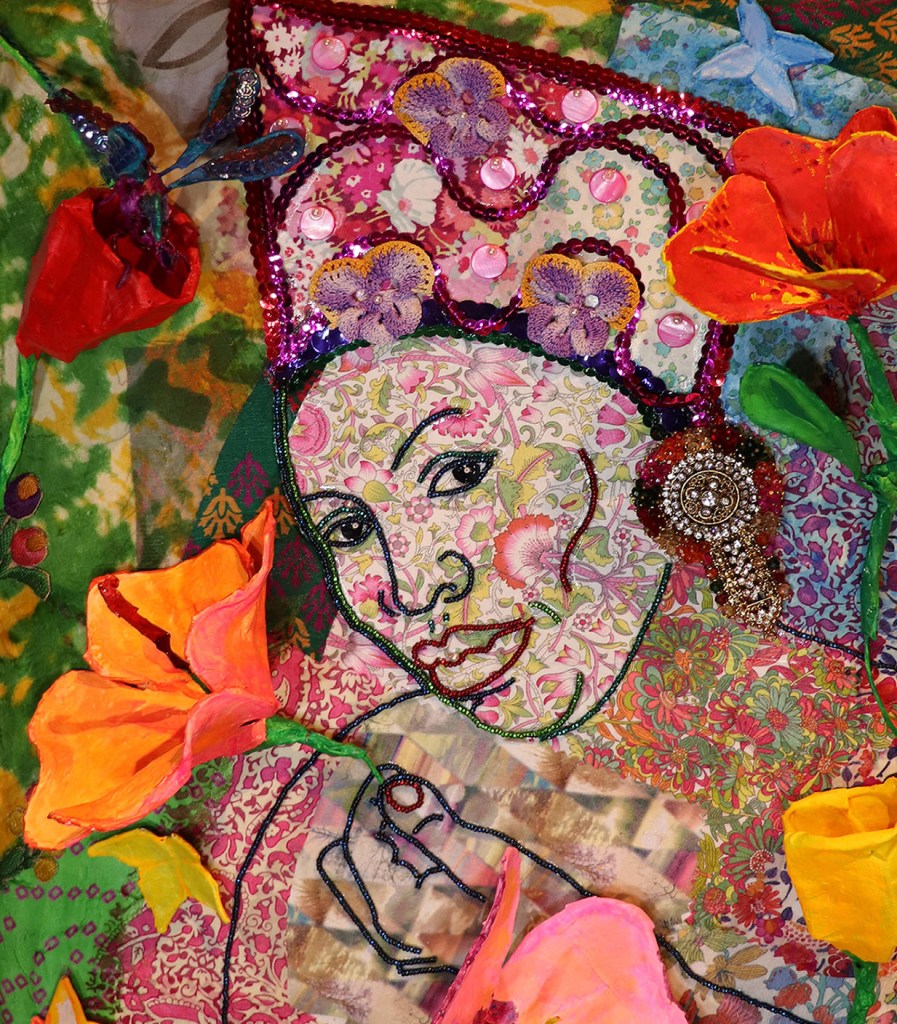 Protectors of the Women, 21″ X 41″, oval, fabric, beads, sequins, acrylics on panelDouble Edged Blues, 30″ X 42″, fabric, sequins, beads, acrylics on rag paperRitual, 20″ X 16″, fabric, beads, sequins, on rag paperFlora, 20″ X 16″, fabric, beads, sequins, found jewelry and embroidery on rag paperGuardian, 20″ X 14″, fabric, beads, mother of pearl on rag paperRevisiting Joy, 20″ X 16″, fabric, beads on rag paperReflection, 12″ X 9″, fabric, beads on wood panelThe Four Graces, 42″ X 30″, fabric, beads, sequins, mother of pearl, abalone on rag paperHow the Wind Blows, 30″ X 42″, fabric, beads, sequins on rag paperIt’s Getting Biblical, 30″ X 42″, fabric, beads, sequins acrylics on rag paper