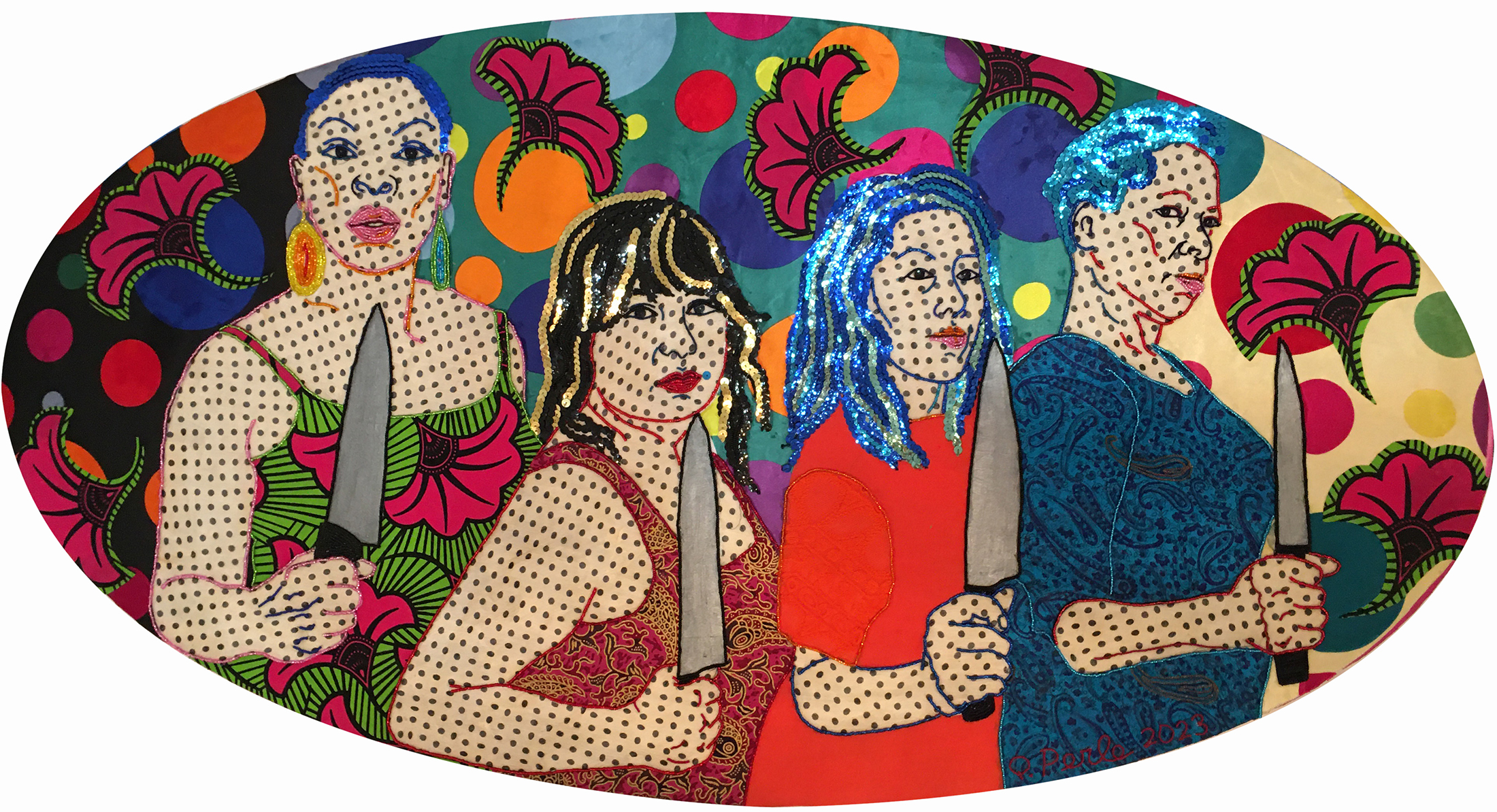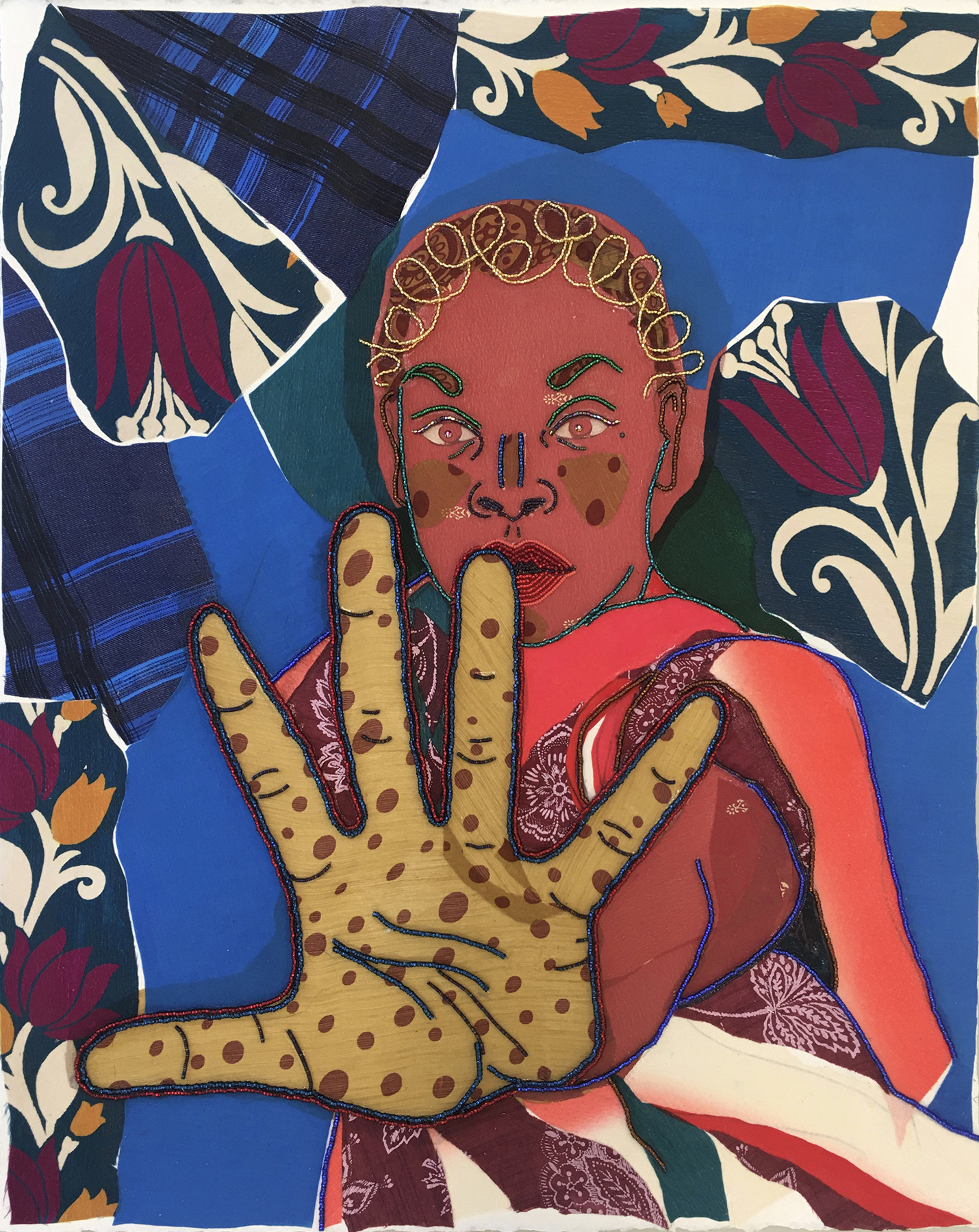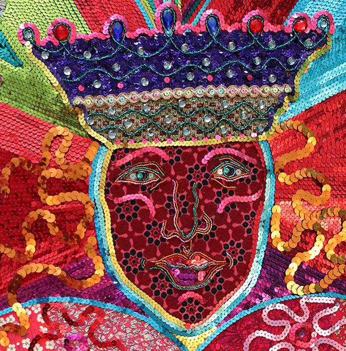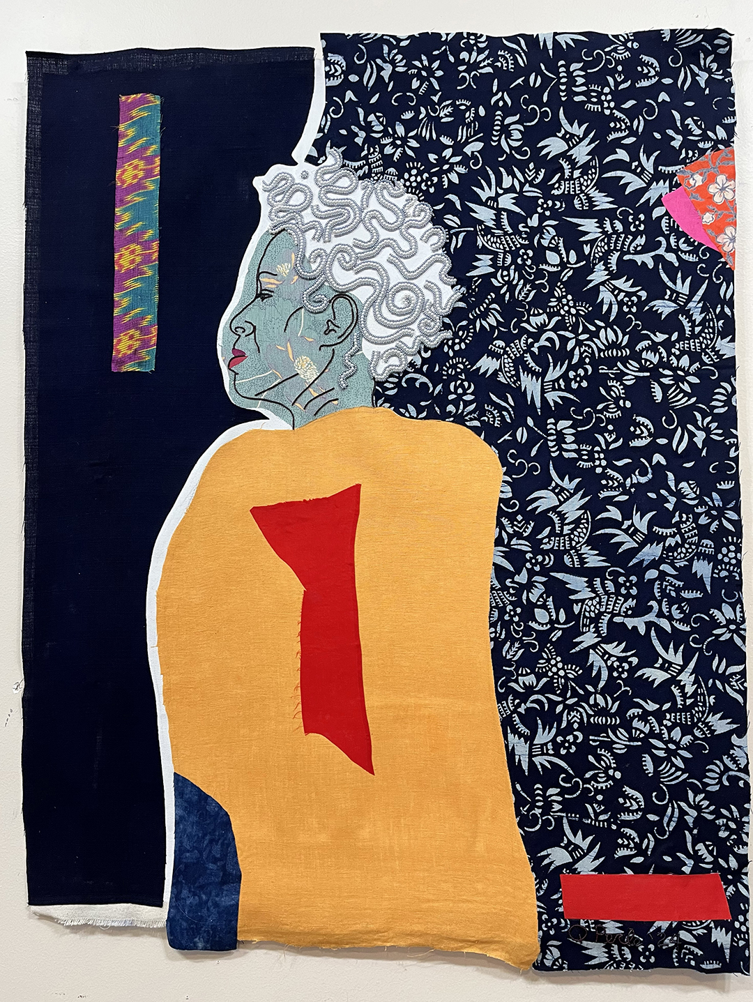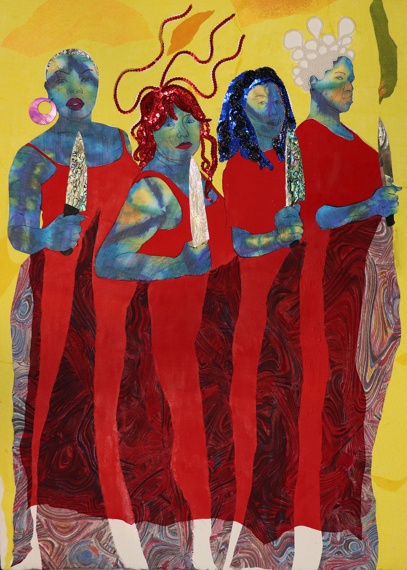 Protectors of the Women, 21″ X 41″, oval, fabric, beads, sequins, acrylics on panelDouble Edged Blues, 30″ X 42″, fabric, sequins, beads, acrylics on rag paperRitual, 20″ X 16″, fabric, beads, sequins, on rag paperFlora, 20″ X 16″, fabric, beads, sequins, found jewelry and embroidery on rag paperGuardian, 20″ X 14″, fabric, beads, mother of pearl on rag paperRevisiting Joy, 20″ X 16″, fabric, beads on rag paperReflection, 12″ X 9″, fabric, beads on wood panelThe Four Graces, 42″ X 30″, fabric, beads, sequins, mother of pearl, abalone on rag paperHow the Wind Blows, 30″ X 42″, fabric, beads, sequins on rag paperIt’s Getting Biblical, 30″ X 42″, fabric, beads, sequins acrylics on rag paper