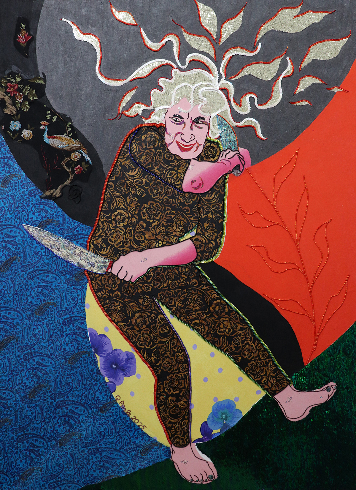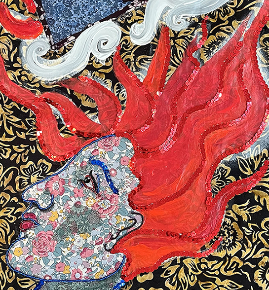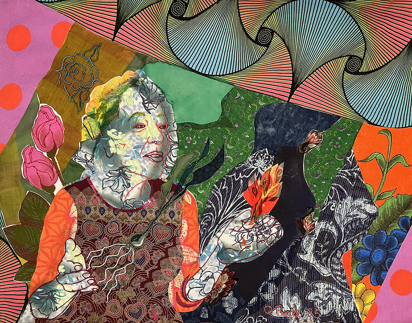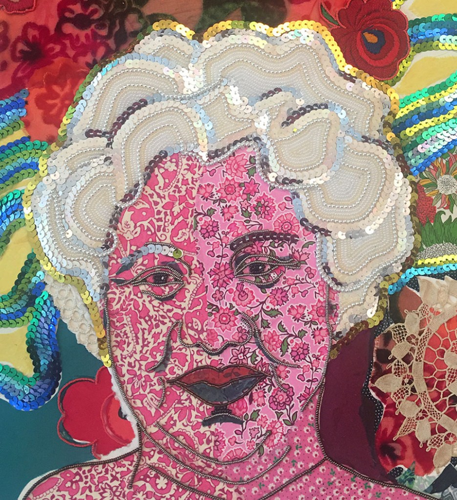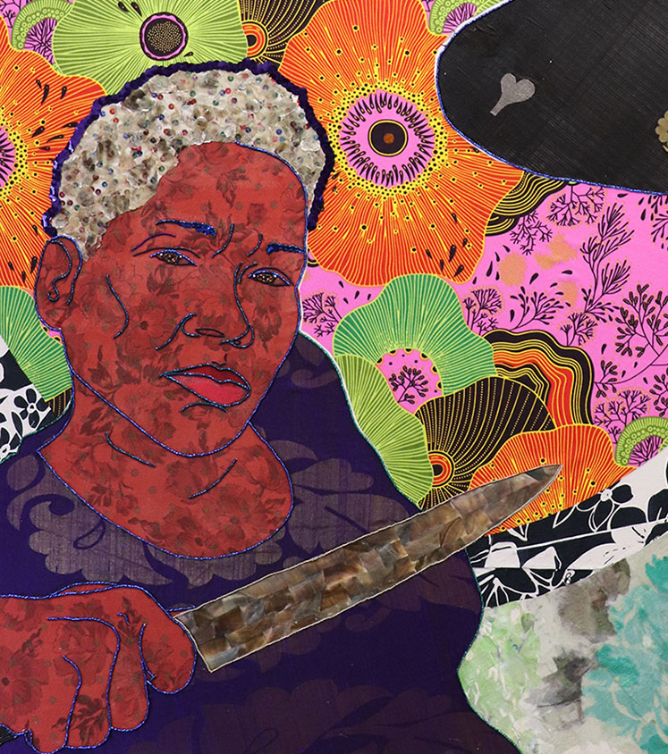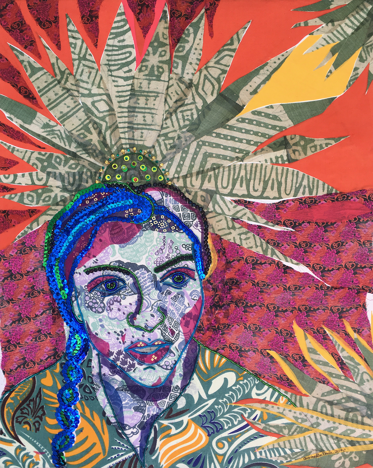 Protectors of the Women, 21″ X 41″, oval, fabric, beads, sequins, acrylics on panelDouble Edged Blues, 30″ X 42″, fabric, sequins, beads, acrylics on rag paperRitual, 20″ X 16″, fabric, beads, sequins, on rag paperFlora, 20″ X 16″, fabric, beads, sequins, found jewelry and embroidery on rag paperGuardian, 20″ X 14″, fabric, beads, mother of pearl on rag paperRevisiting Joy, 20″ X 16″, fabric, beads on rag paperReflection, 12″ X 9″, fabric, beads on wood panelThe Four Graces, 42″ X 30″, fabric, beads, sequins, mother of pearl, abalone on rag paperHow the Wind Blows, 30″ X 42″, fabric, beads, sequins on rag paperIt’s Getting Biblical, 30″ X 42″, fabric, beads, sequins acrylics on rag paper