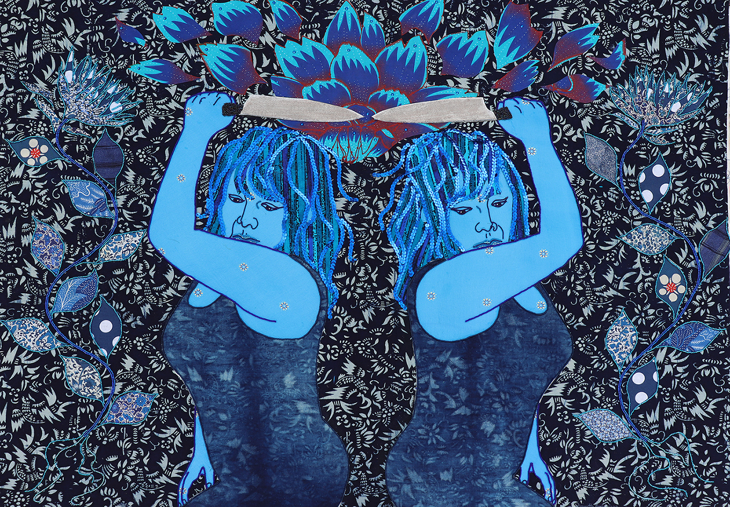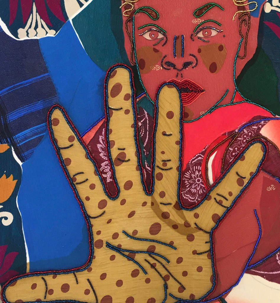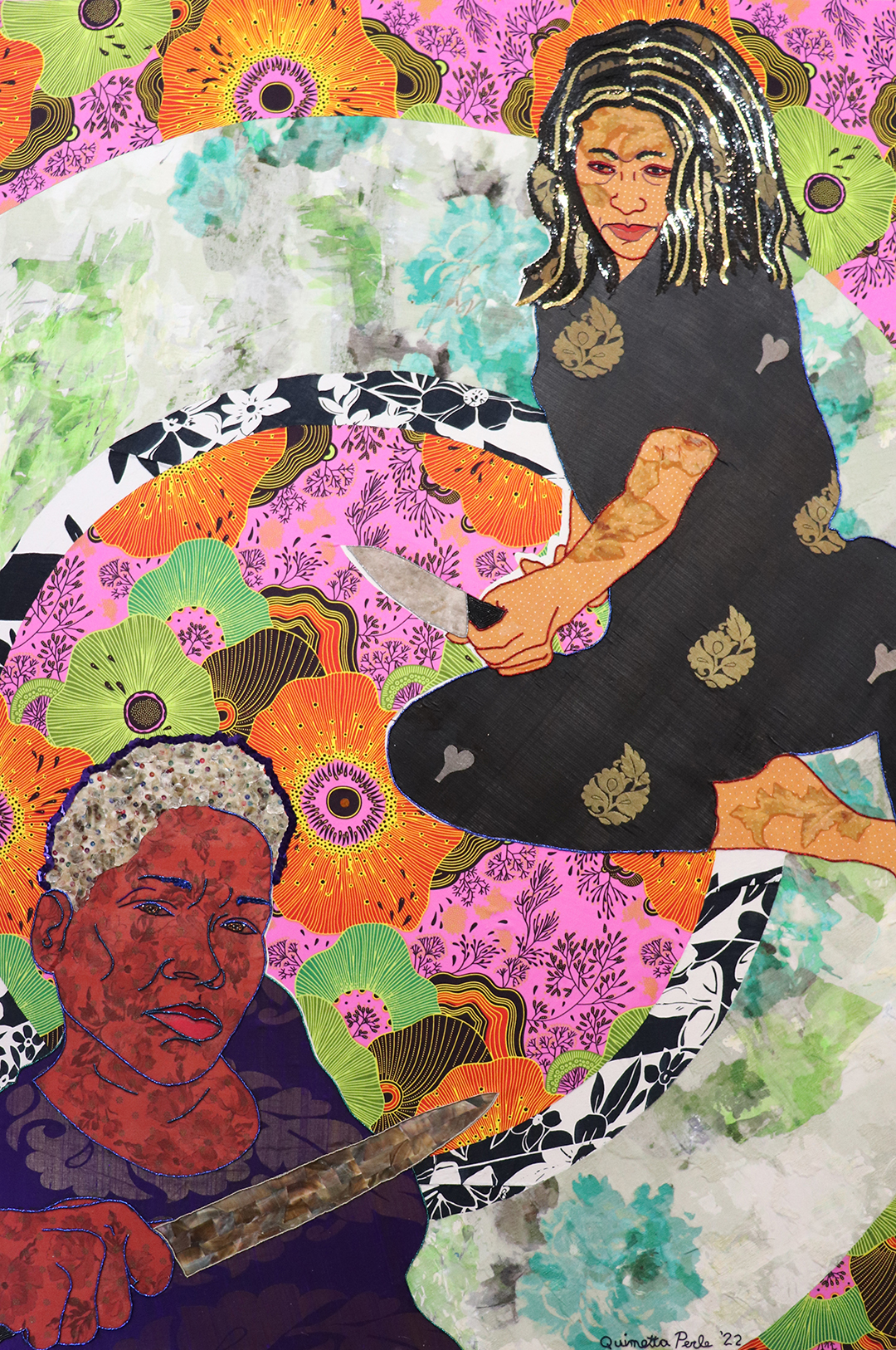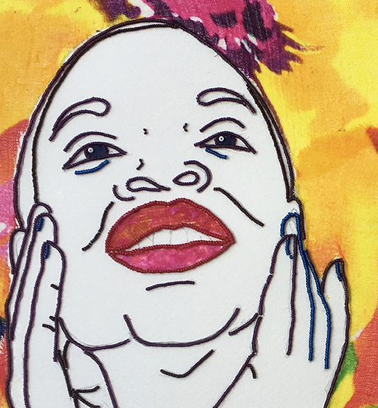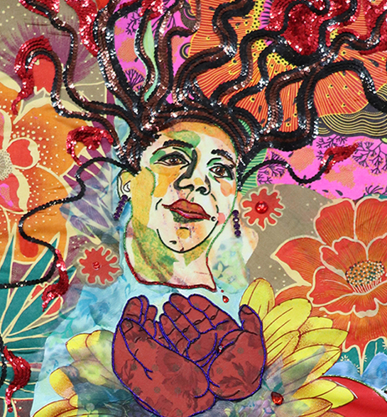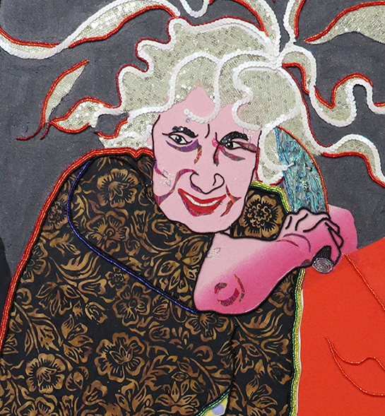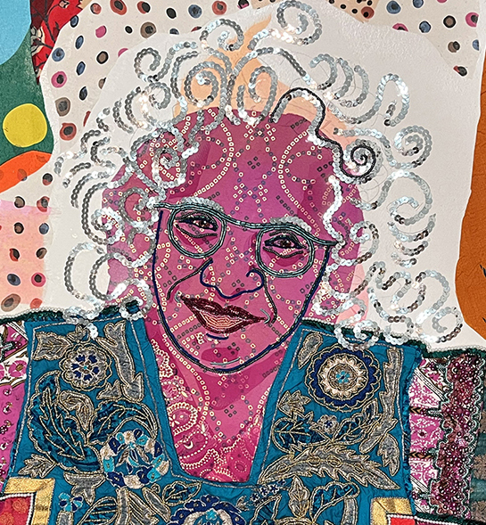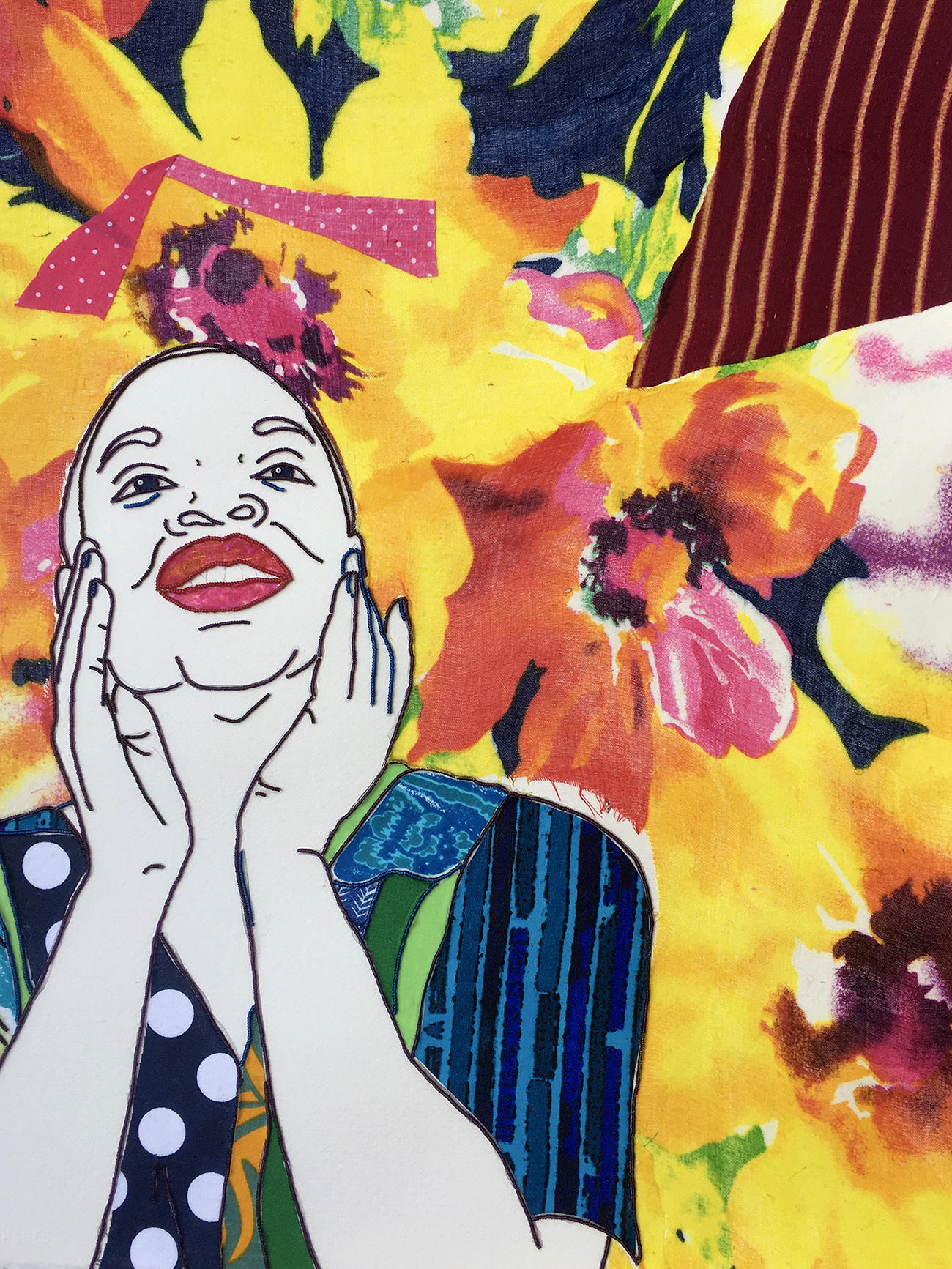 Protectors of the Women, 21″ X 41″, oval, fabric, beads, sequins, acrylics on panelDouble Edged Blues, 30″ X 42″, fabric, sequins, beads, acrylics on rag paperRitual, 20″ X 16″, fabric, beads, sequins, on rag paperFlora, 20″ X 16″, fabric, beads, sequins, found jewelry and embroidery on rag paperGuardian, 20″ X 14″, fabric, beads, mother of pearl on rag paperRevisiting Joy, 20″ X 16″, fabric, beads on rag paperReflection, 12″ X 9″, fabric, beads on wood panelThe Four Graces, 42″ X 30″, fabric, beads, sequins, mother of pearl, abalone on rag paperHow the Wind Blows, 30″ X 42″, fabric, beads, sequins on rag paperIt’s Getting Biblical, 30″ X 42″, fabric, beads, sequins acrylics on rag paper