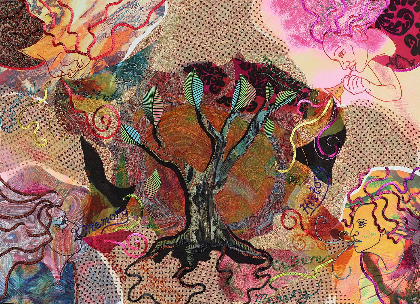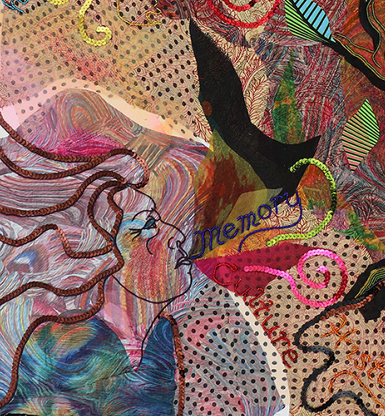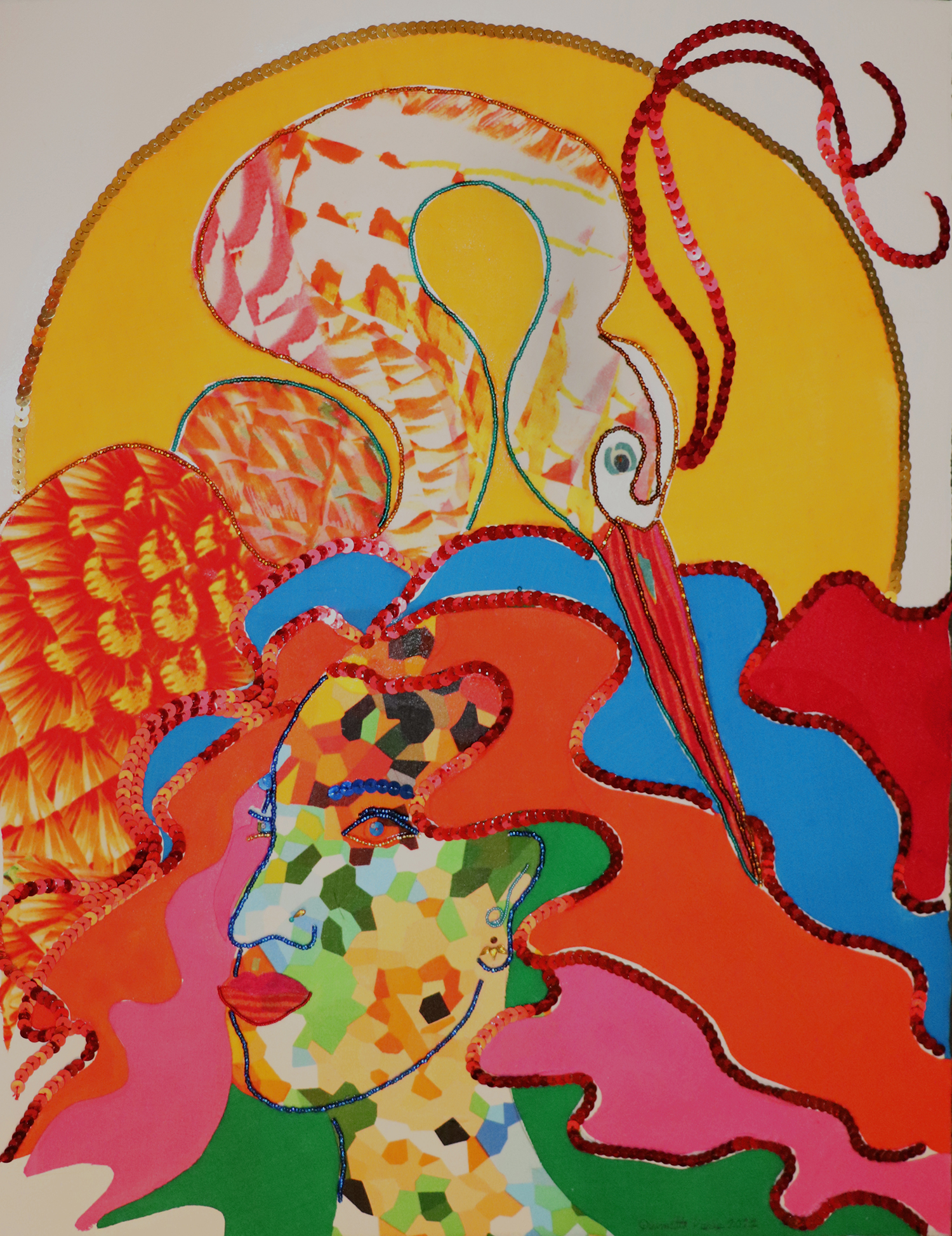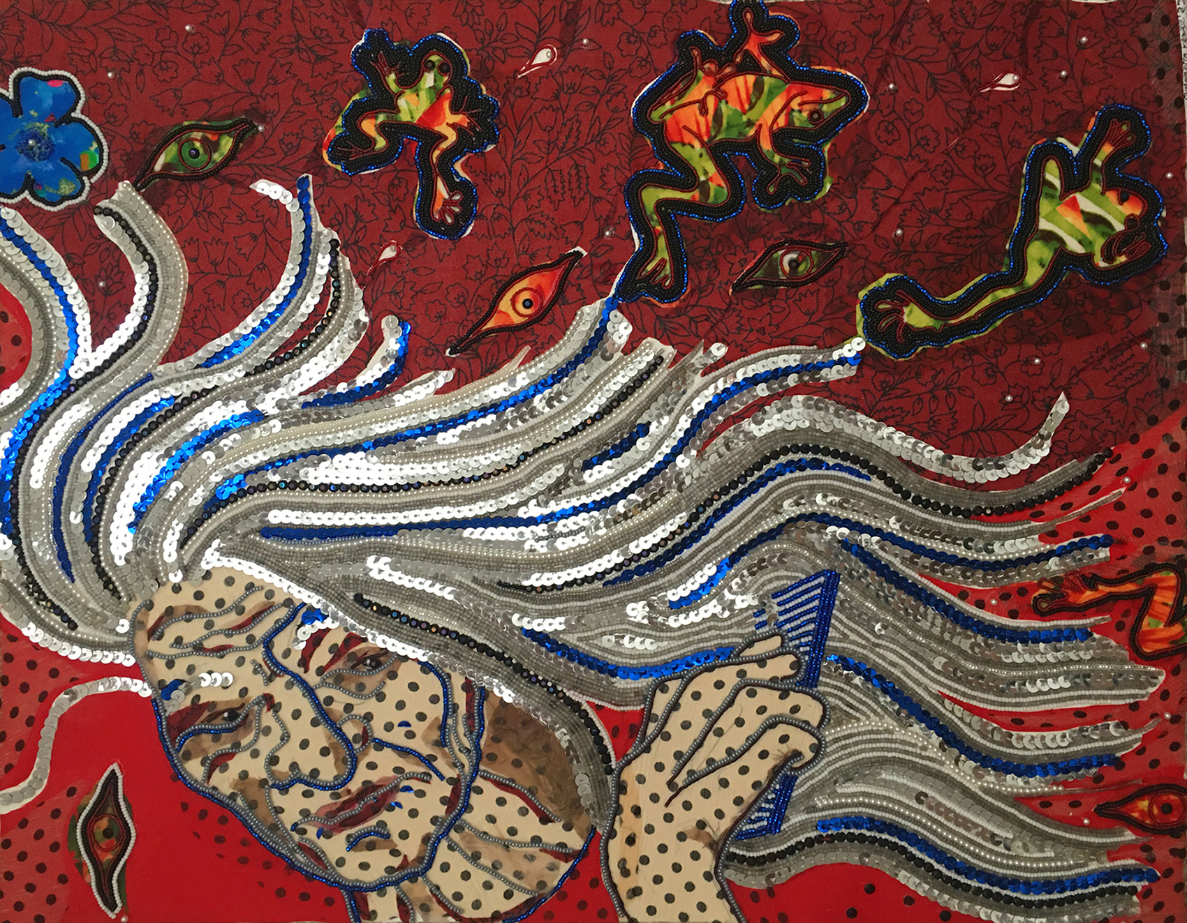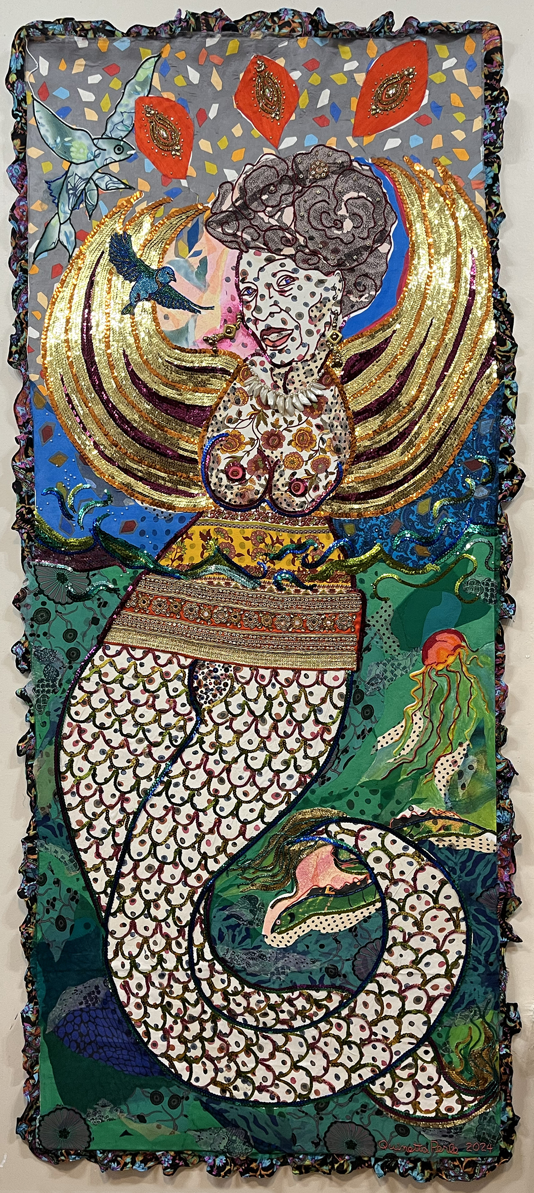 The Angel of Death Passes Over, 20″ X 16″, fabric, beads, sequins, rhinestones on rag paperMemory of Wind and Water, 20″ X 16″, fabric, beads, sequins, crochet on rag paperShe Combs Her Hair 1, 16″ X 20″, fabric, beads, sequins on rag paperShe COmbs Her Hair 2, 16″ X 20″, fabrics, beads,sequins on rag paperFight Back, 16″ X 20″, fabric, beads, sequins on rag paperFirebird, 20″ X 16″, fabric, beads, sequins on rag paperPalmetto Crown, 20″ X 16″, fabric, beads, sequins on rag paperShe Dips Her Toe, 20″ X 16″, fabric, beads,sequins on rag paperAnd We Say No, 60″ X 40″, fabric, beads, sequins, mica, mother of pearl on canvasArchipelago, 30″ X 42″, fabric, beads, sequins on rag paperCoatlique’s Abortion, 36″ X 24″, Fabric, beads, sequins, coat hanger wire, rhinestones on wood panelDamsel Fly, 20″ X 16″, fabric, beads, sequins, paper mache, crochet, acrylic, found jewelry on panel