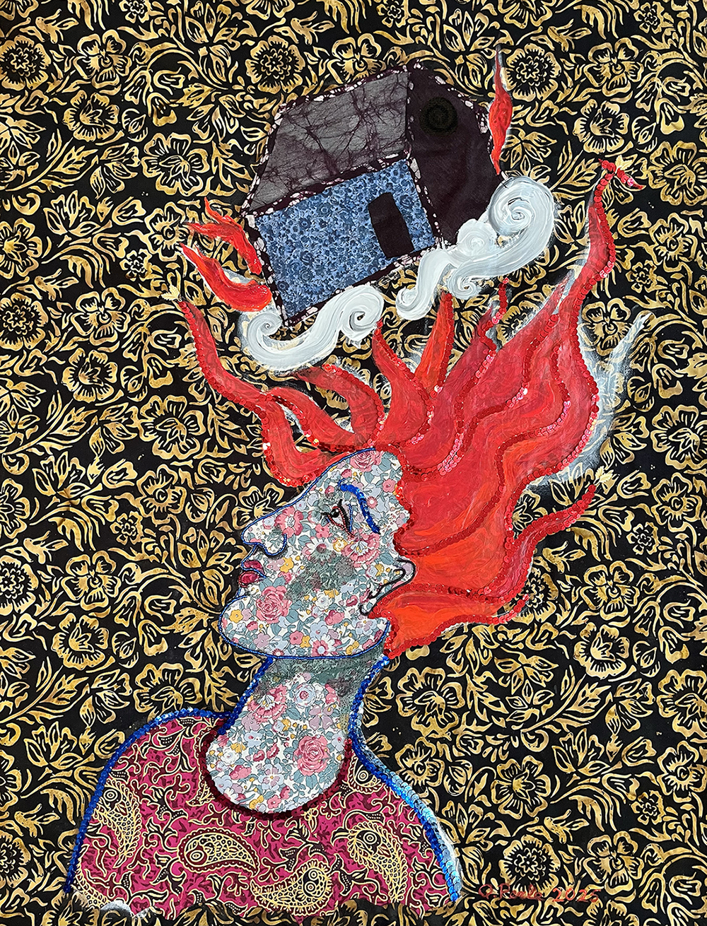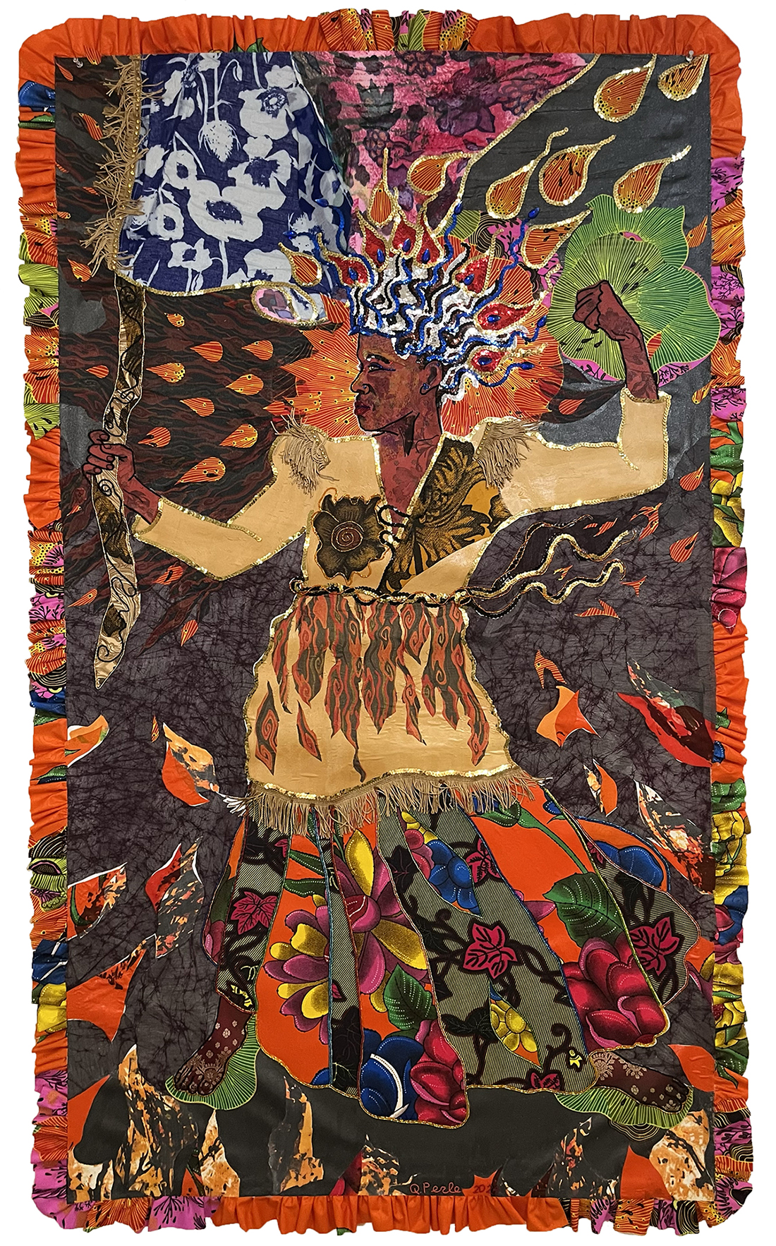 Stacey Speaks, 19″ X 41″, fabric, sequins, beads on primed, unstretched canvasKnife Dancer, 48″ X 36″, fabric, sequins, beads, abalone, acrylics on primed, unstretched canvasRelease the Magic, 27″ X 35″, fabric, beads, sequins on primed, unstretched canvasFlying. She’s a Rainbow, 30″ X 60″, fabric, beads, sequins on primed, unstretched canvasRev. Rhonda Spreads Her Wings, 44″ X 63″, fabric, beads, sequins on primed, unstretched canvasHugging Herself, 20″ X 16″, fabric, beads, sequins on rag paperHouse on Fire, 31″ X 21″, fabric, beads, sequins, acrylics on cotton