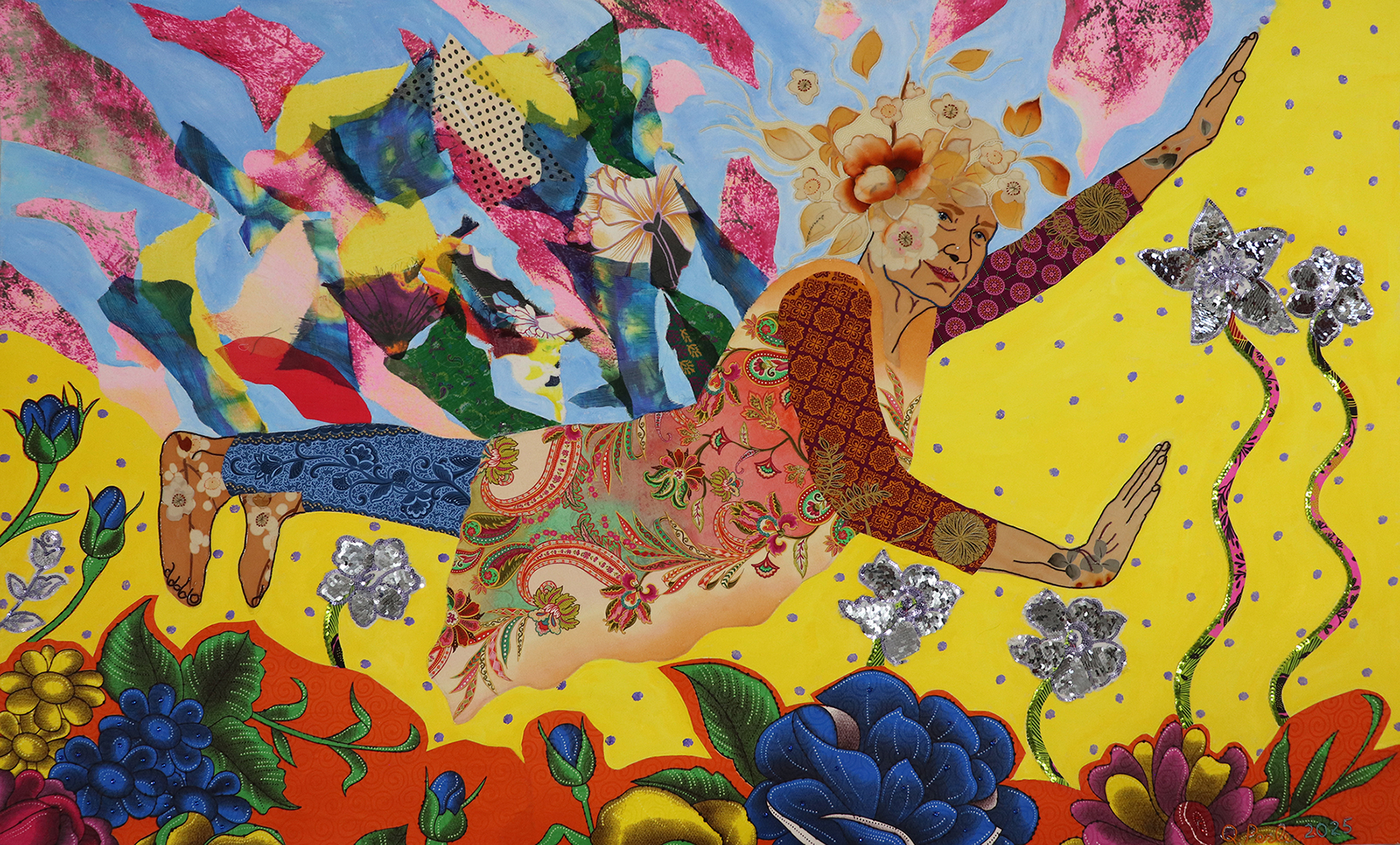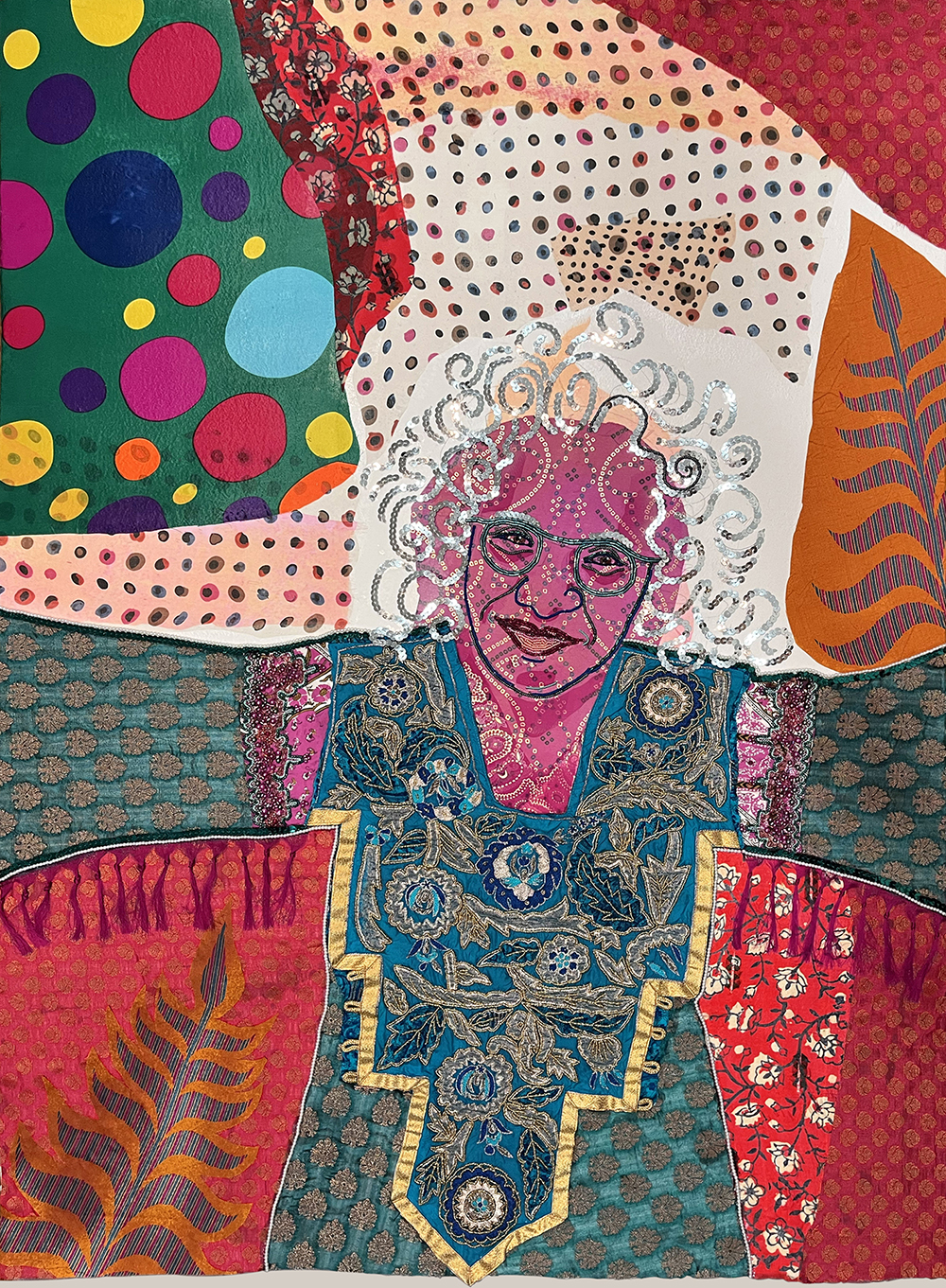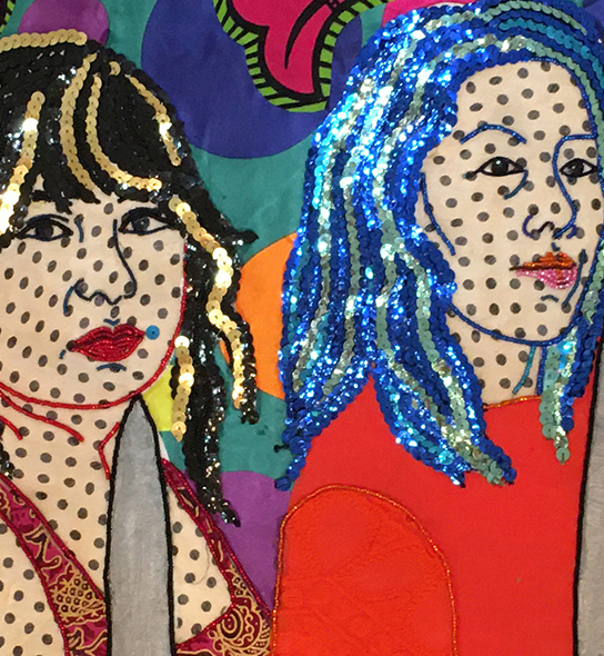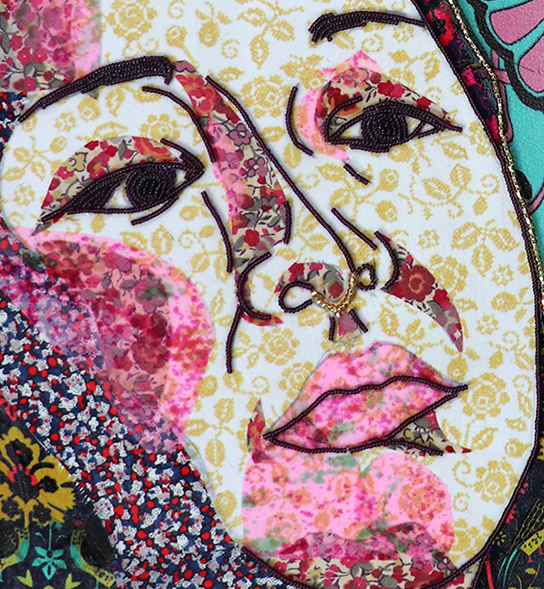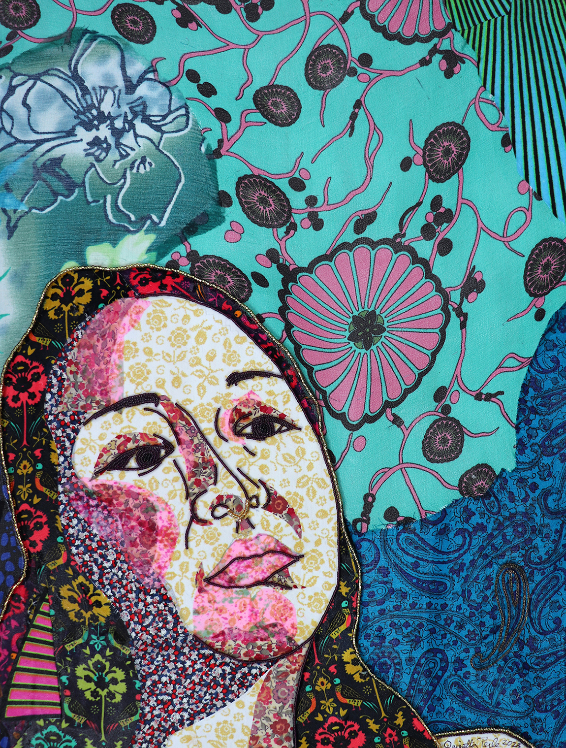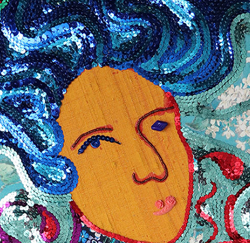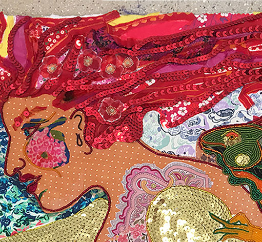Mermaid and Creature of the Sea and Air, 75″ X 33″, fabric, beads, sequins, acrylics, found jewelry on primed, unstretched canvasLiberty, 63″ X 36″, fabric, sequins, beads, acrylics on primed, unstretched canvasAsma and the Birds, 30″ X 44″, fabric and beads on muslin Witness (for Shazia Sikander) 60″ X 34″, fabric, beads, sequins, found jewelry, acrylics on primed, unstretched canvasHuipil, 42″ X 30″, fabric, beads, sequins on rag paperSalwar Kameez, 63″ X 36″, fabric, sequins, beads, acrylics on primed, unstretched canvasHouse of Memories, 31″ X 24″, fabric, beads, sequins on primed, unstretched canvasAt the Ready, 31″ X 24″, fabric, sequins, beads, abalone, mother of pearl on primed, unstretched canvas