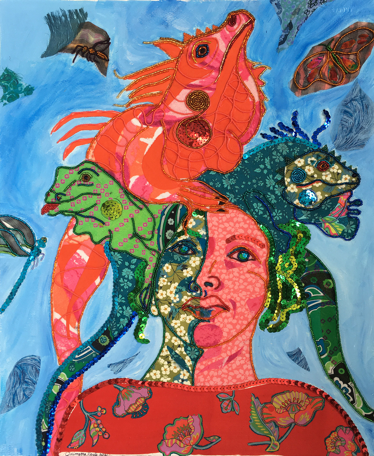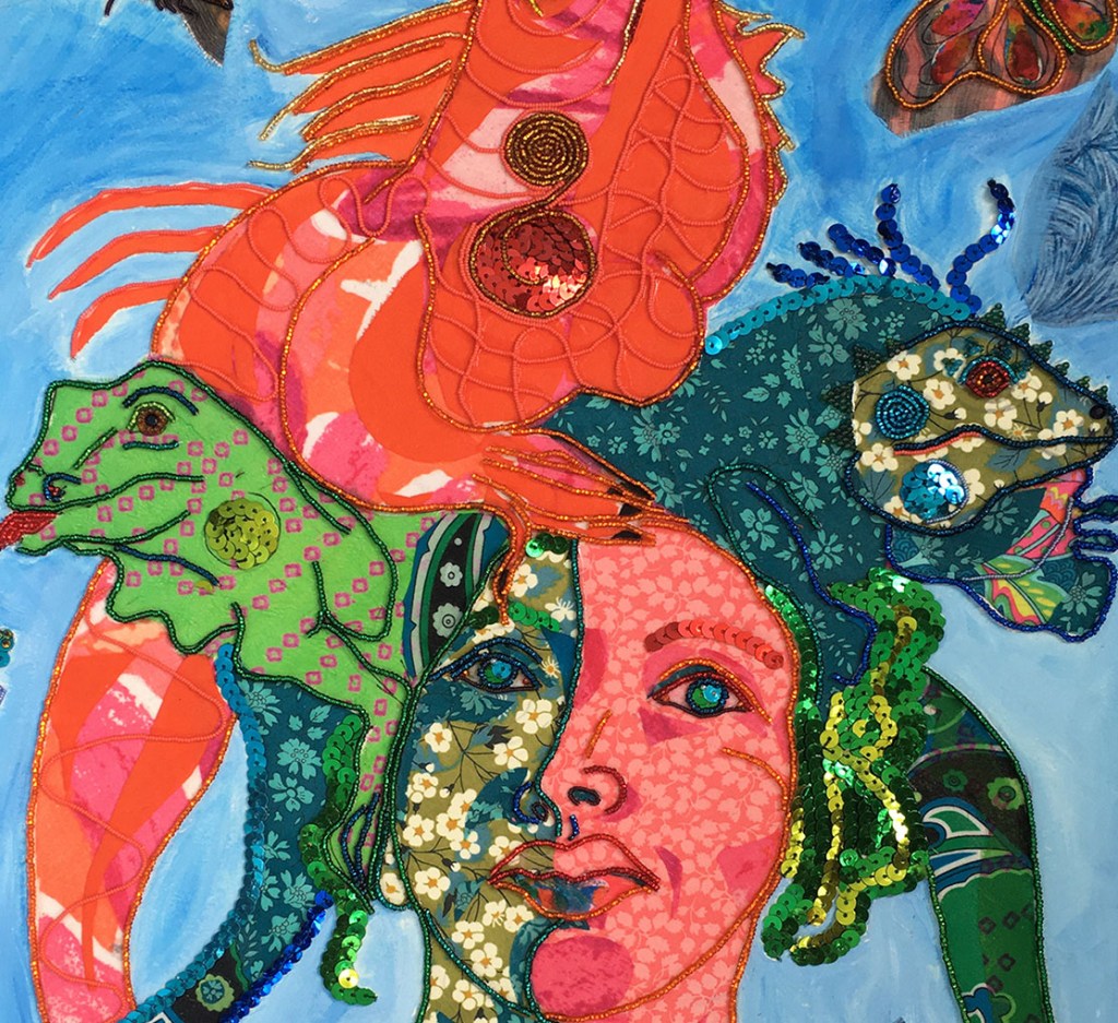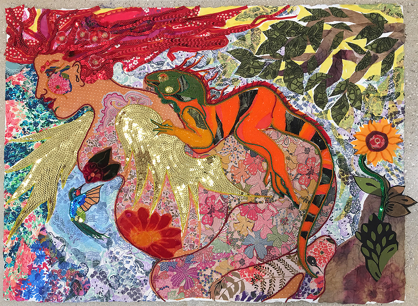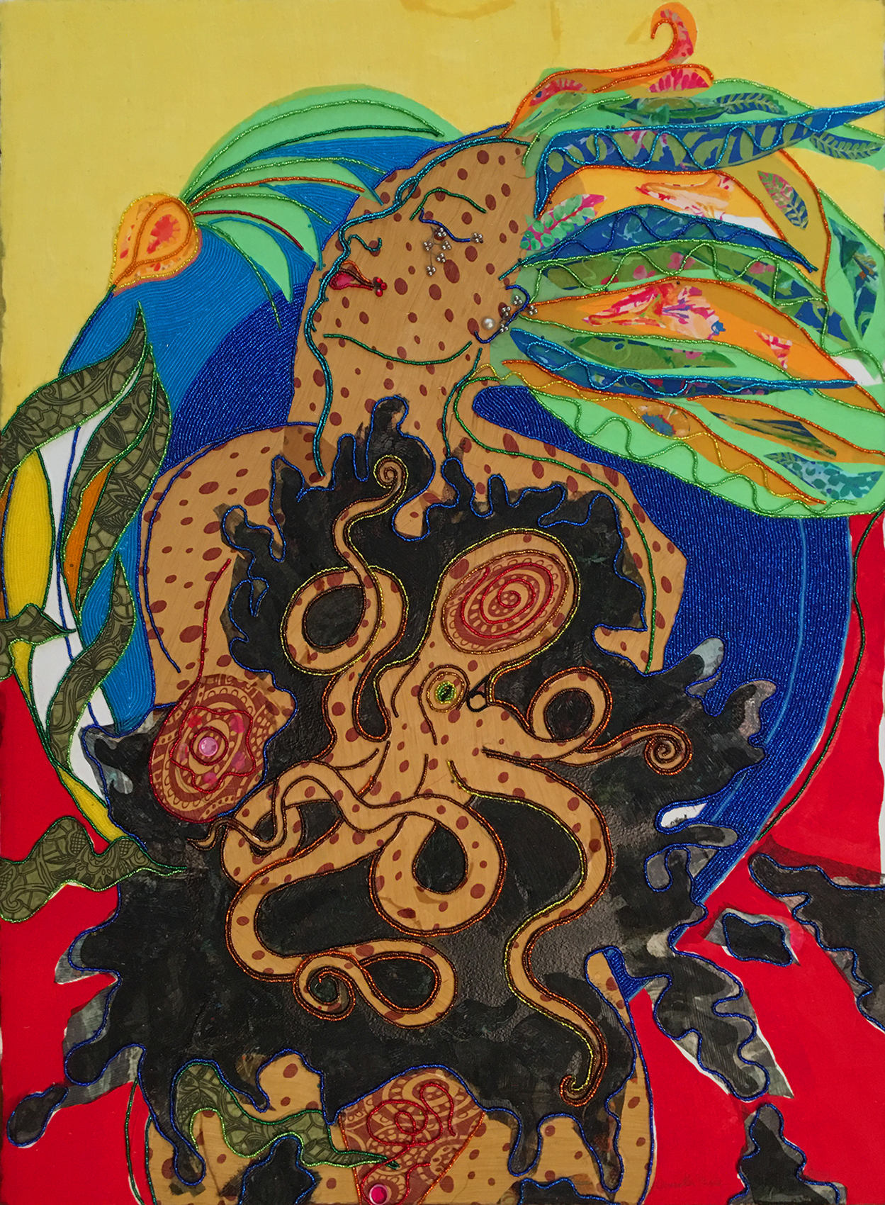 Her Inky Depths, 30″ X 22″, fabric, beads, sequins, acrylics, ink, found jewelryFlow, 22″ X 30″, fabric, beads on rag paperOur Lady of the Beasts, 22″ X 30″, fabric, beads, sequins, acrylics, on rag paperOur Lady of the Iguanas, 20″ X 16″, fabric, beads, sequins, acrylics, on rag paperStop/Reach, 16″ X 20″, fabric, beads, sequins on rag paperHope Springs Eternal, 30″ X 22″, beads, sequins, fabric on rag paper