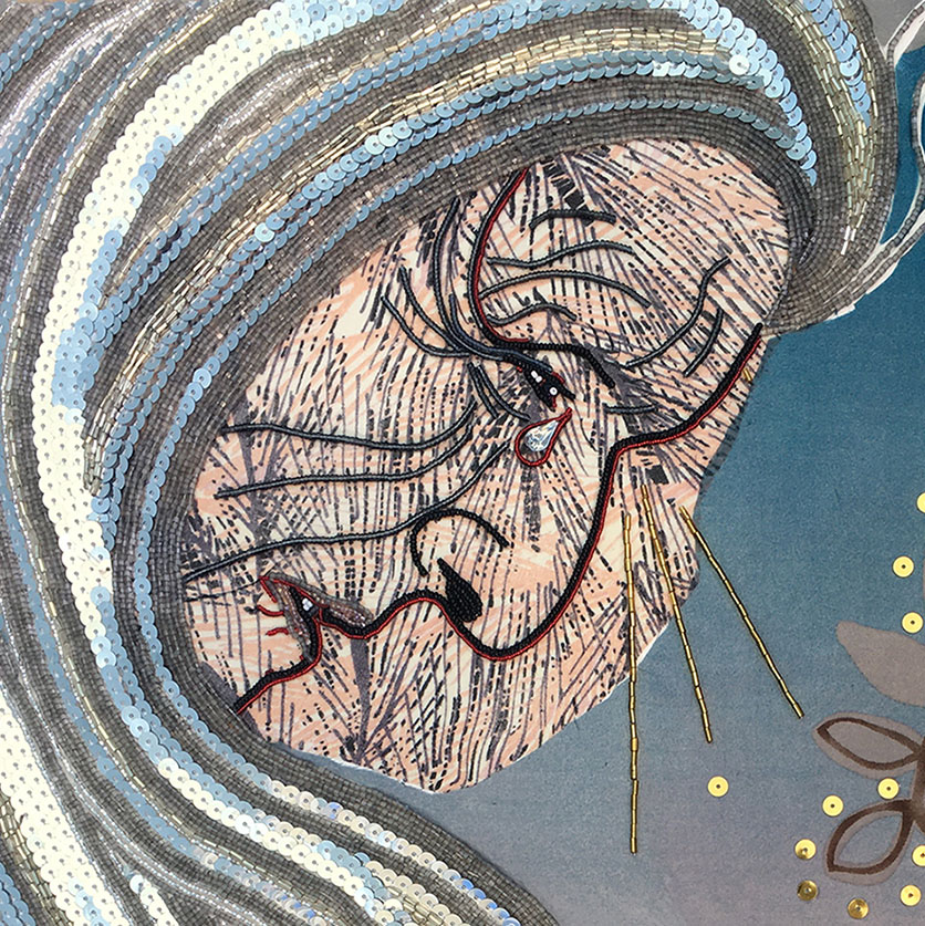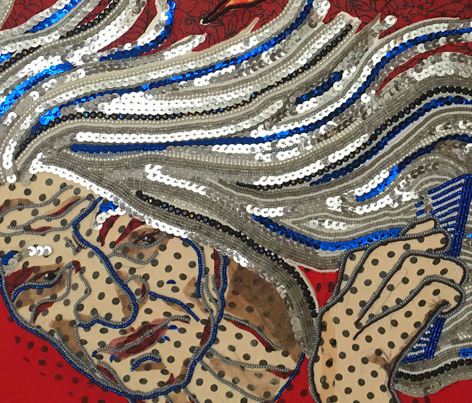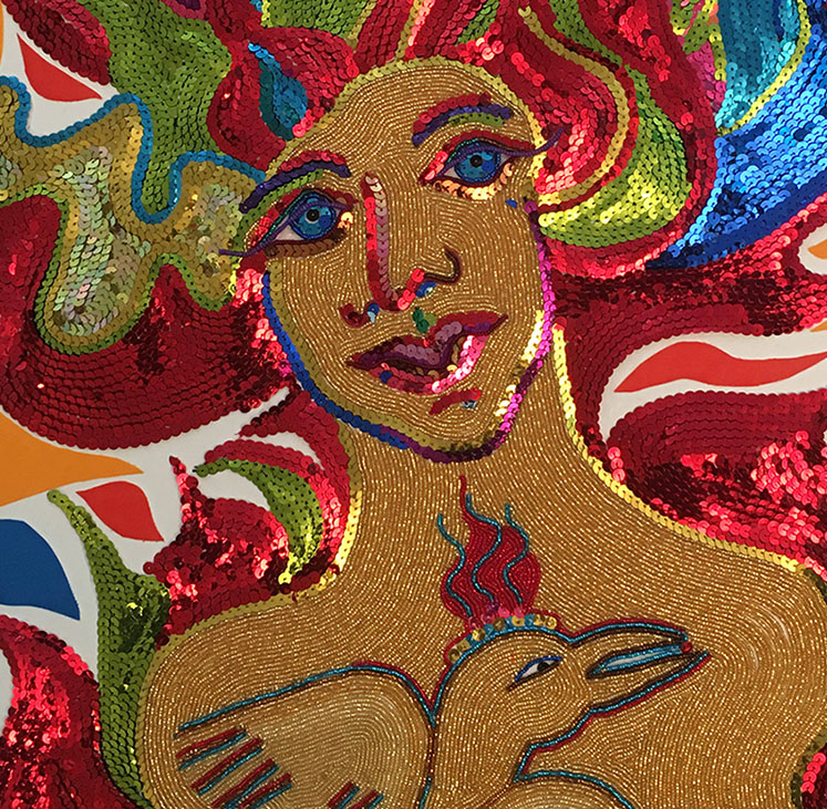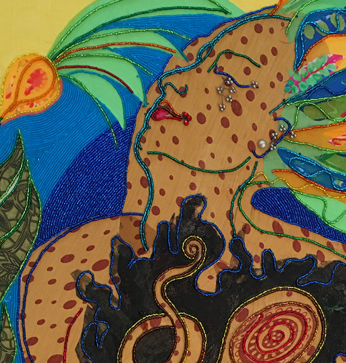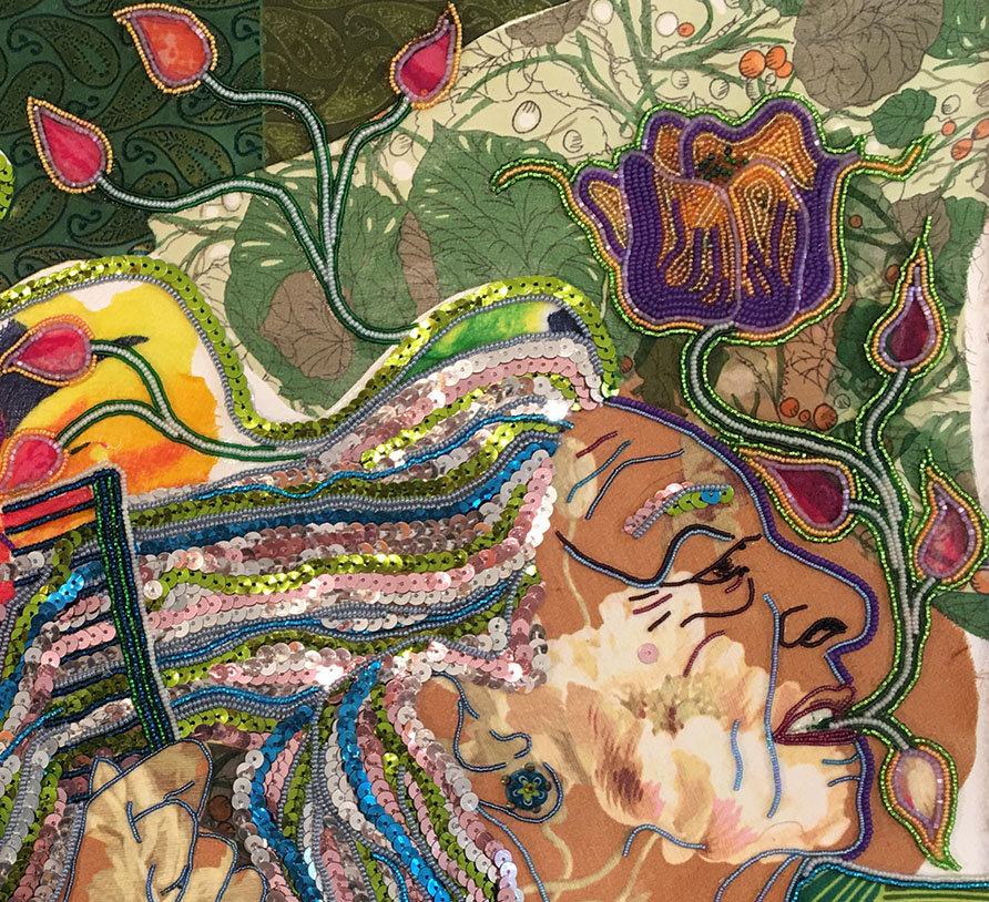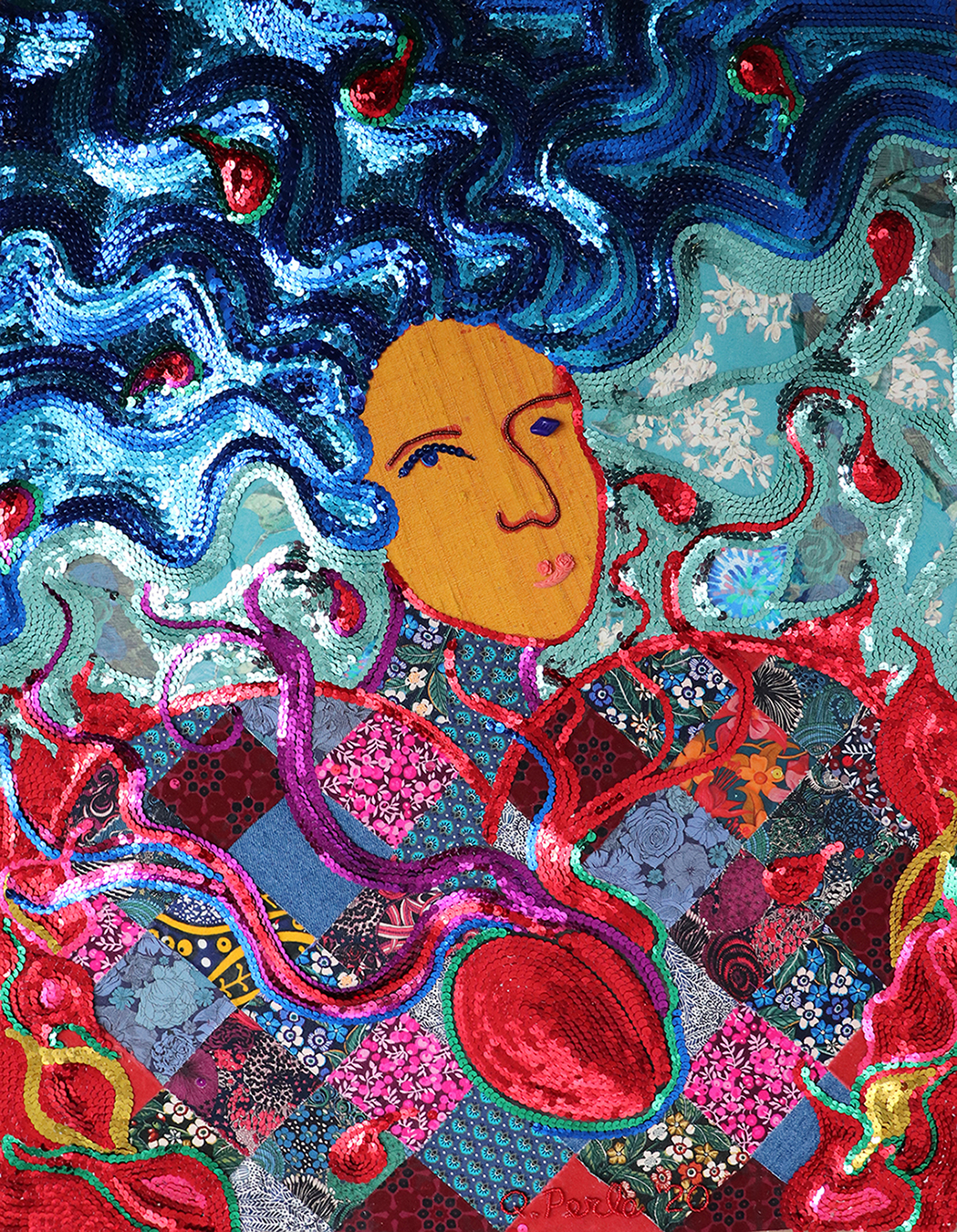 Her Inky Depths, 30″ X 22″, fabric, beads, sequins, acrylics, ink, found jewelryFlow, 22″ X 30″, fabric, beads on rag paperOur Lady of the Beasts, 22″ X 30″, fabric, beads, sequins, acrylics, on rag paperOur Lady of the Iguanas, 20″ X 16″, fabric, beads, sequins, acrylics, on rag paperStop/Reach, 16″ X 20″, fabric, beads, sequins on rag paperHope Springs Eternal, 30″ X 22″, beads, sequins, fabric on rag paper